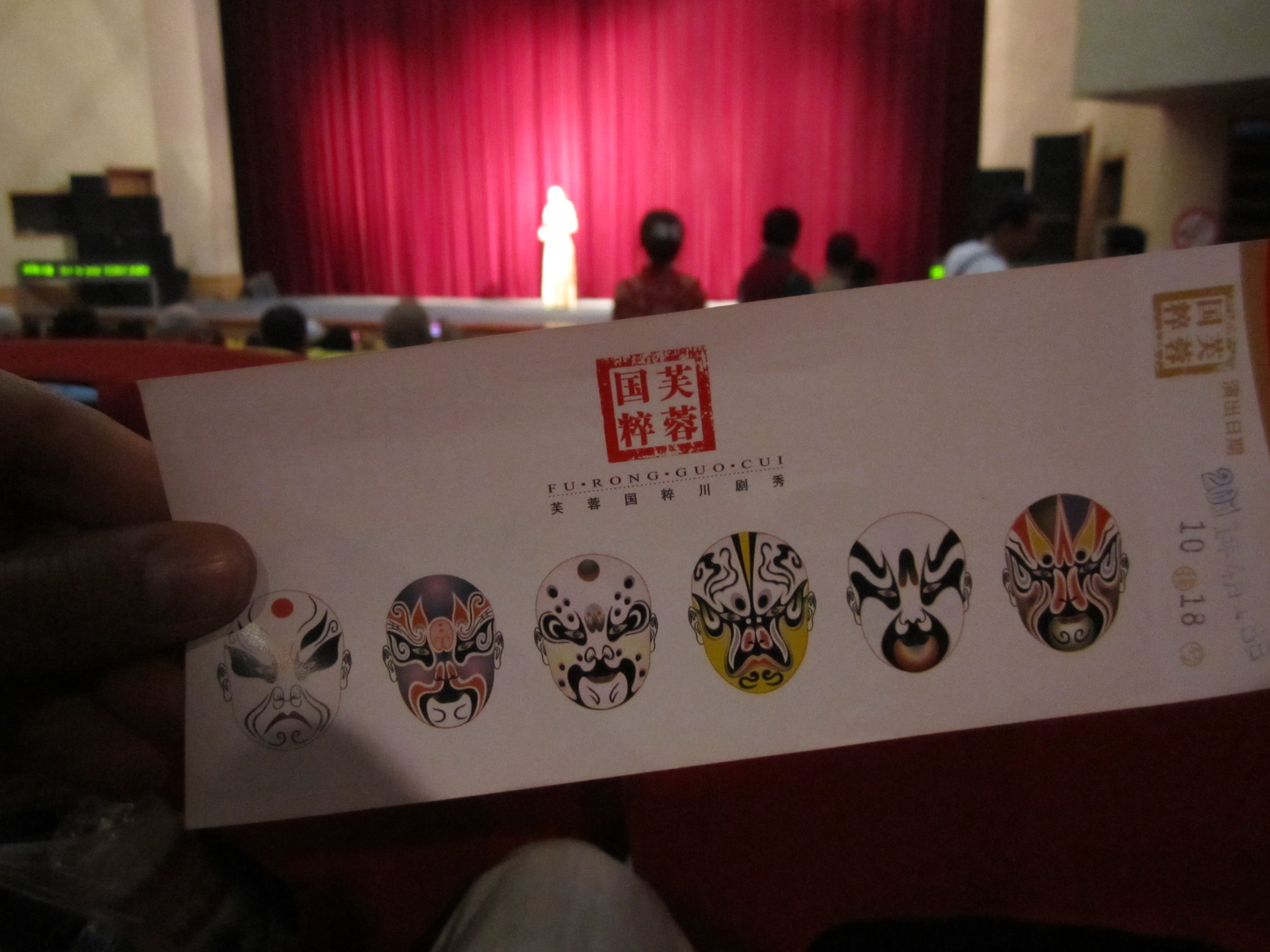 Et pour finir, on est allé voir un spectacle traditionnel. Enfin, surtout pour les touristes vu qu’il n’y avait aucun fil rouge dans les différentes pièces. Des caractères chinois superbement faits, des histoires de combattants, des danses sur des musiques complètement chinoises et techno à outrance, un show de changement de masque en live bluffant … bref, c’était marrant !