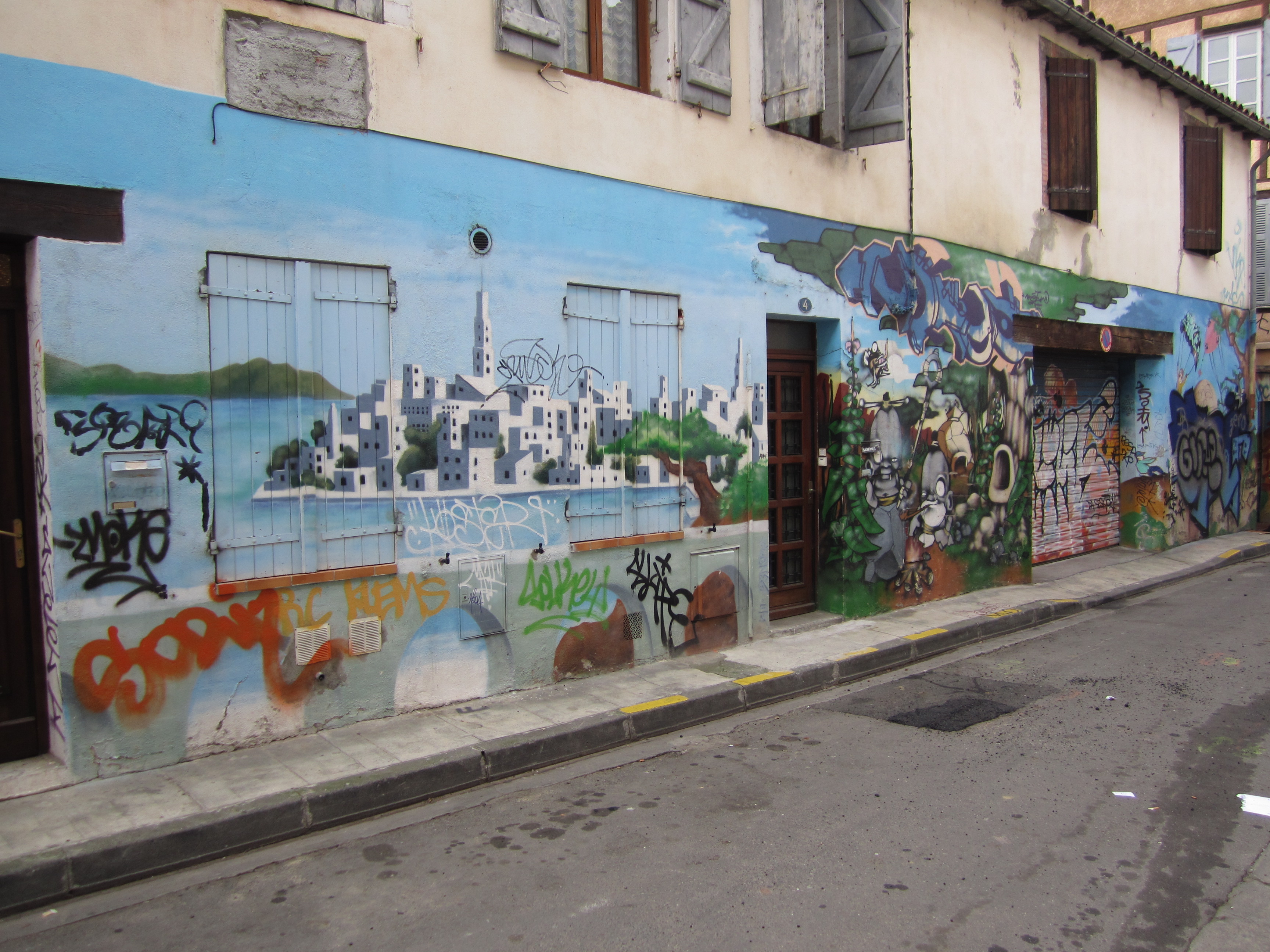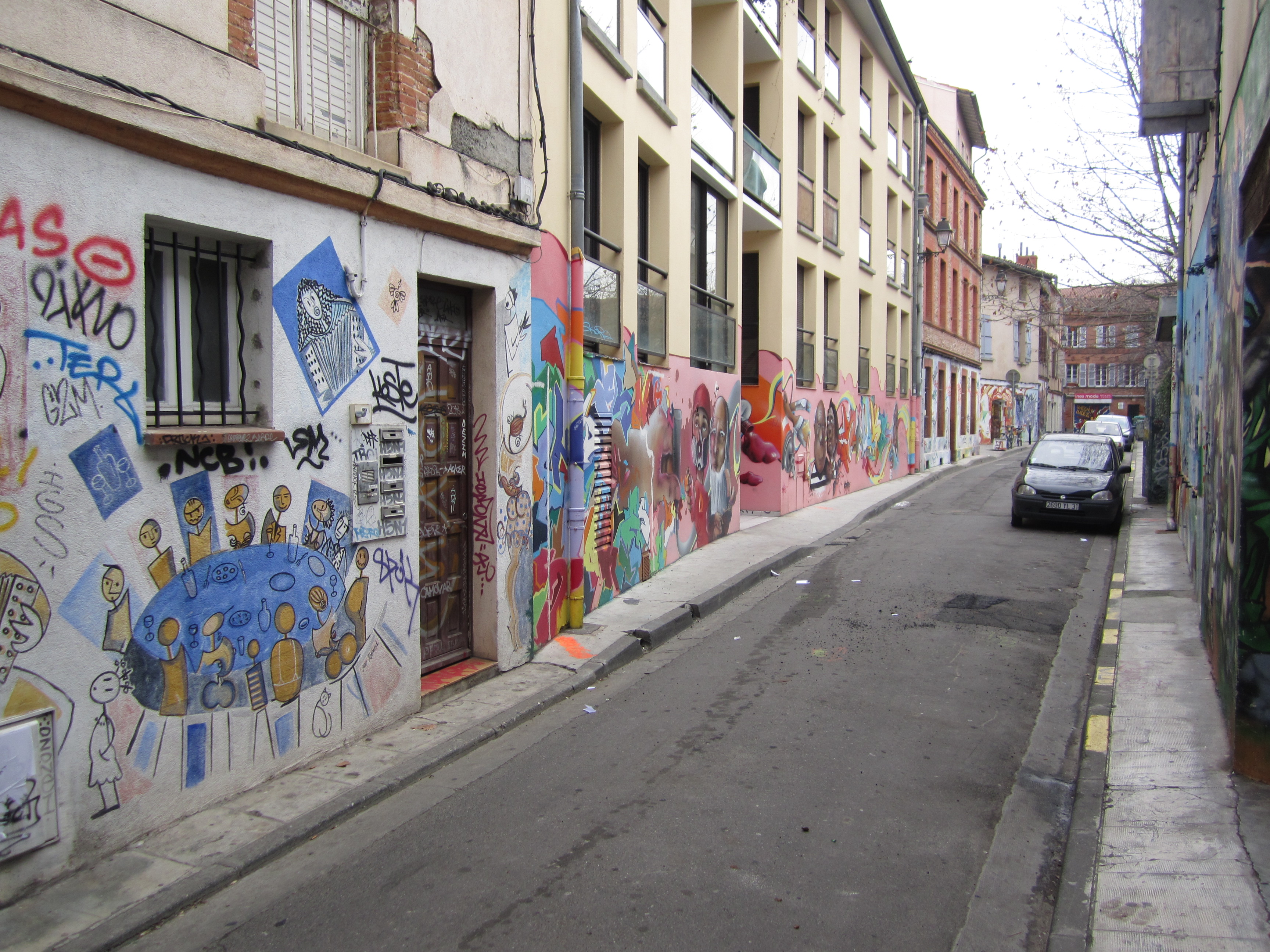 On retourne vers le centre de Toulouse par la place Arnaud Bernard pour prendre ensuite une rue à tags. Dans cette rue, les graffitis sont autorisés et les artistes se sont bien fait plaisir. On y trouve quelques tags genre signature et simple écriture mais aussi de véritable peinture. La place Saint Sernin et sa basilique ne se trouvent pas trop loin, après y avoir fait le tour extérieur et intérieur, on prend la rue du Taur qui débouche sur le Capitole !