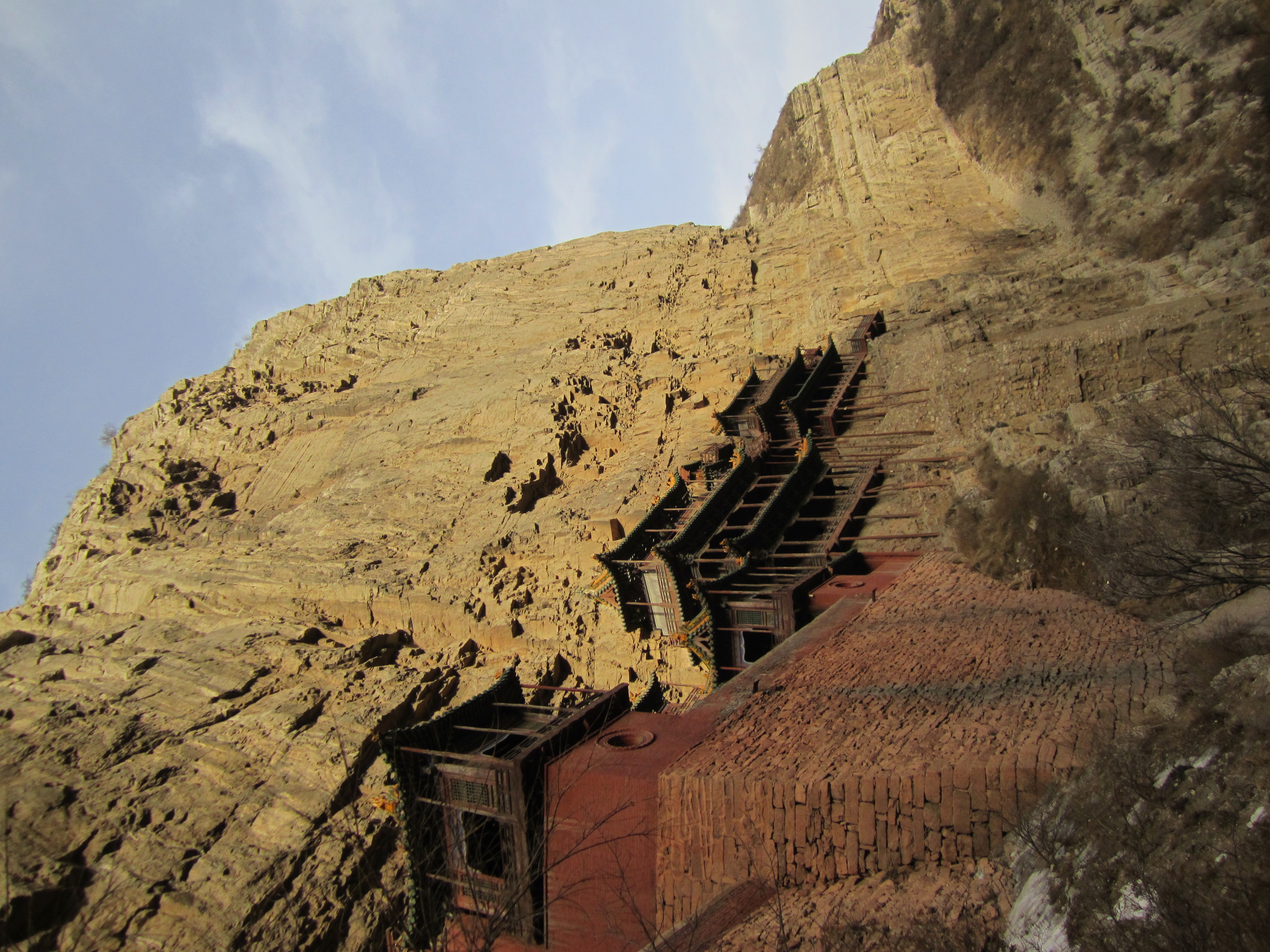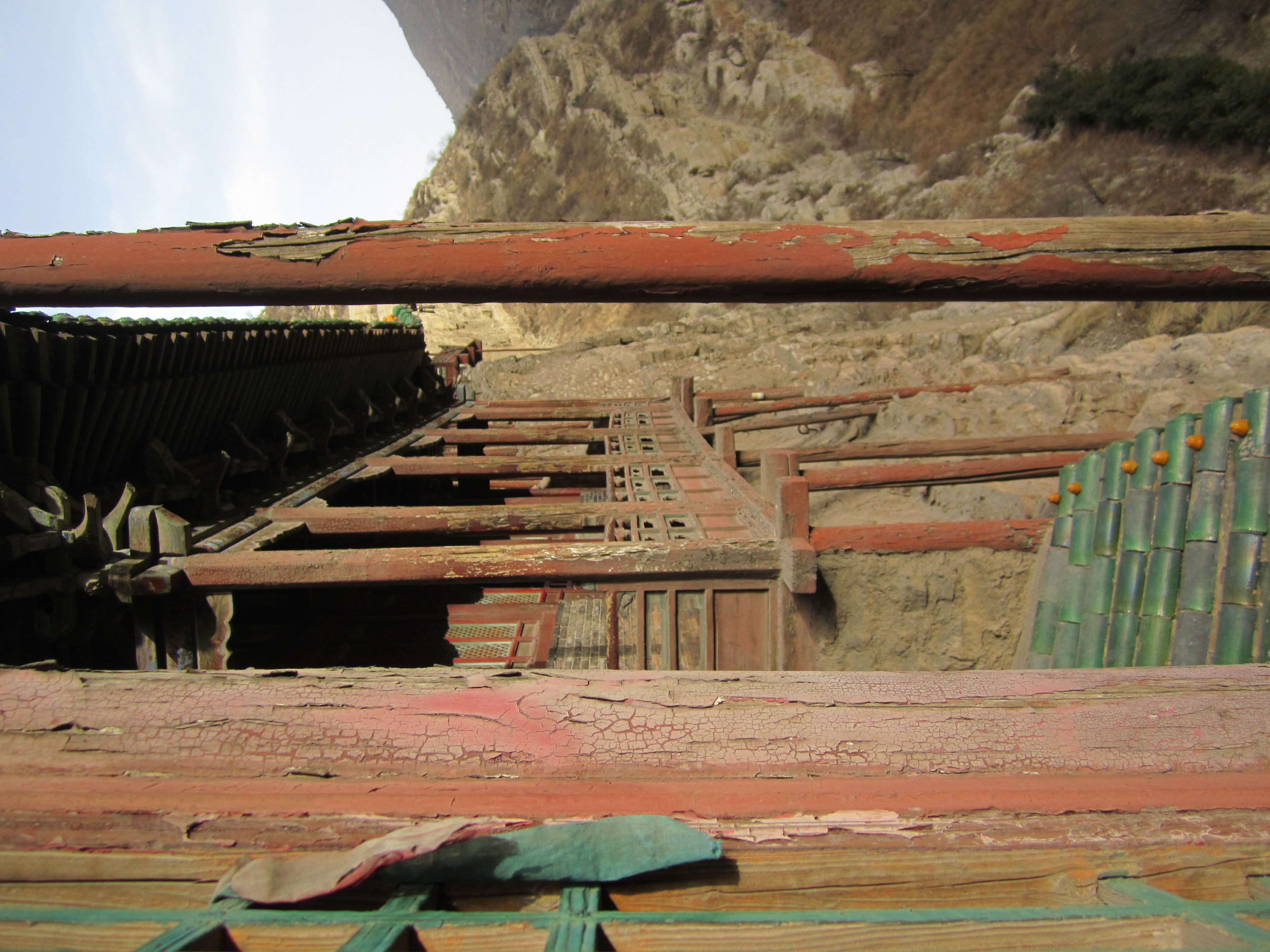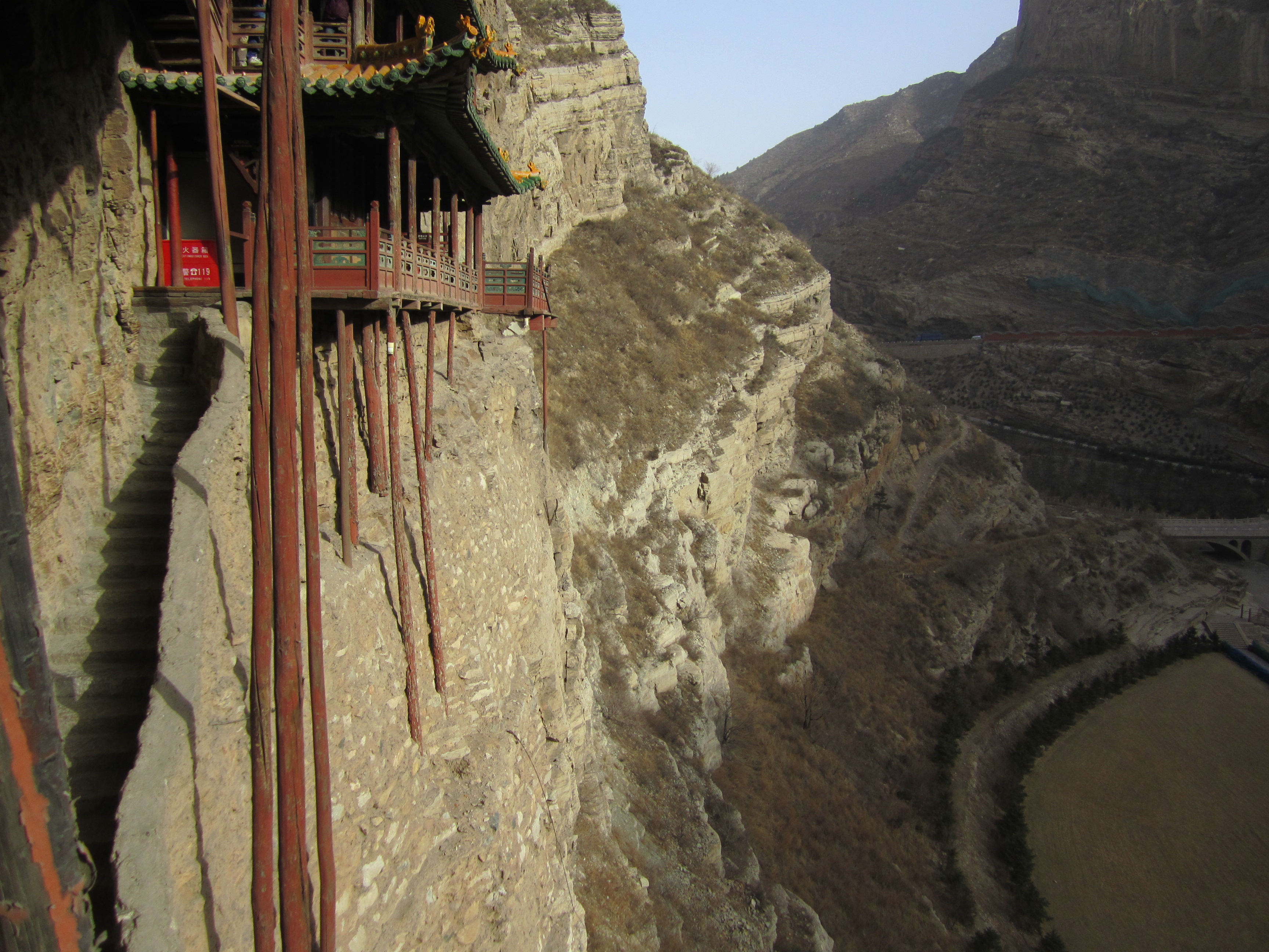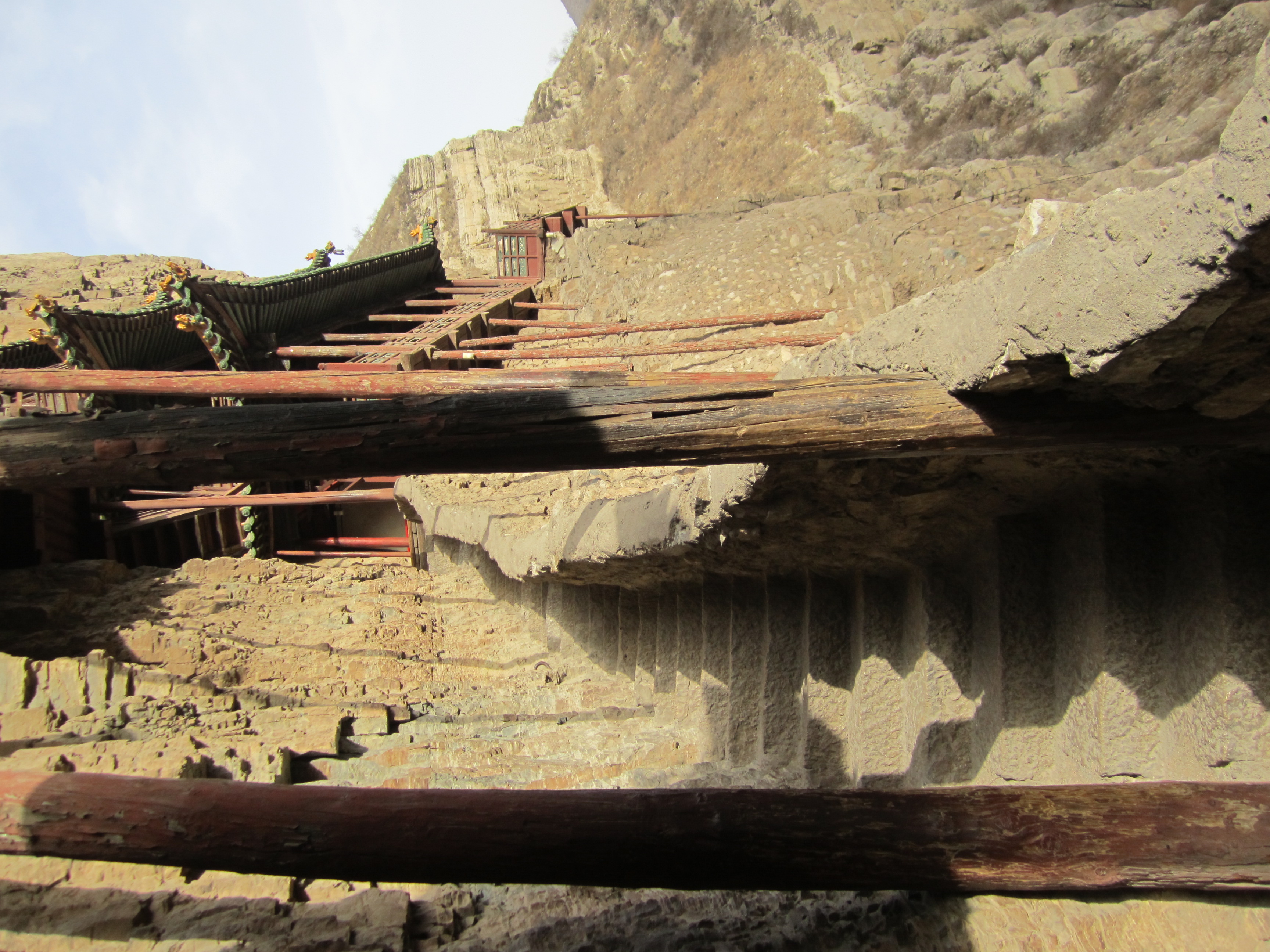 La vue est bluffante quand on arrive. Le monastère semble collé contre la paroi à plusieurs dizaines de mètres du sol avec des parties « suspendues » et soutenues par des étais en bois calés dans la roche.