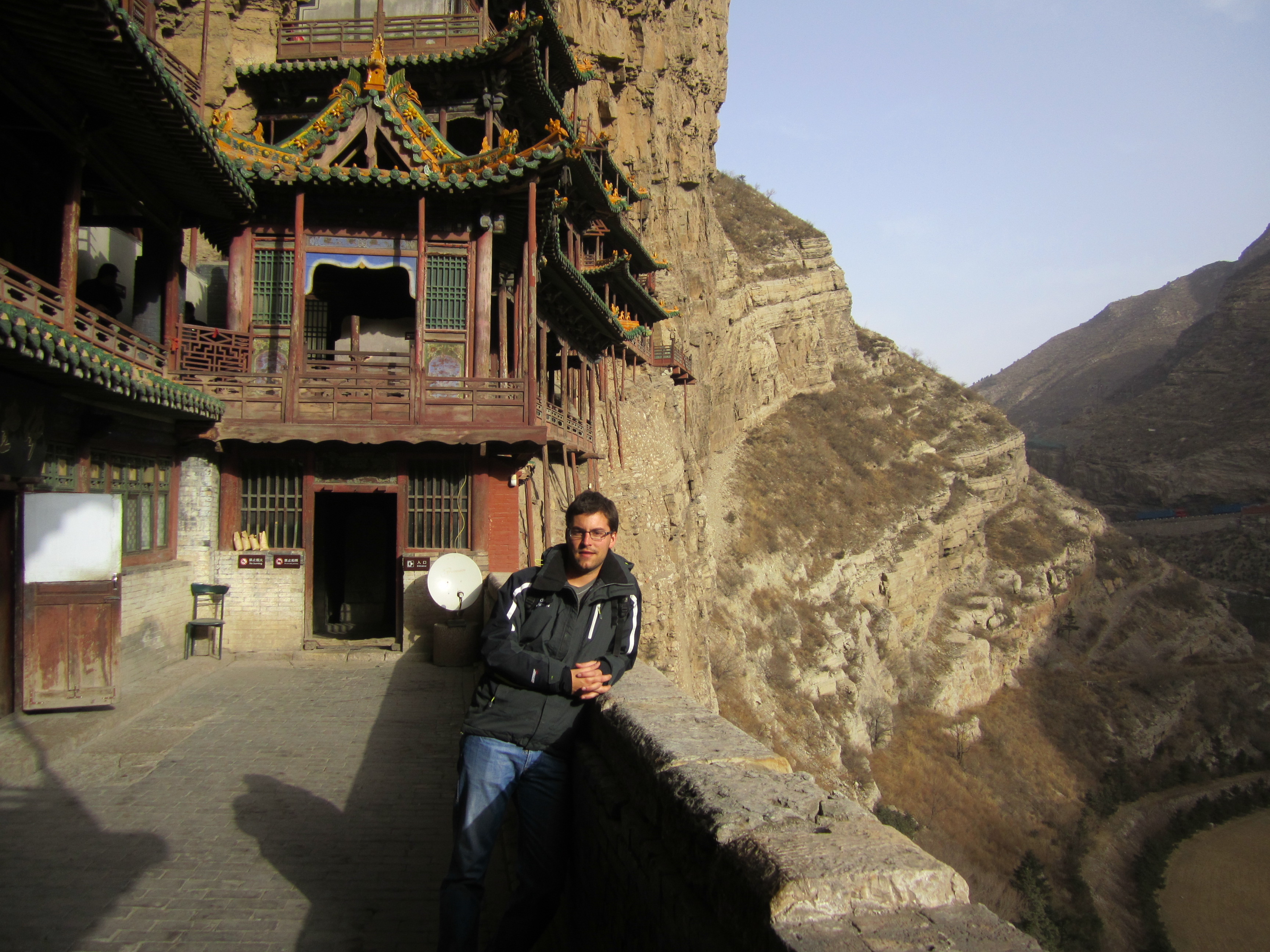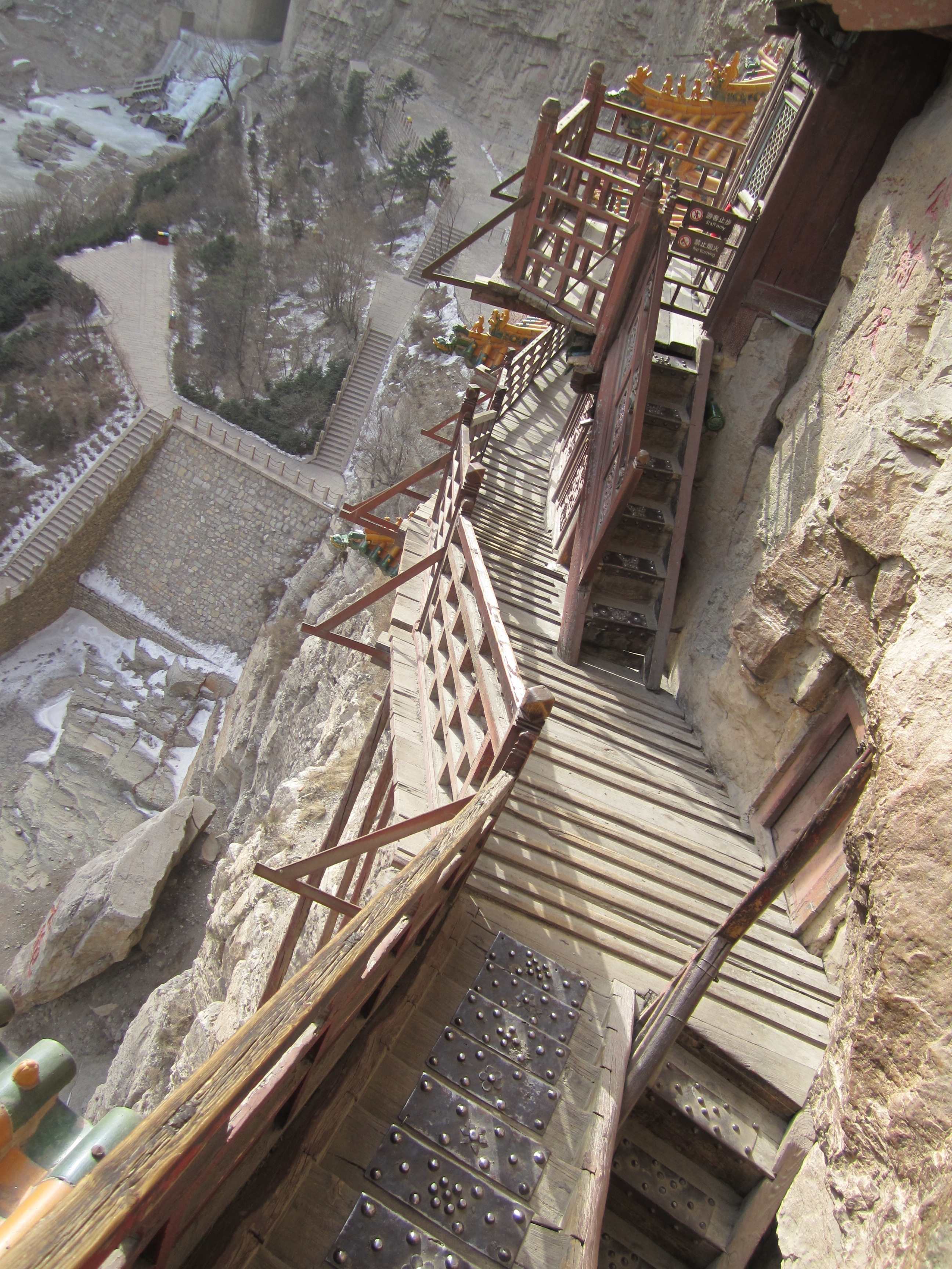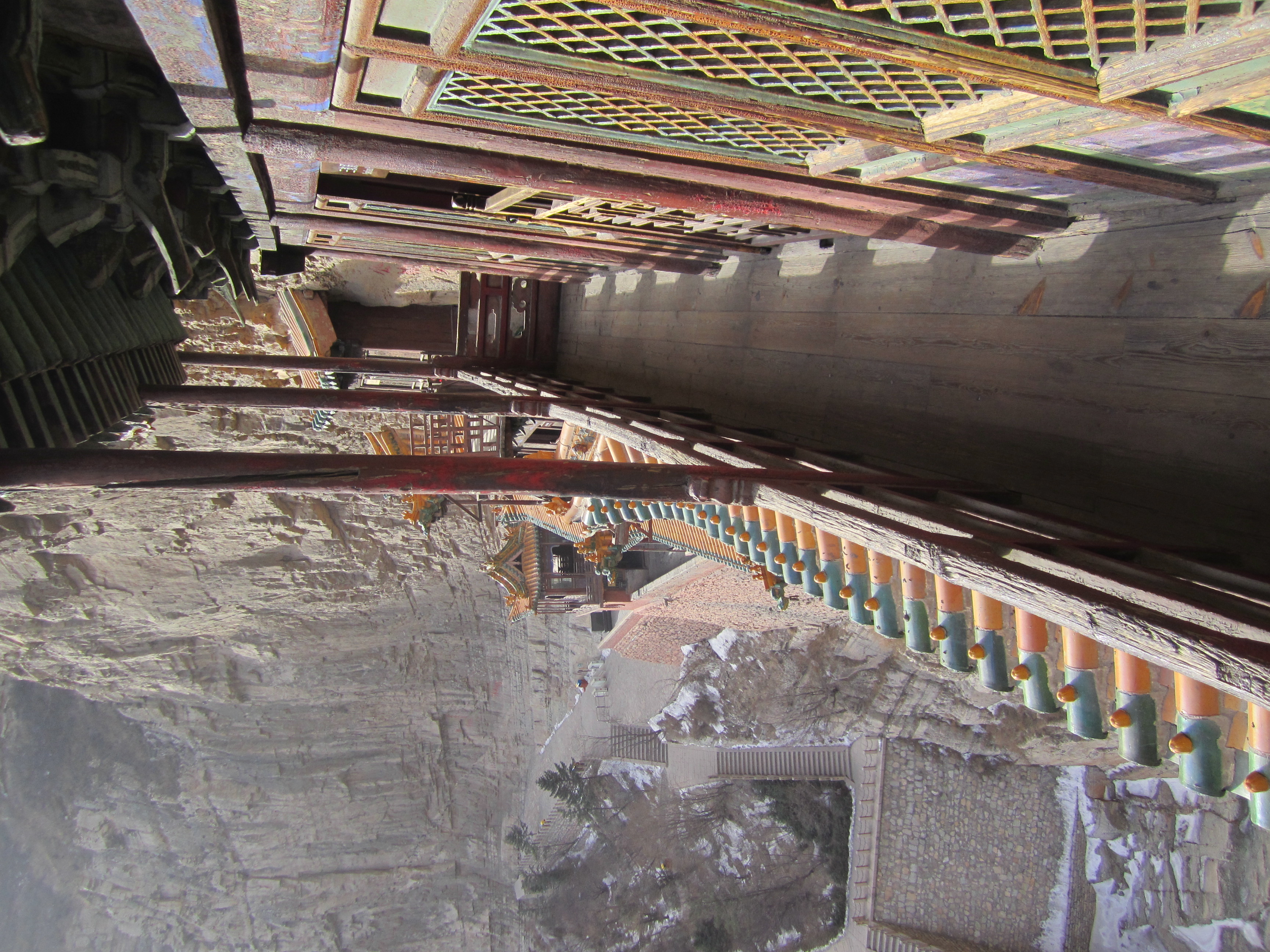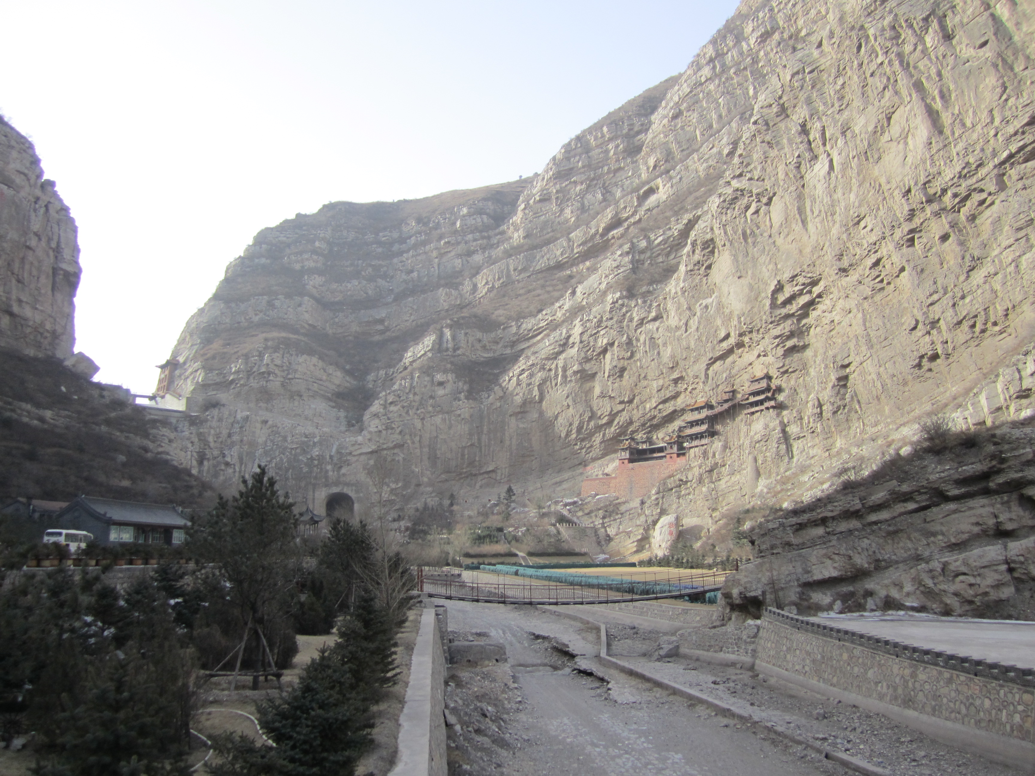 La vue est bluffante quand on arrive. Le monastère semble collé contre la paroi à plusieurs dizaines de mètres du sol avec des parties « suspendues » et soutenues par des étais en bois calés dans la roche.