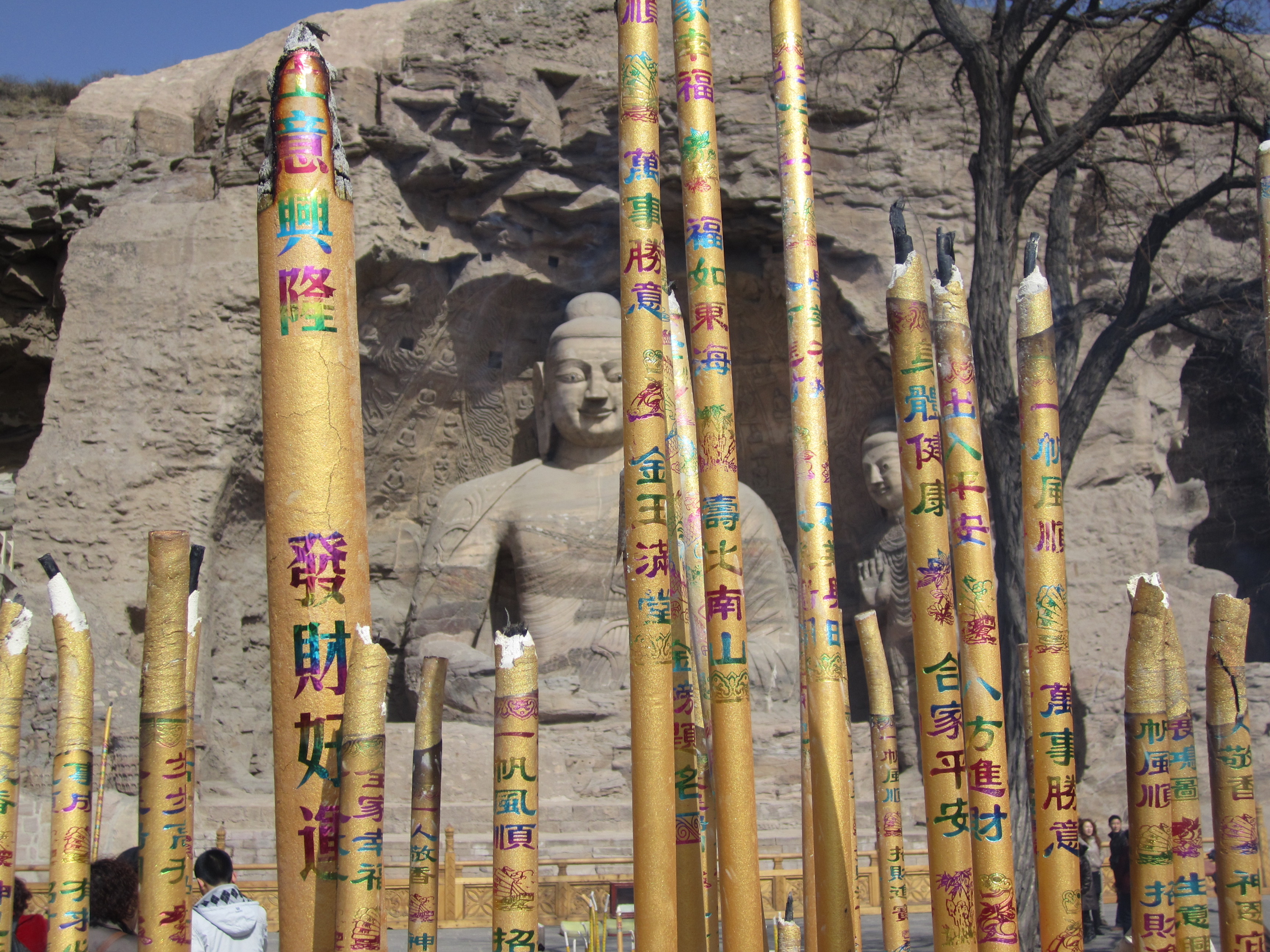 Pour finir, la paroi de la grotte 20 s’étant effondrée, sa niche expose un immense bouddha, devenu un des symboles de Yungang. On retrouve d’ailleurs des encens brûlant devant ainsi que de quoi prier (comme dans les temples à Beijing). Le reste des grottes est de moins en moins impressionnant et de plus en plus petit.
