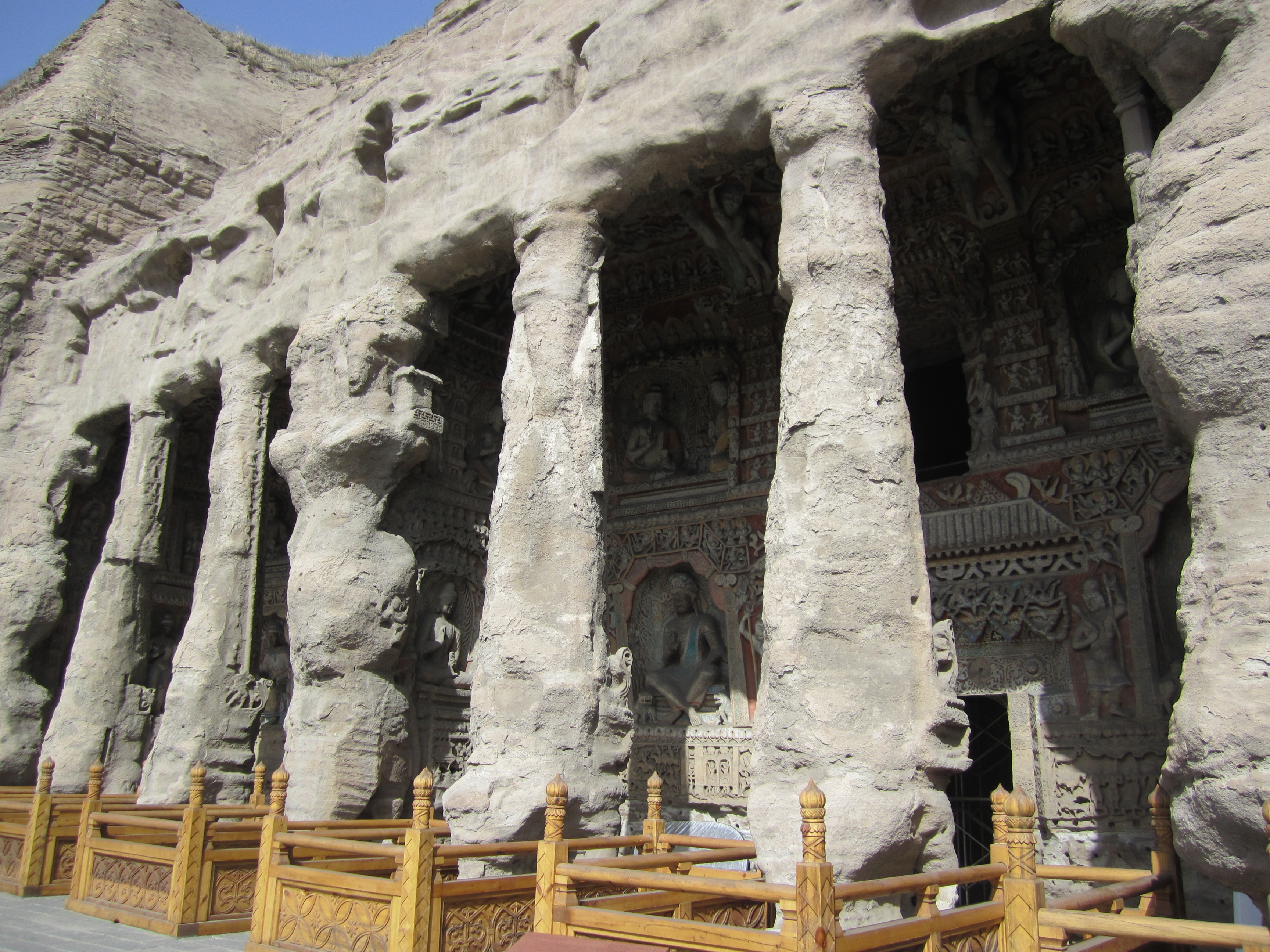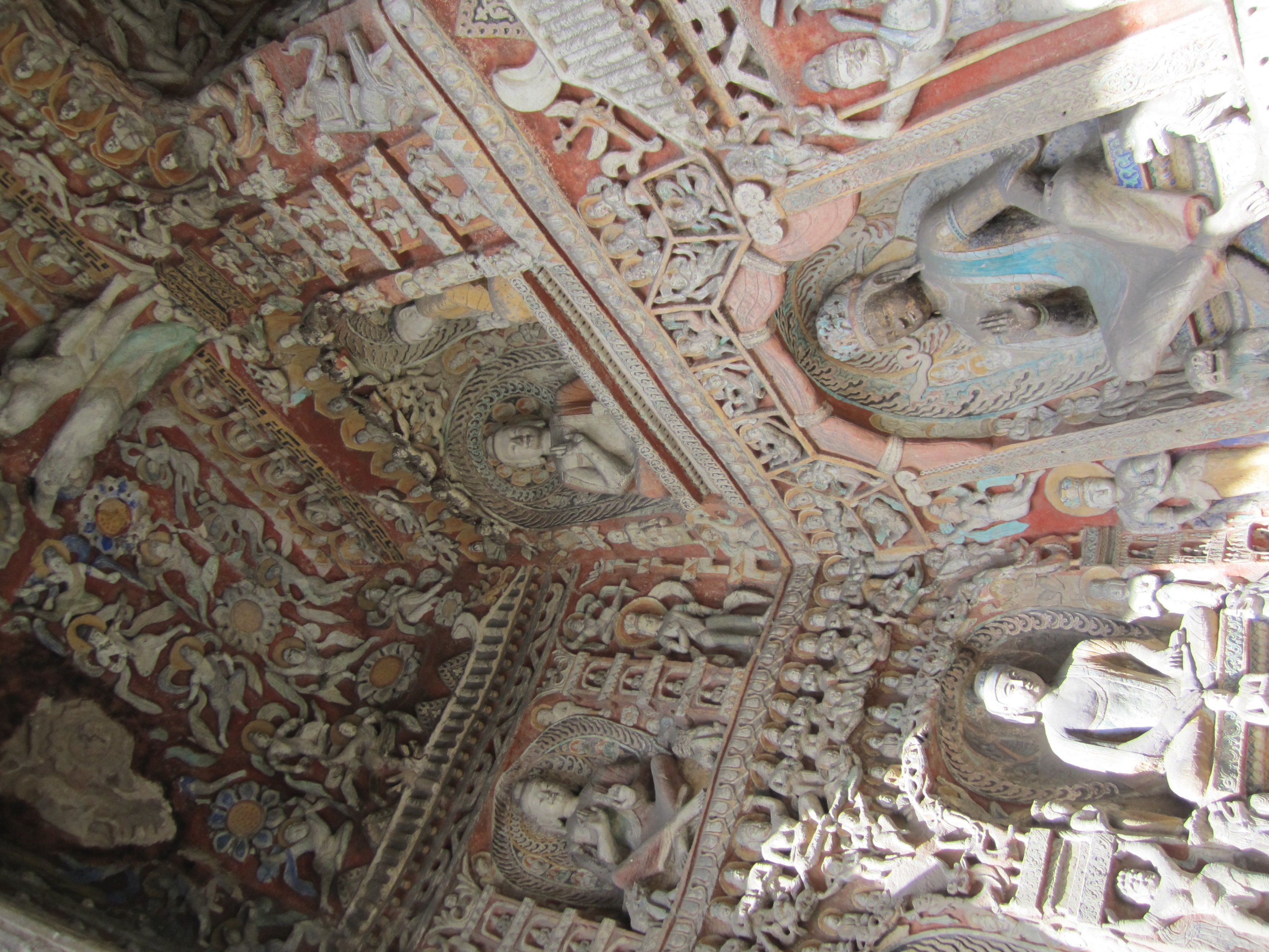 Les grottes 5 & 6 sont protégées par un pavillon en bois et sont considérées comme les chefs-d’œuvre de Yungang. Leur intérieur est plus délirant que les autres. On n’y trouve pas un bouddha mais une sorte d’énorme bloc de 15 m de haut à 4 faces avec, creusés dans chaque face, un ou plusieurs bouddhas mis en scène. Impressionnant! Les grottes 7 à 10 fonctionnent aussi par couple. A partir de la grotte 10, plus de pavillon protecteur et on peut, en prenant du recul, voir apparaître au niveau des ouvertures supérieures les visages majestueux des bouddhas (surtout dans la grotte 16 ou 17).
