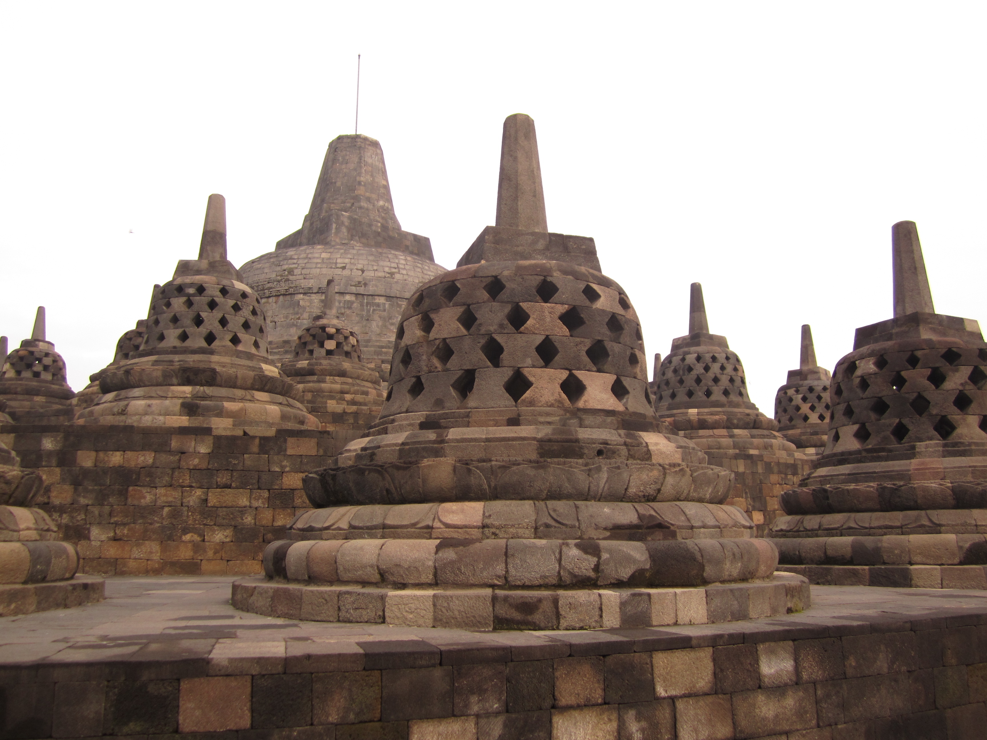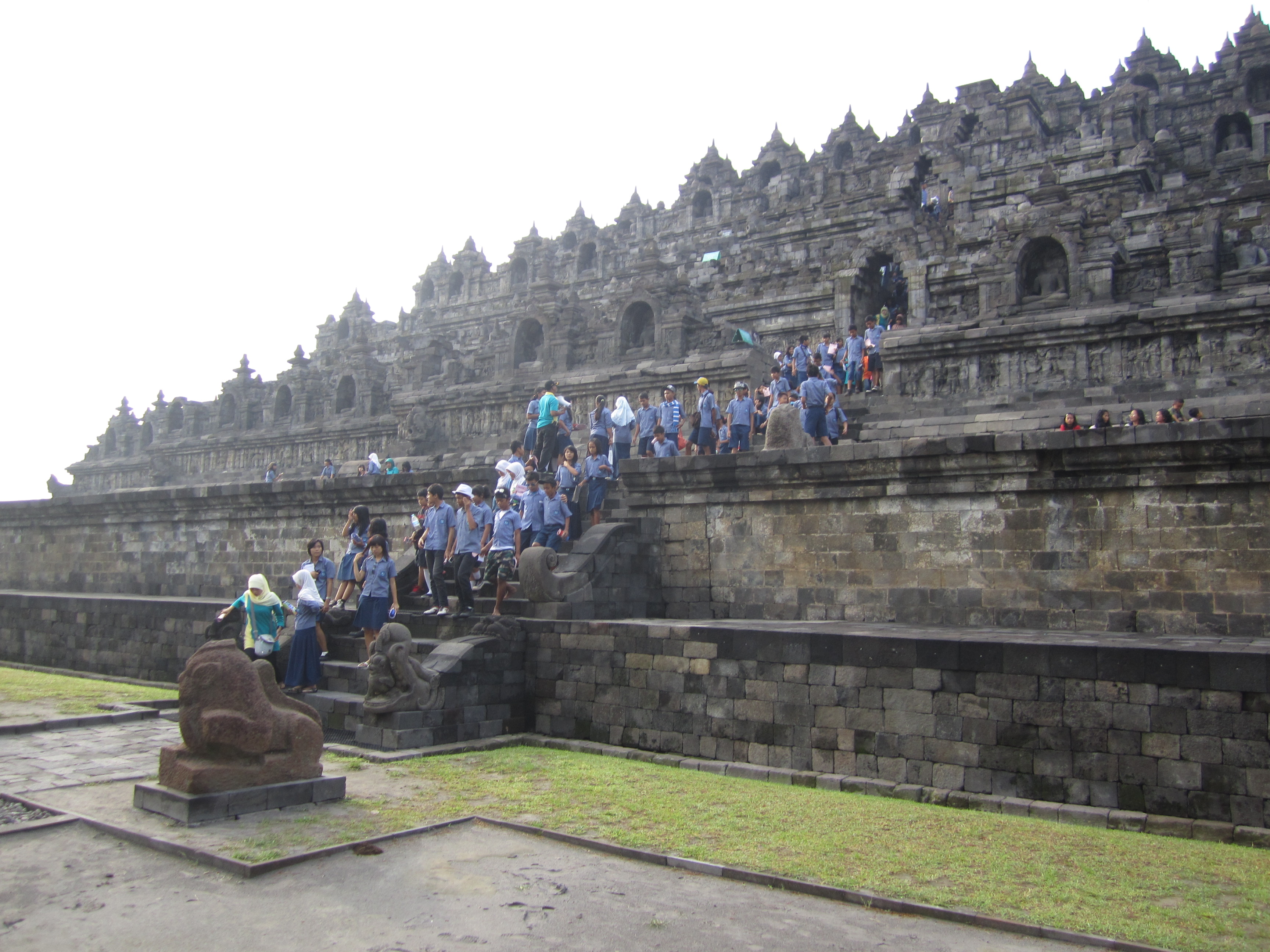 On a booké un tour la veille, durée du tour : 9h en commençant à 5h du matin. Le réveil est hard. L’idée étant d’arriver à Borobudur pour le lever du soleil, vers 6h. Sur place, pas de bol, les nuages sont aussi là et profitent plus du lever de soleil que nous. Qu’à cela ne tiennent, le temple est vraiment joli avec la lumière du jour qui se lève. Une énorme masse avec une base carrée à 3 niveaux et 3 niveaux ronds, fermés pour rénovation, pour le haut du temple. Sur les 3 derniers niveaux, « d’énormes cloches » dites stupas renferment des petits buddhas. On en retrouve des plus gros sur un peu tous les niveaux. 2h de visite tout de même. On fait nos premières photos avec des écoliers venus visiter le temple.
