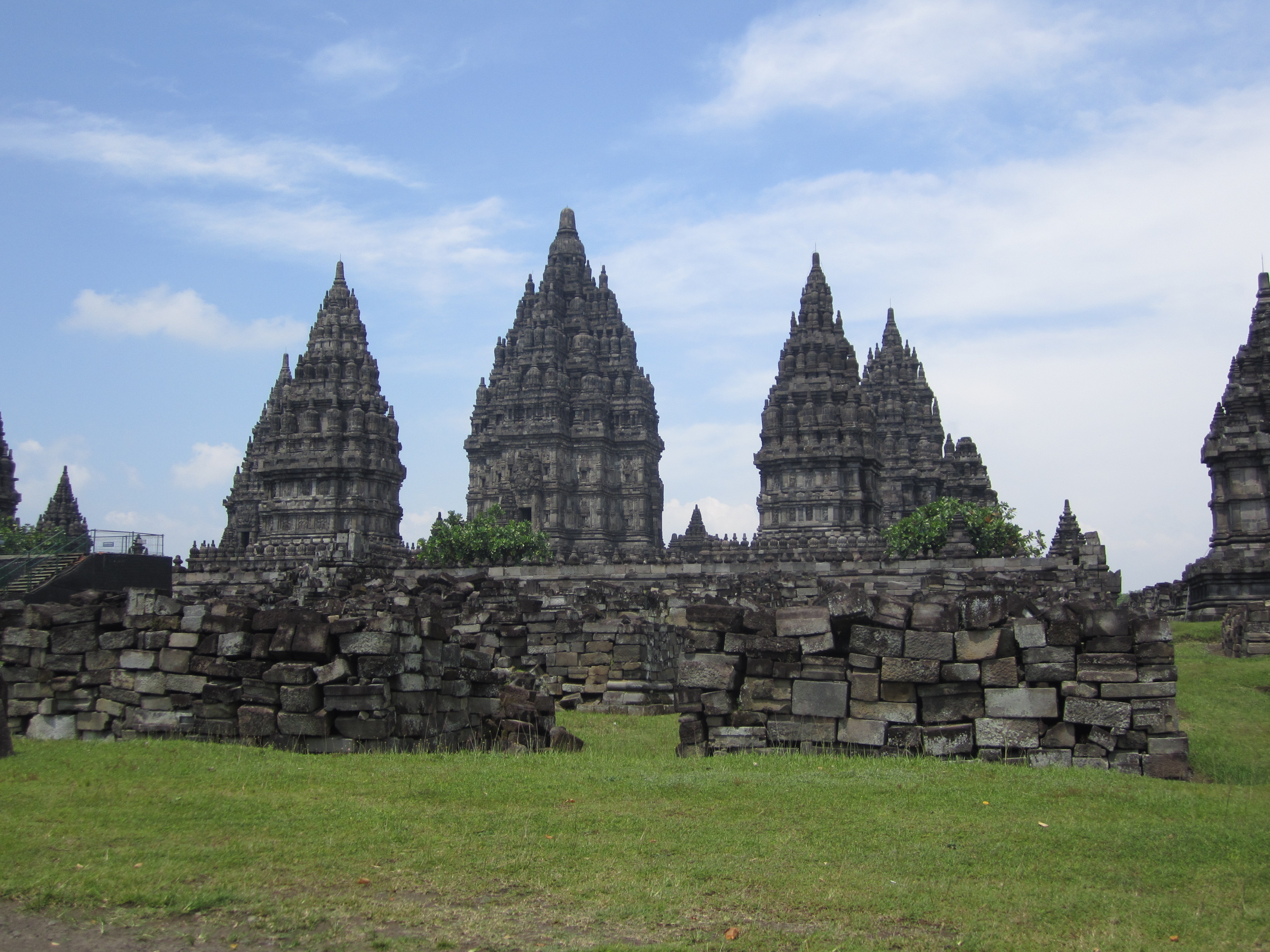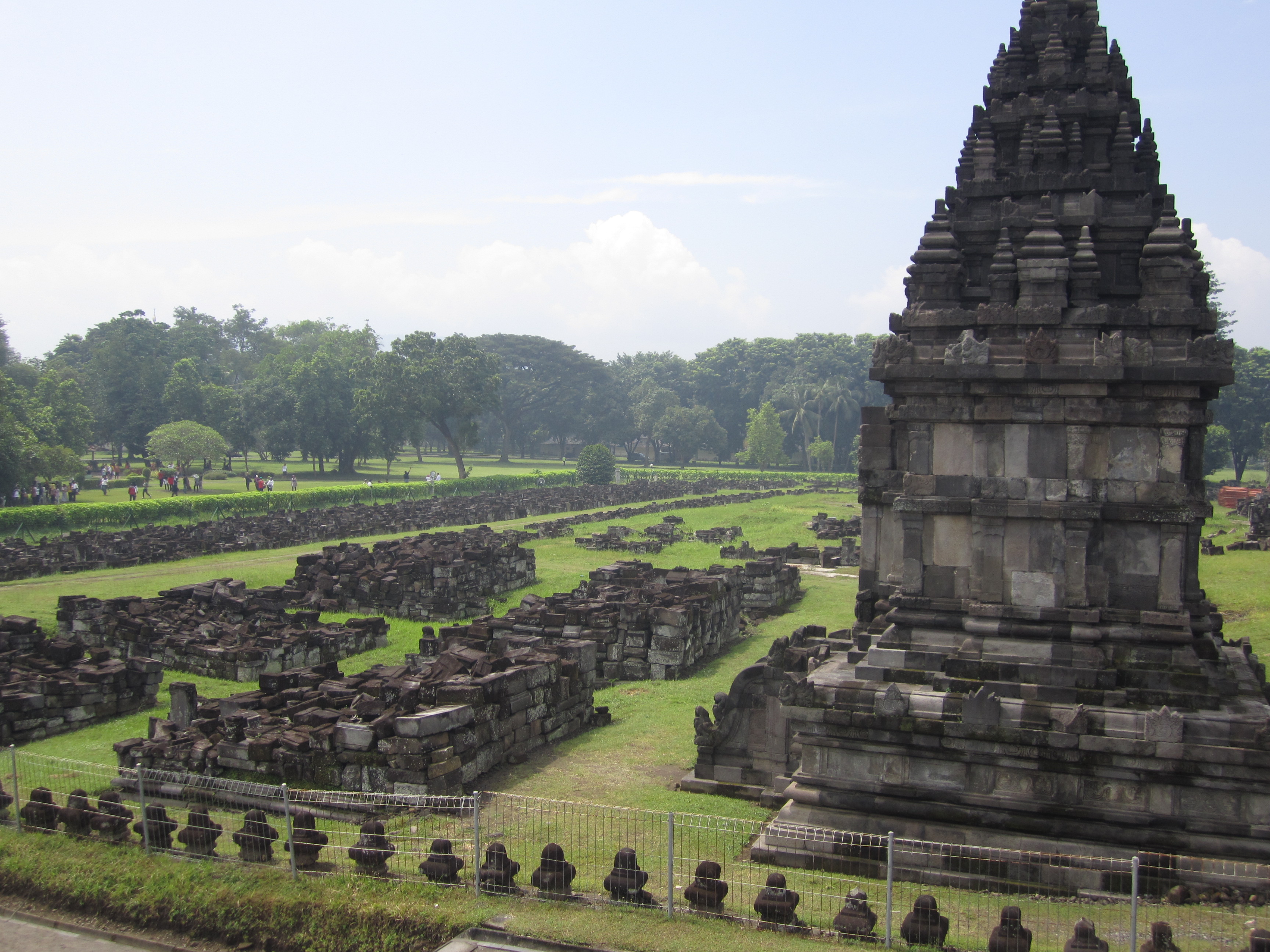 Notre chauffeur nous emmène maintenant à Prambanan (pas la guesthouse, le temple hein). On retrouve déjà beaucoup plus de touristes, il est 10h, tout le monde est là ! Entre 2-3 prises de photos avec des écoliers, on visite ce temple, qui a beaucoup souffert des différents événements naturels (séisme & éruption).