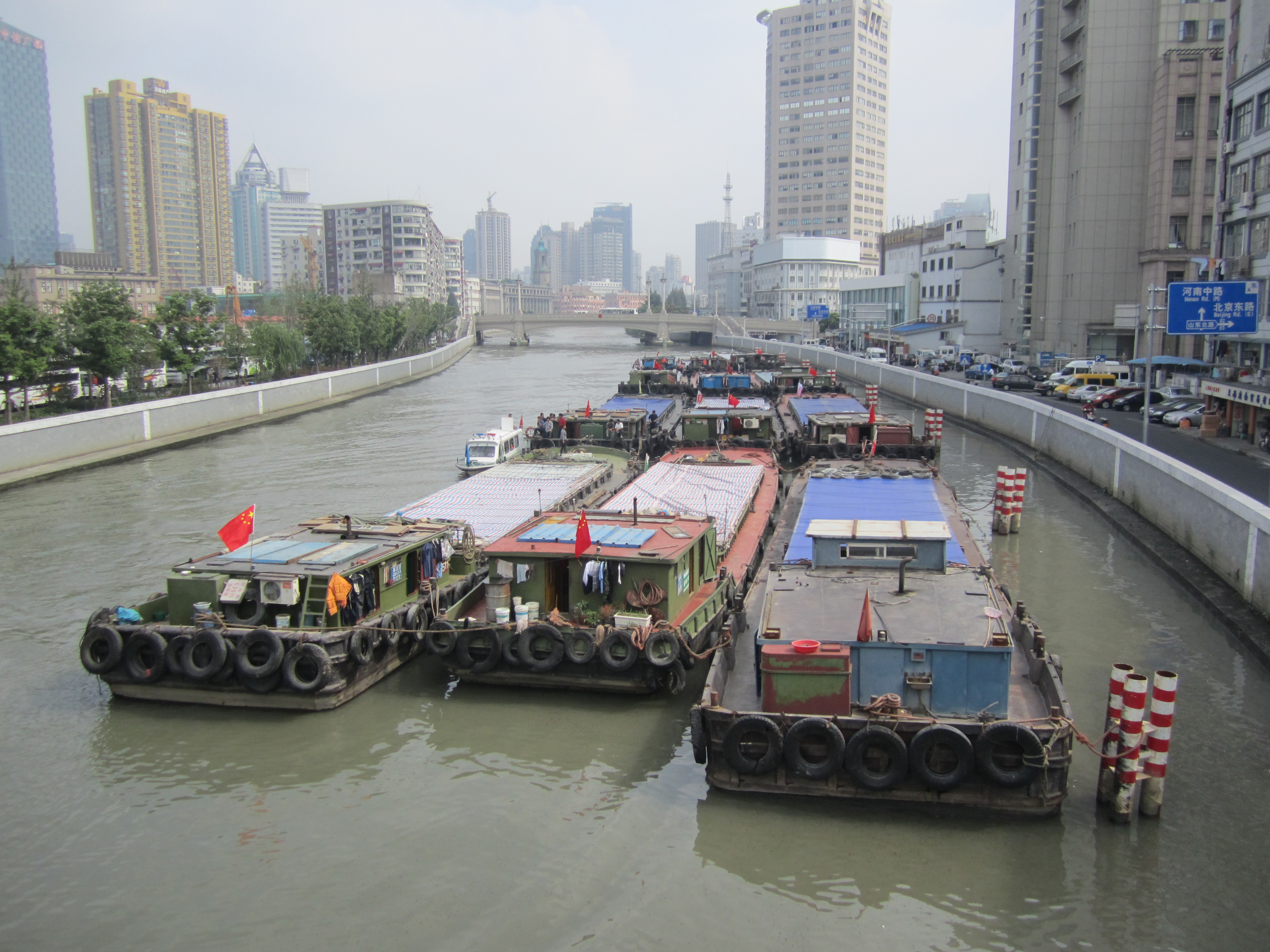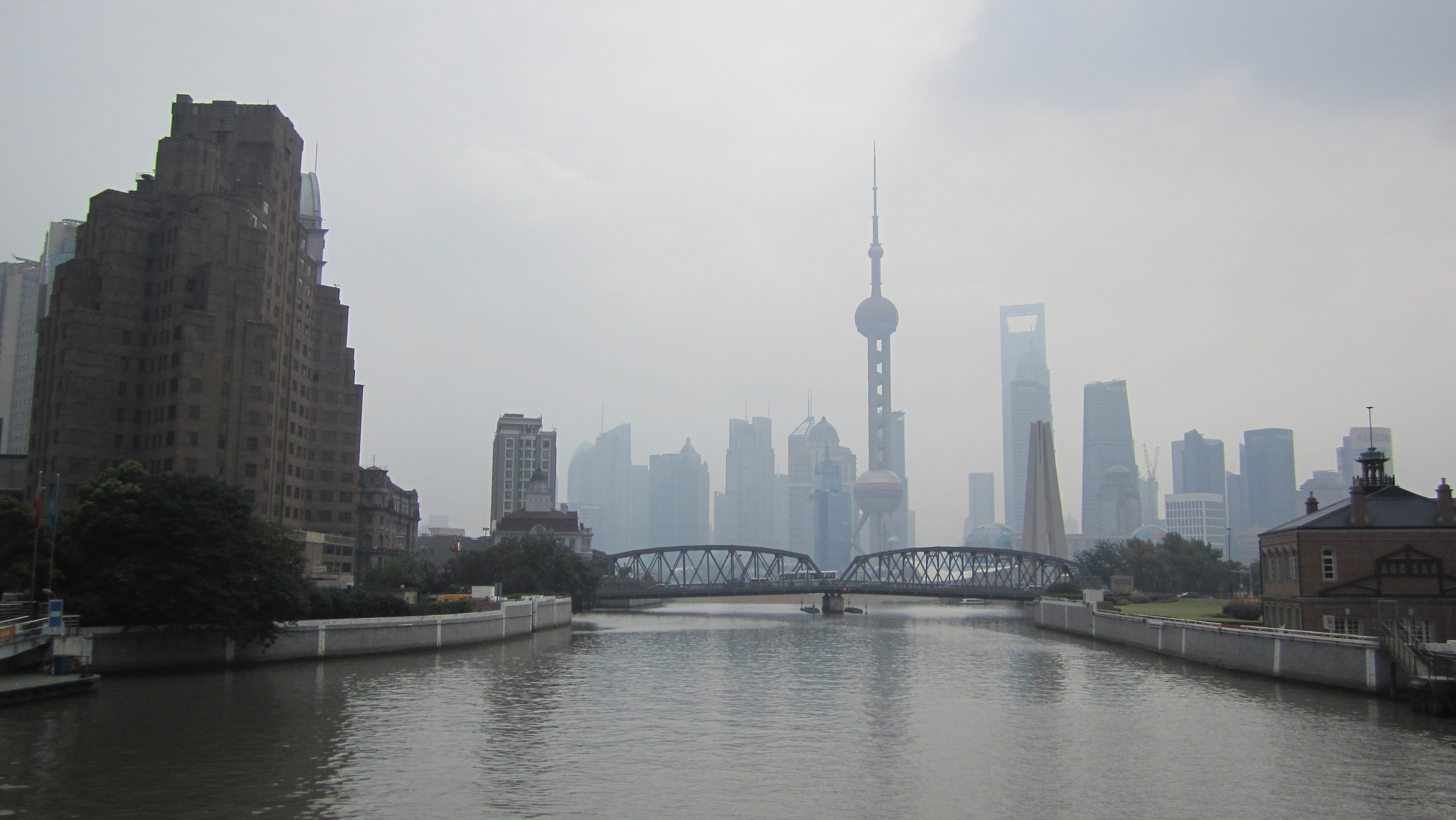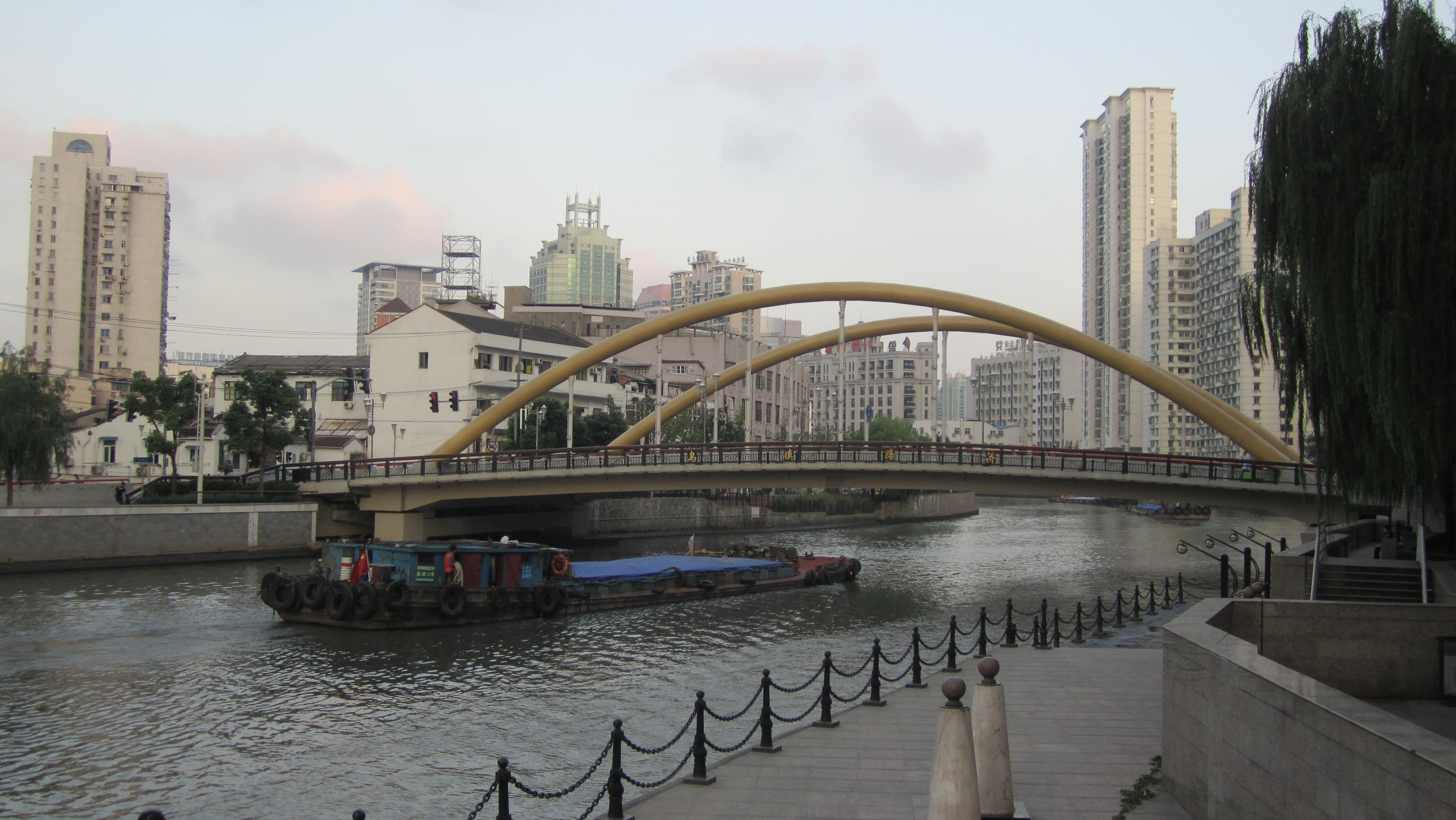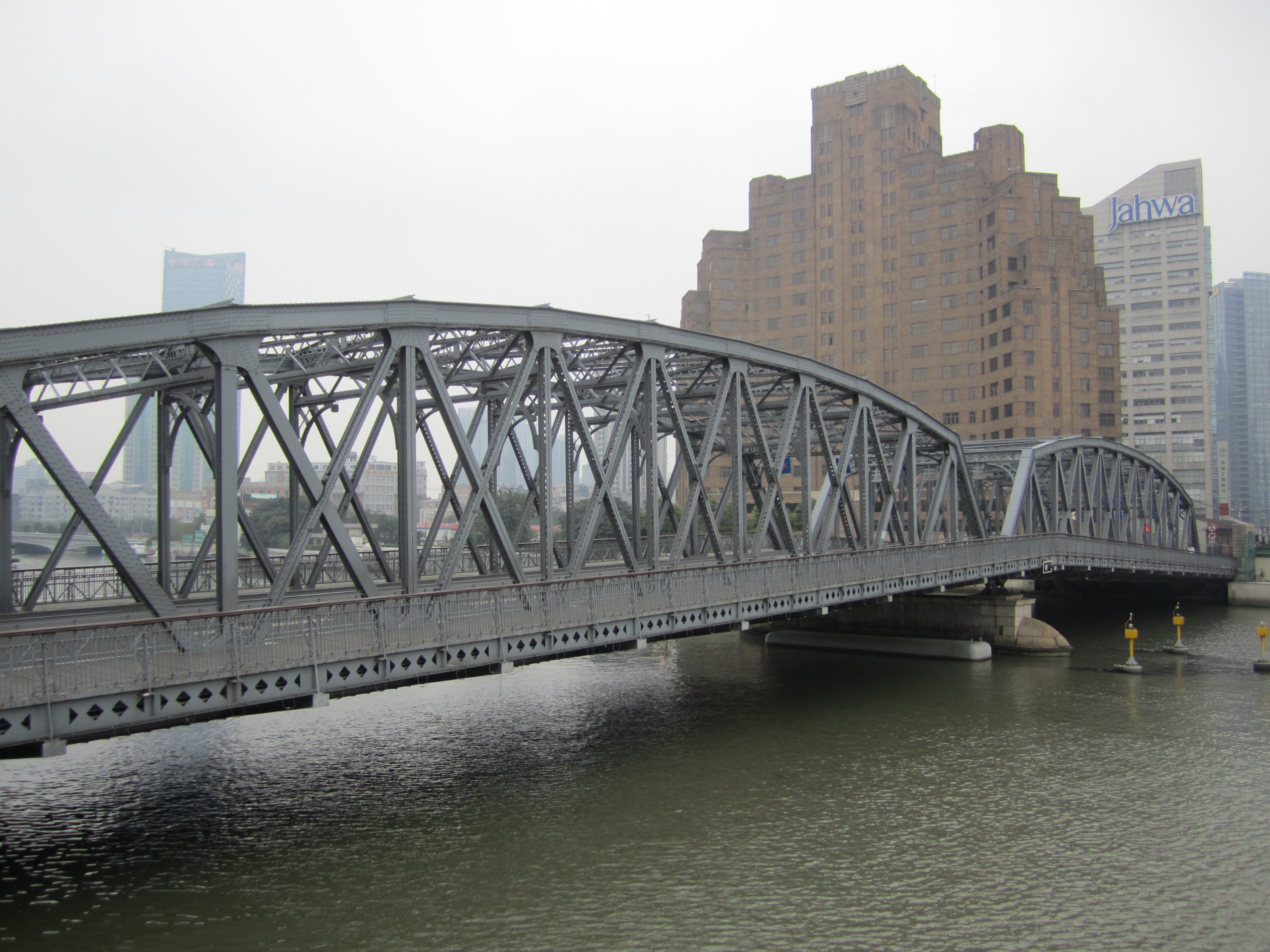 Je suis arrivé par le nord du Bund. J'ai longé la petite rivière Suzhou, sur laquelle beaucoup de péniches sont parquées, jusqu'au pont de Waibaidu. Un pont métallique qui enjambe la petite rivière et qui permet de relier la concession japonaise (au nord) à la concession internationale (au sud). En arrière plan les vieux bâtiments, comme le consulat russe ou encore le Shanghai Broadway Mansions (l'immense bâtiment beige).