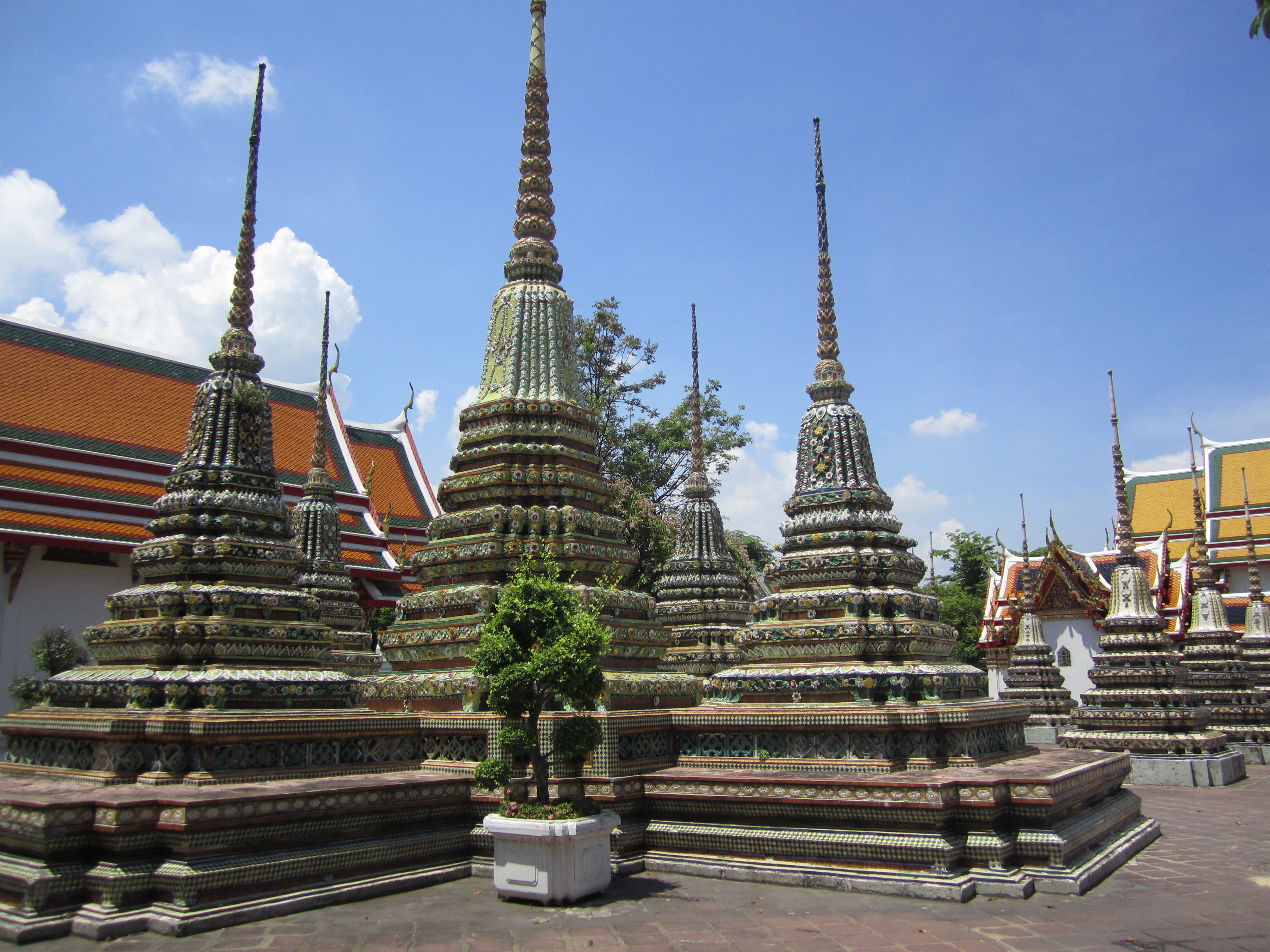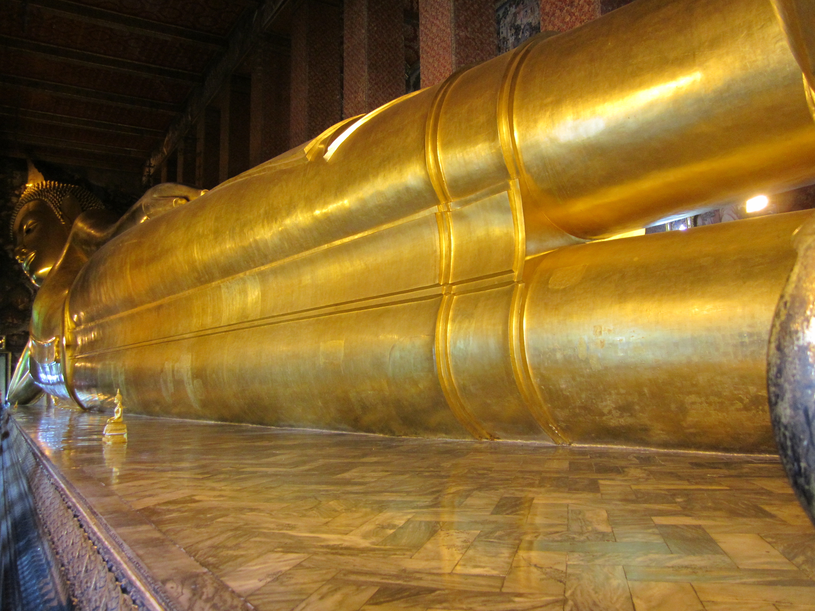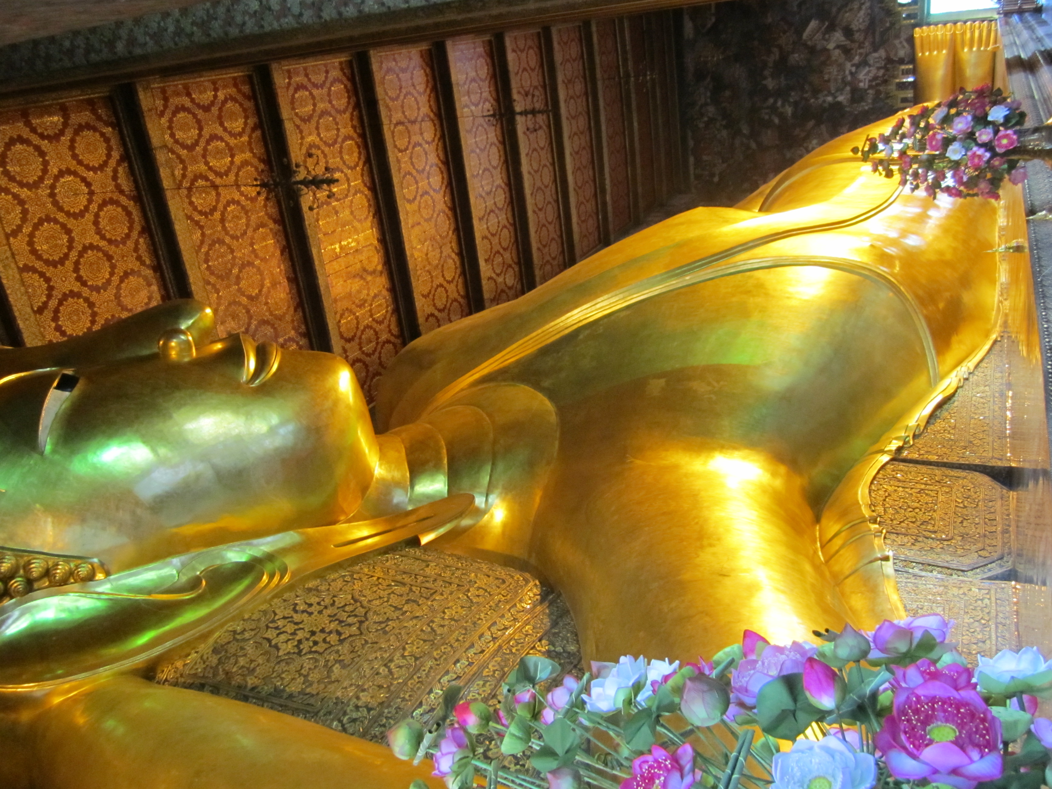 Juste après le Wat Phra Kaeo, on trouve le Wat Pho. Très réputé pour son « landing Buddha » (soit le Bouddha allongé), cet ensemble de temples ne se résume pas à cette statue, même si c’est la principale attraction.Long de 45m et haut de 15m, ses pieds sont joliment incrustés de nacre. La position couchée est celle précédant l’atteinte du nirvana, point de libération du cycle des réincarnations. La suite de la visite nous montre de grands chedi recouverts de céramique très décorées. Autour du temple principal, deux galeries abritent quelques 400 bouddhas assis.