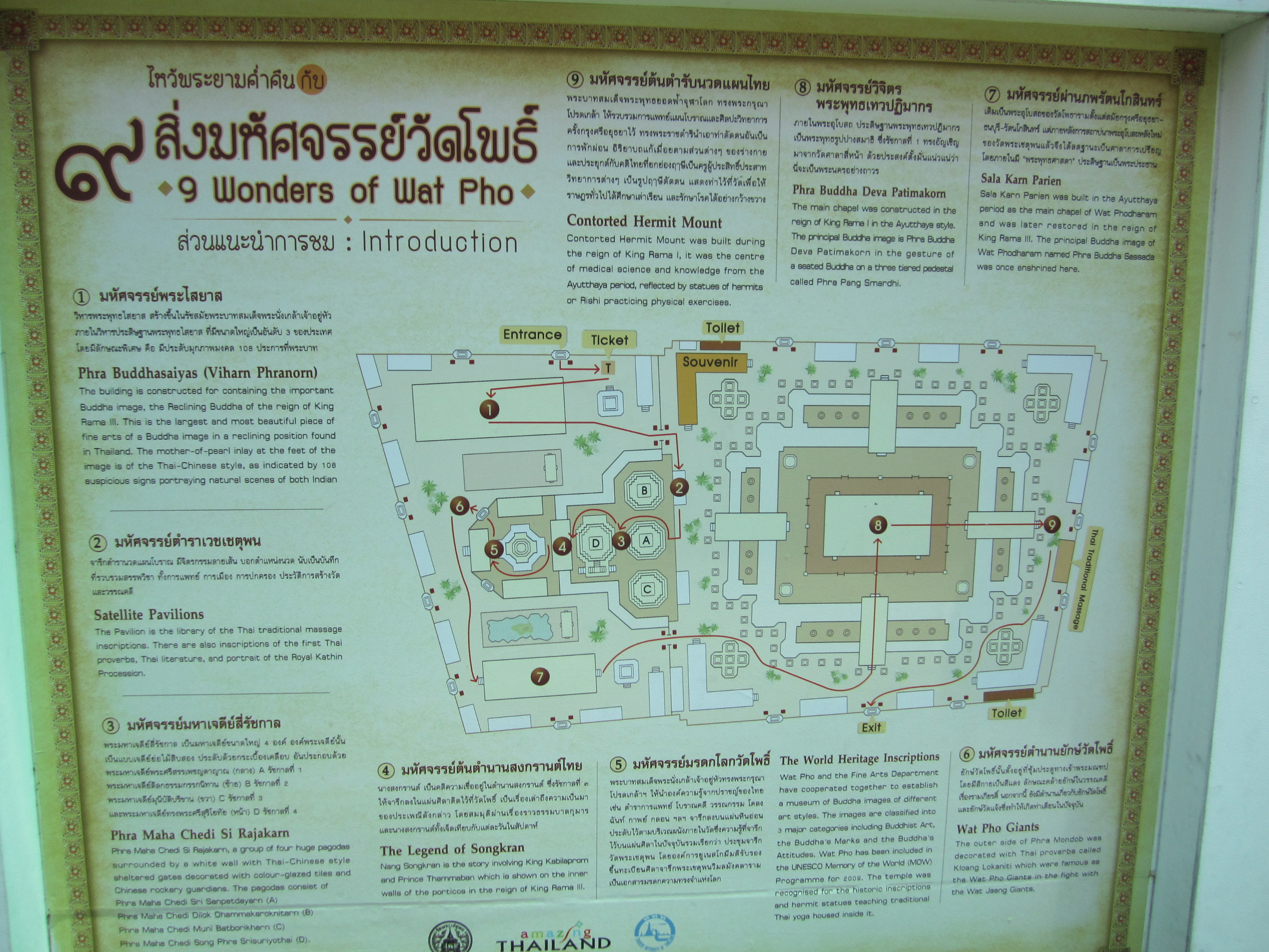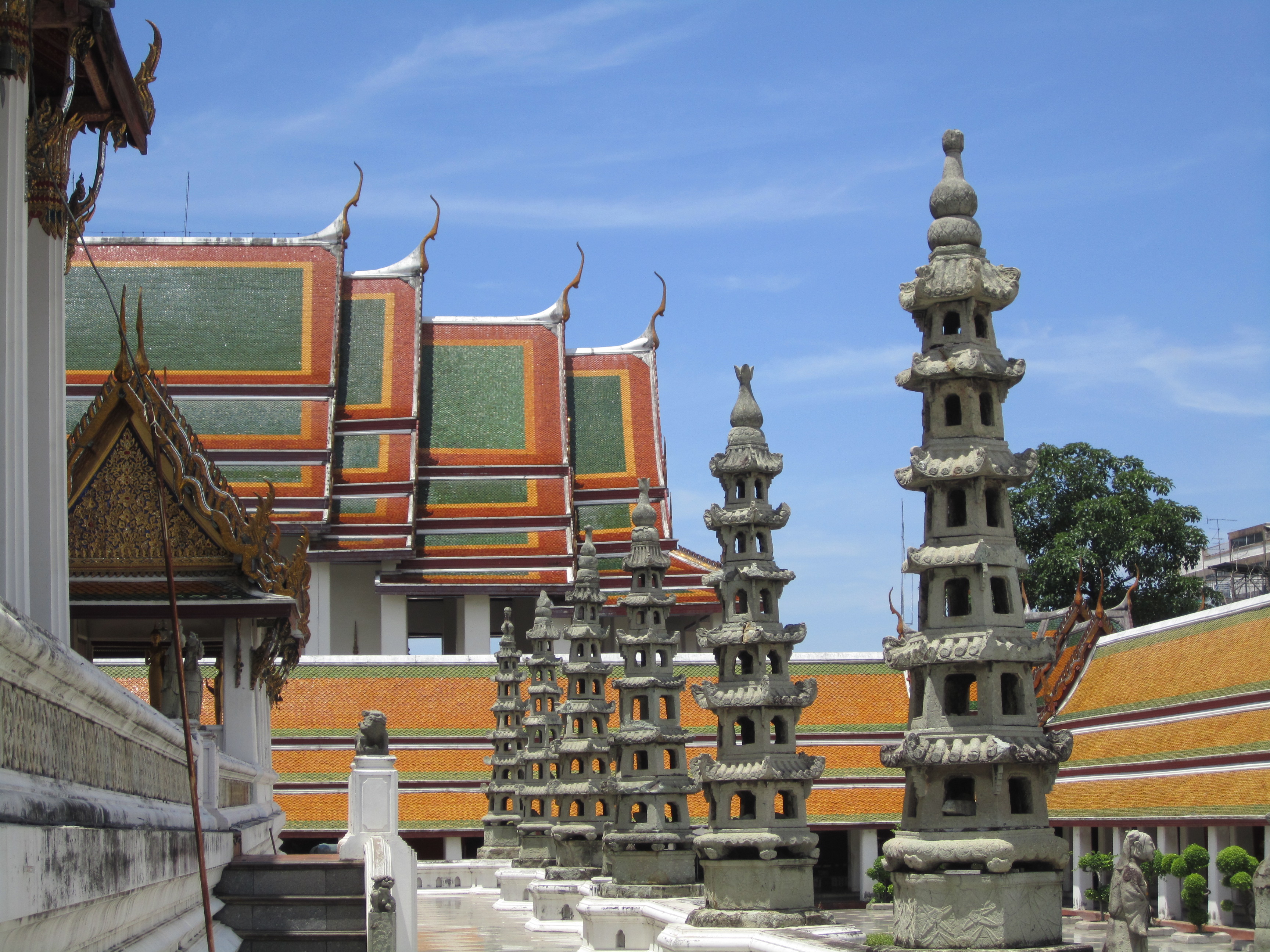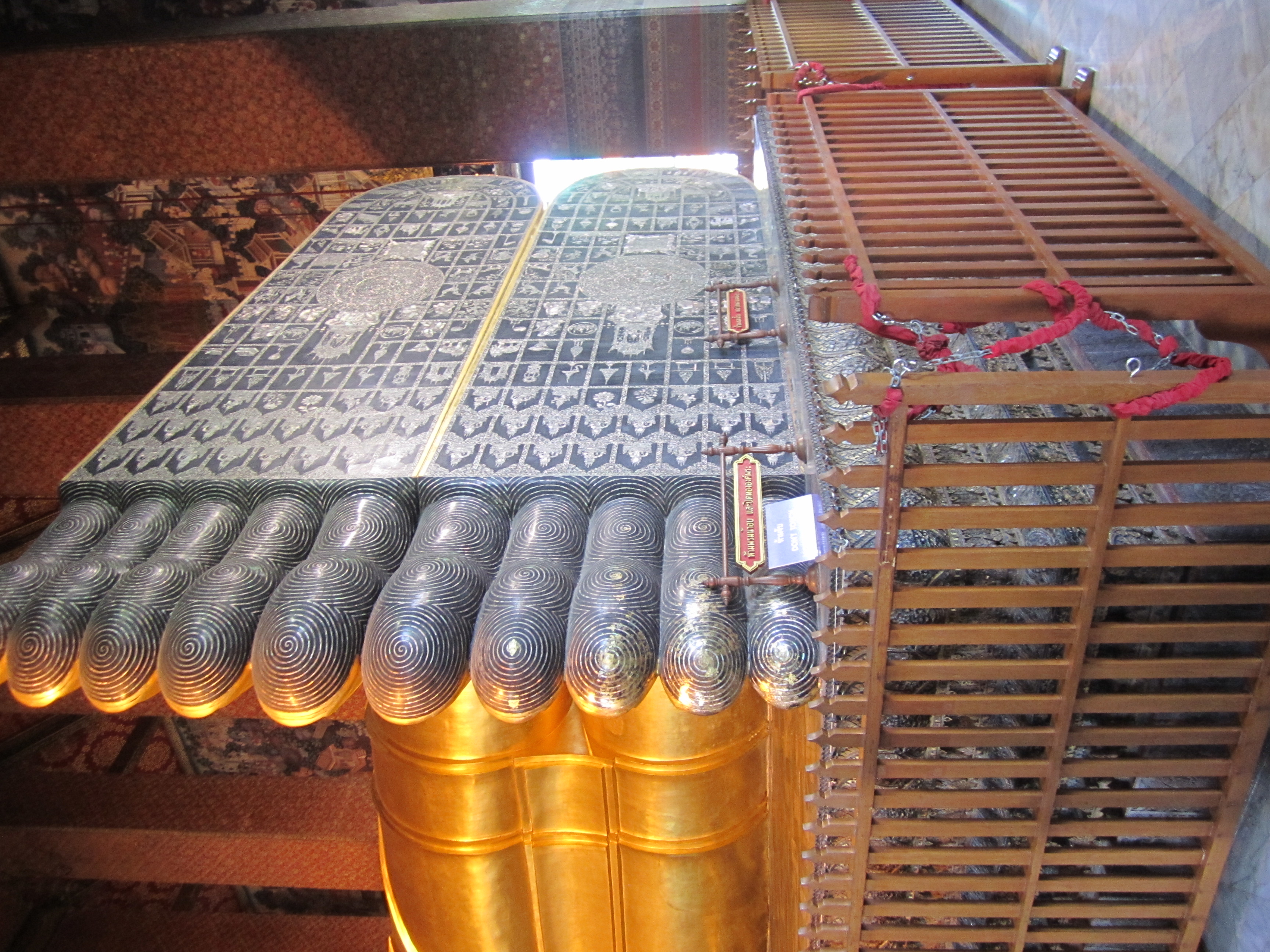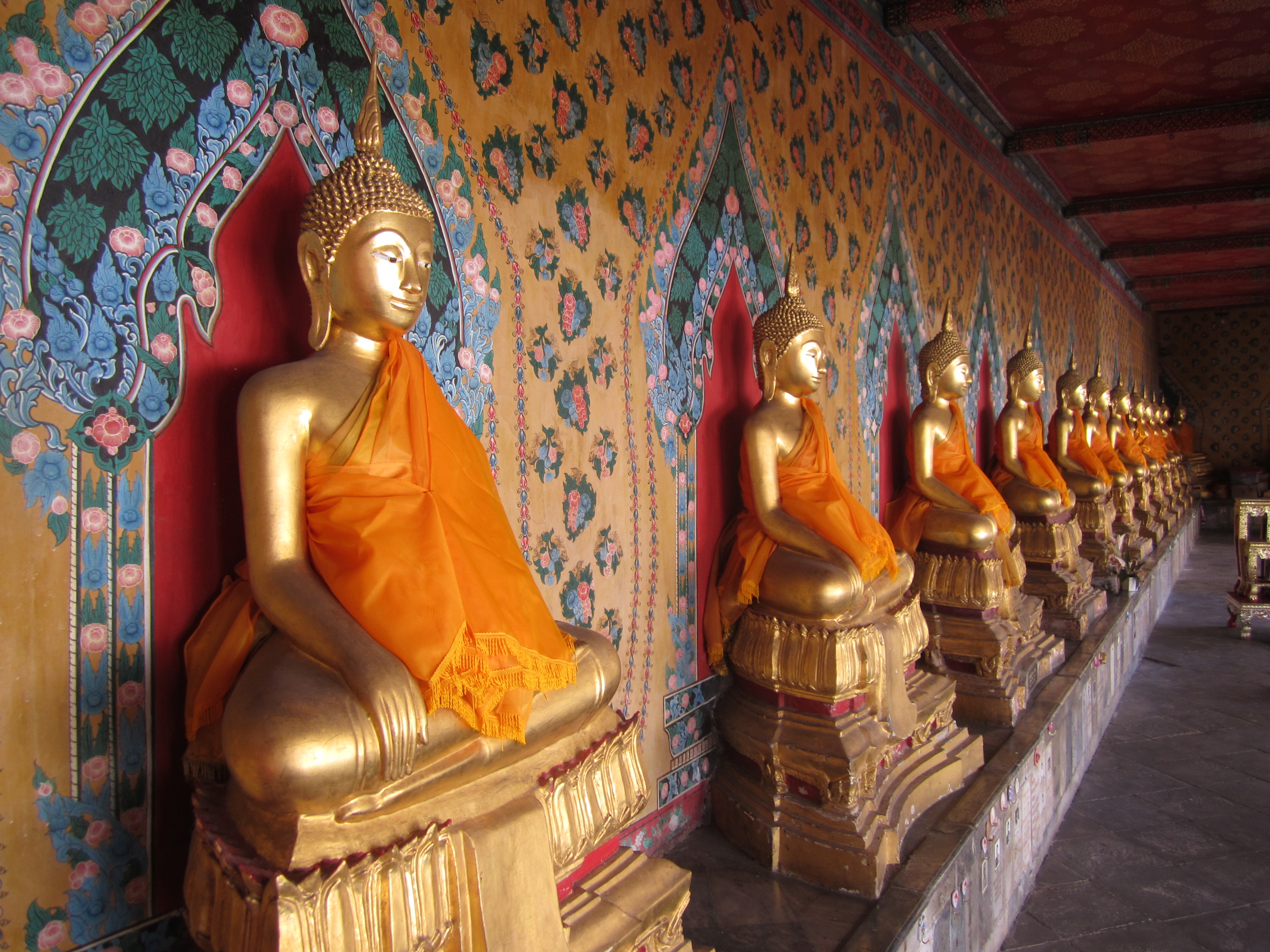 Juste après le Wat Phra Kaeo, on trouve le Wat Pho. Très réputé pour son « landing Buddha » (soit le Bouddha allongé), cet ensemble de temples ne se résume pas à cette statue, même si c’est la principale attraction.Long de 45m et haut de 15m, ses pieds sont joliment incrustés de nacre. La position couchée est celle précédant l’atteinte du nirvana, point de libération du cycle des réincarnations. La suite de la visite nous montre de grands chedi recouverts de céramique très décorées. Autour du temple principal, deux galeries abritent quelques 400 bouddhas assis.