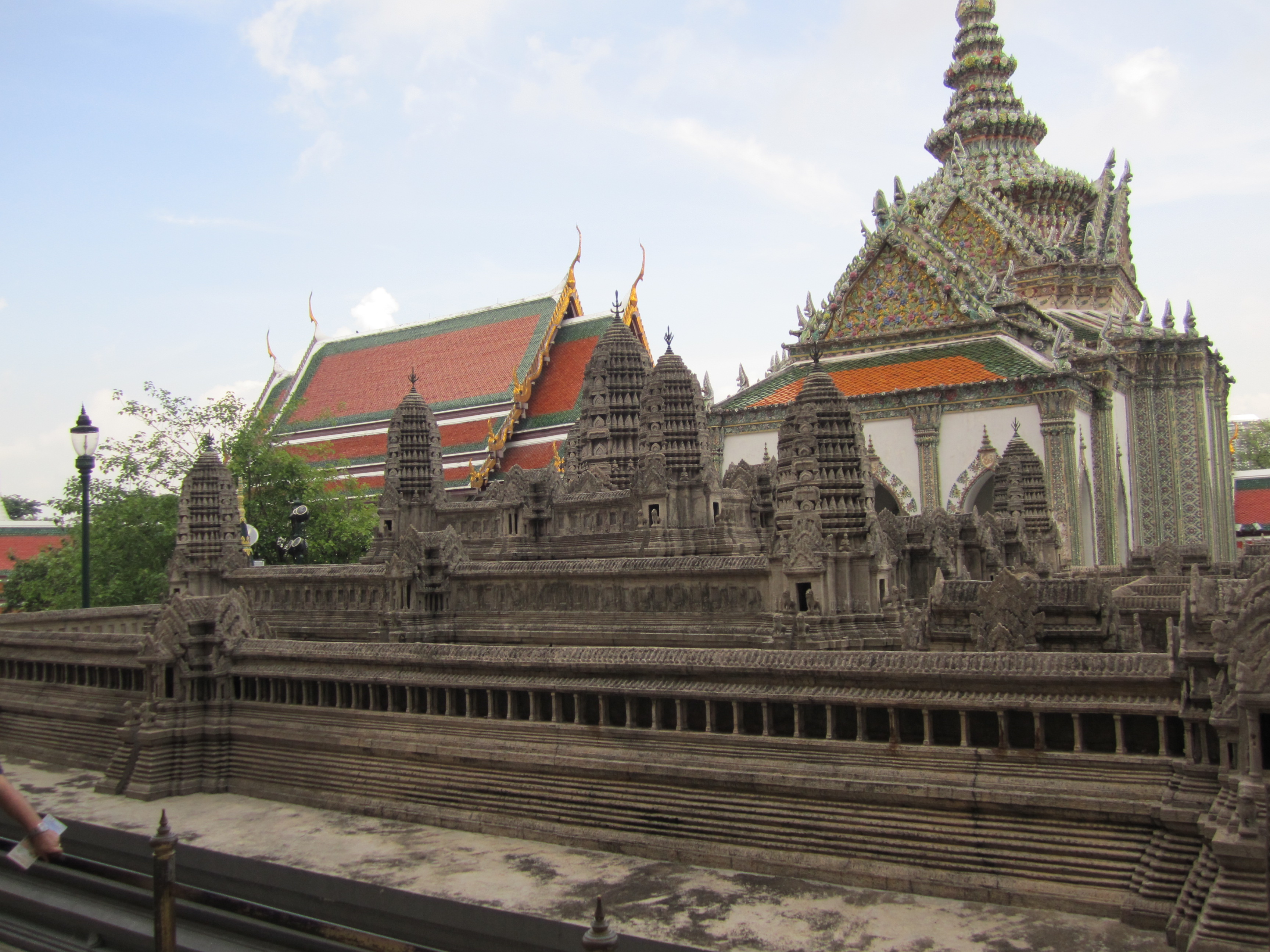 Entrée dans l’univers de l’ultra kitch. On remarque immédiatement l’énorme chedi doré, cachant le sternum de Bouddha. La plupart des temples sont entièrement recouverts de mosaïques, bouts de miroir, morceaux de faïence multicolores, etc … Derrière le chedi doré, se trouve une maquette reproduisant le site d’Angkor Vat (à l’échelle j’imagine) et en pierre. Angkor faisait autrefois partie de la Thaïlande et ce fut longtemps un sujet de querelle avec le Cambodge.