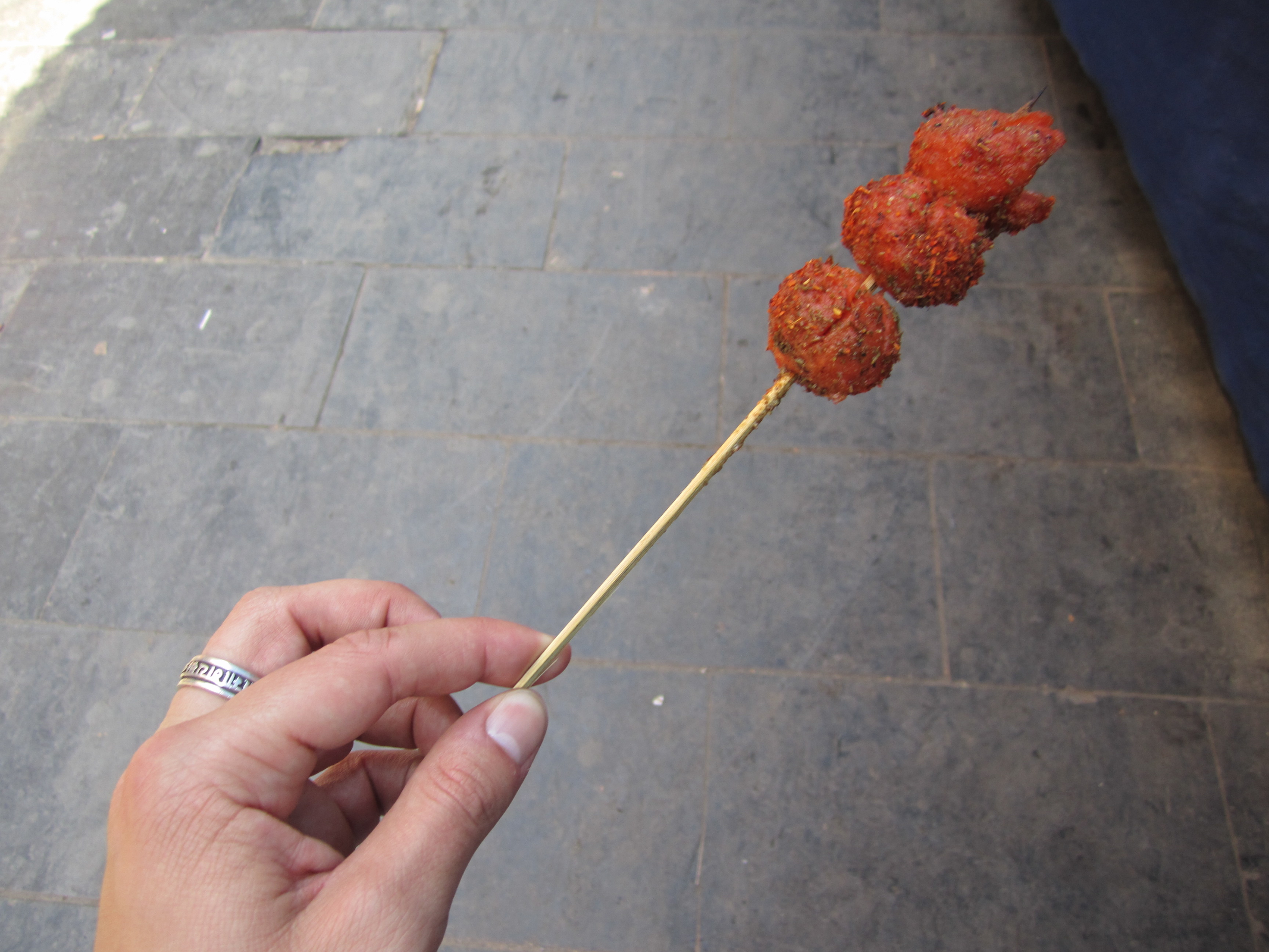 Côté sucré, on n’est pas en manque non plus: on trouve des fruits secs en pagaille (tous les fruits y passent aussi !), des beignets à je-sais-pas-quoi, des petits bouts de pâte de riz badigeonnés de sauce puis sucrés, tous les gâteaux qu’on peut trouver au Maroc, etc …