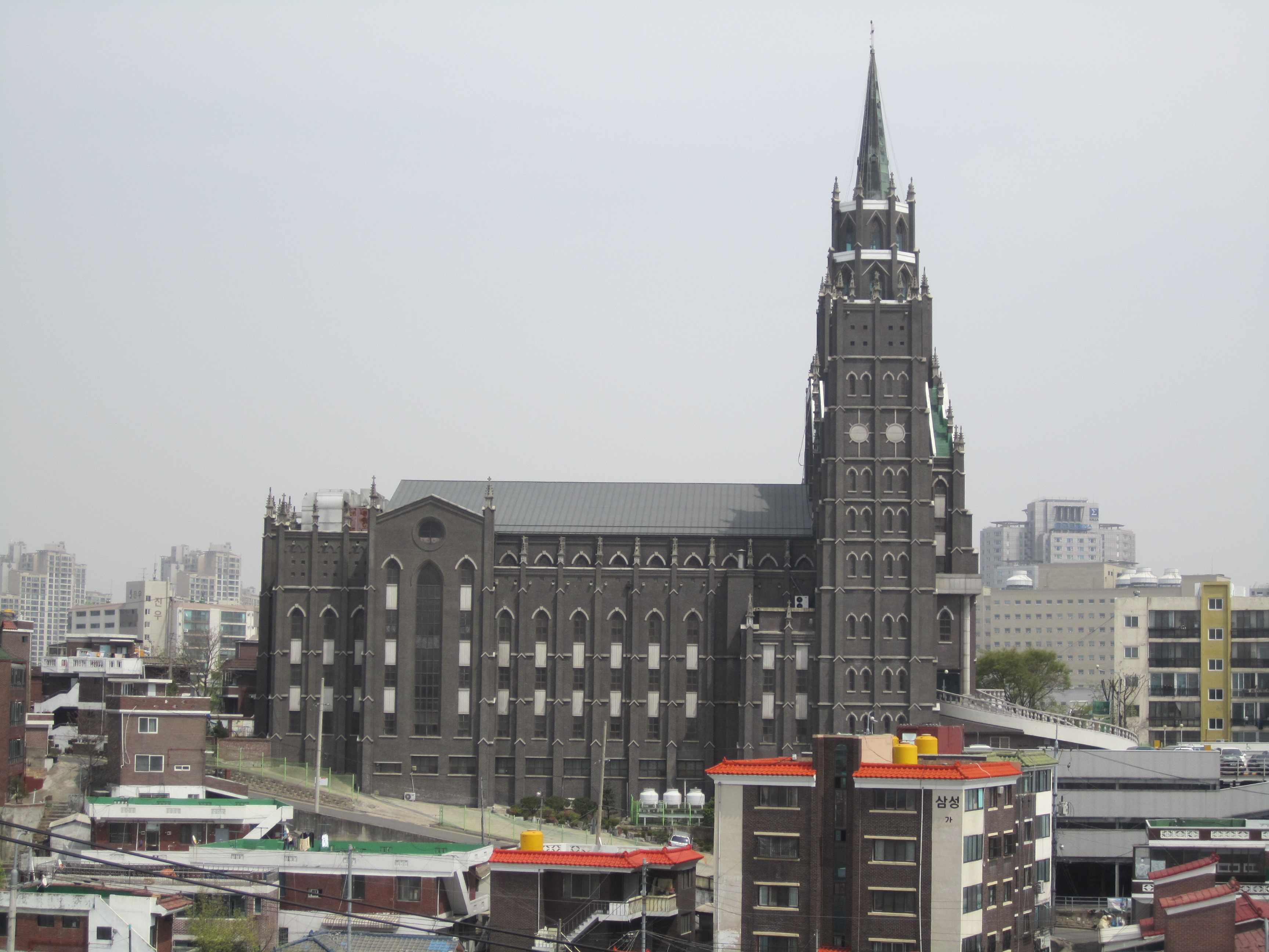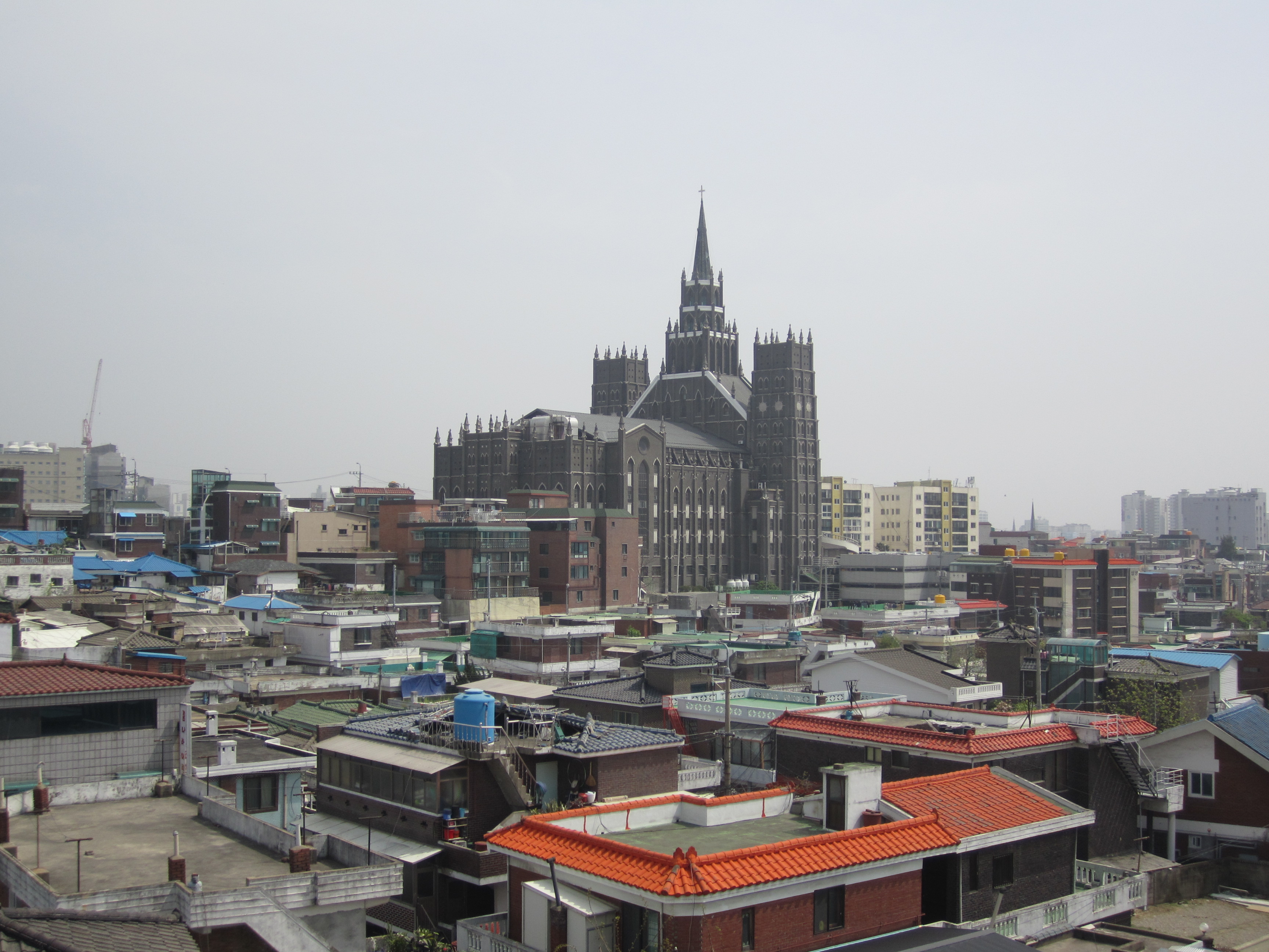 Depuis le mur de la forteresse, on a pu apercevoir cette immense cathédrale de pierres noires trônant au milieu de Suwon. Elle est vraiment impressionnante !