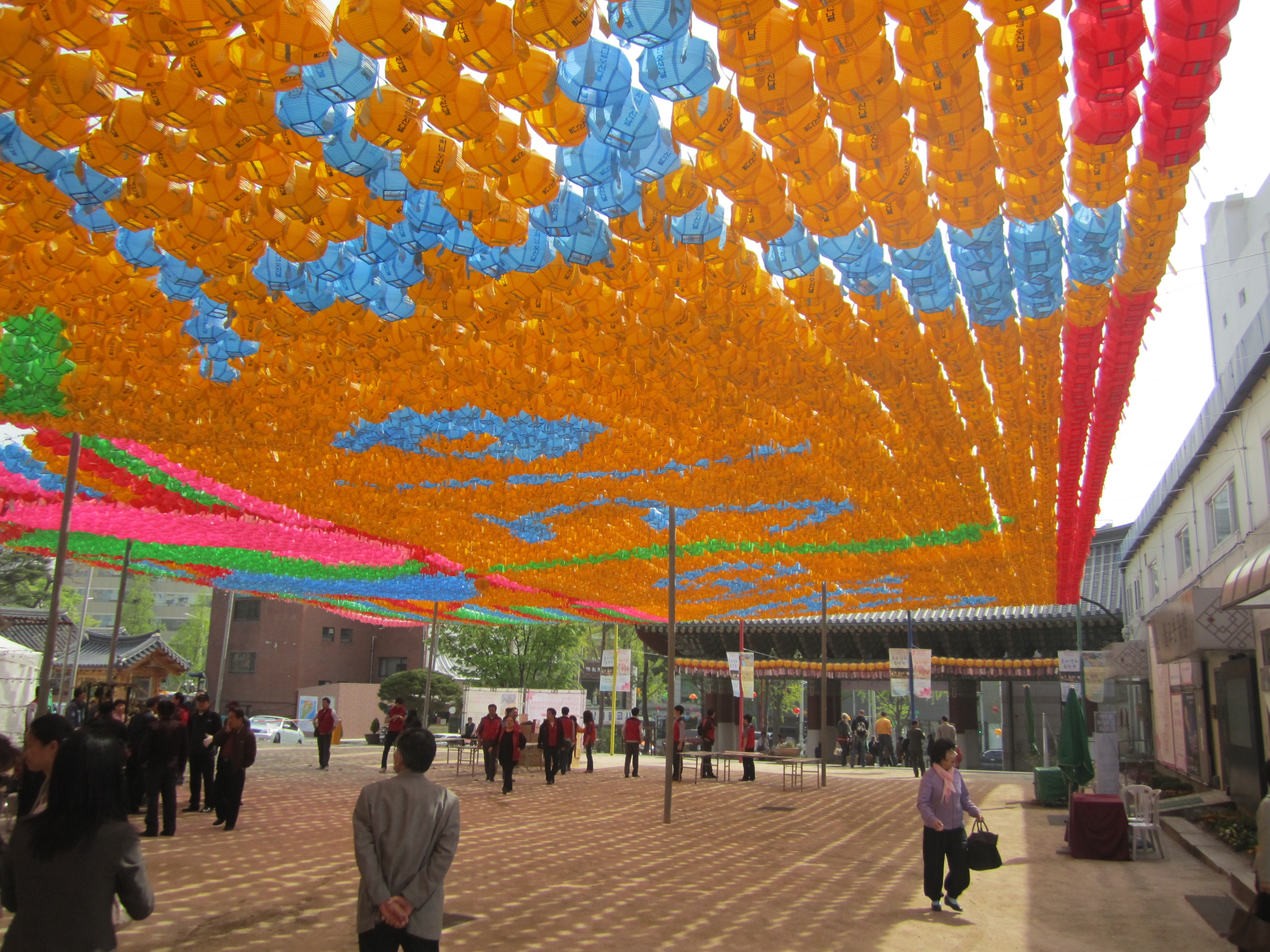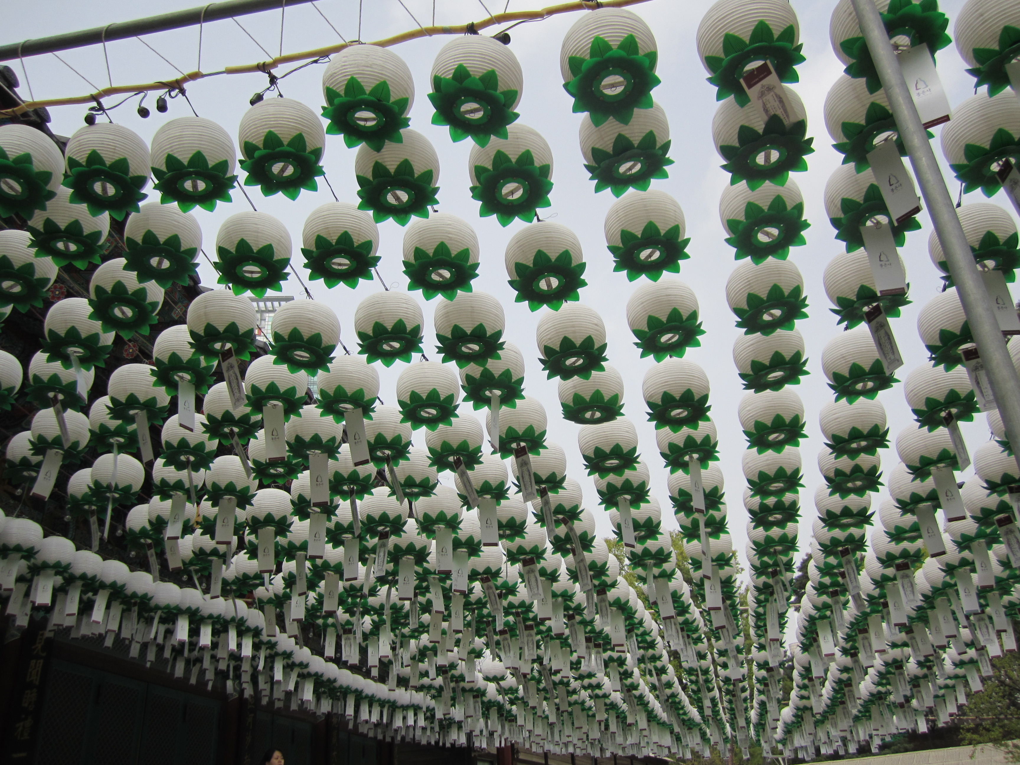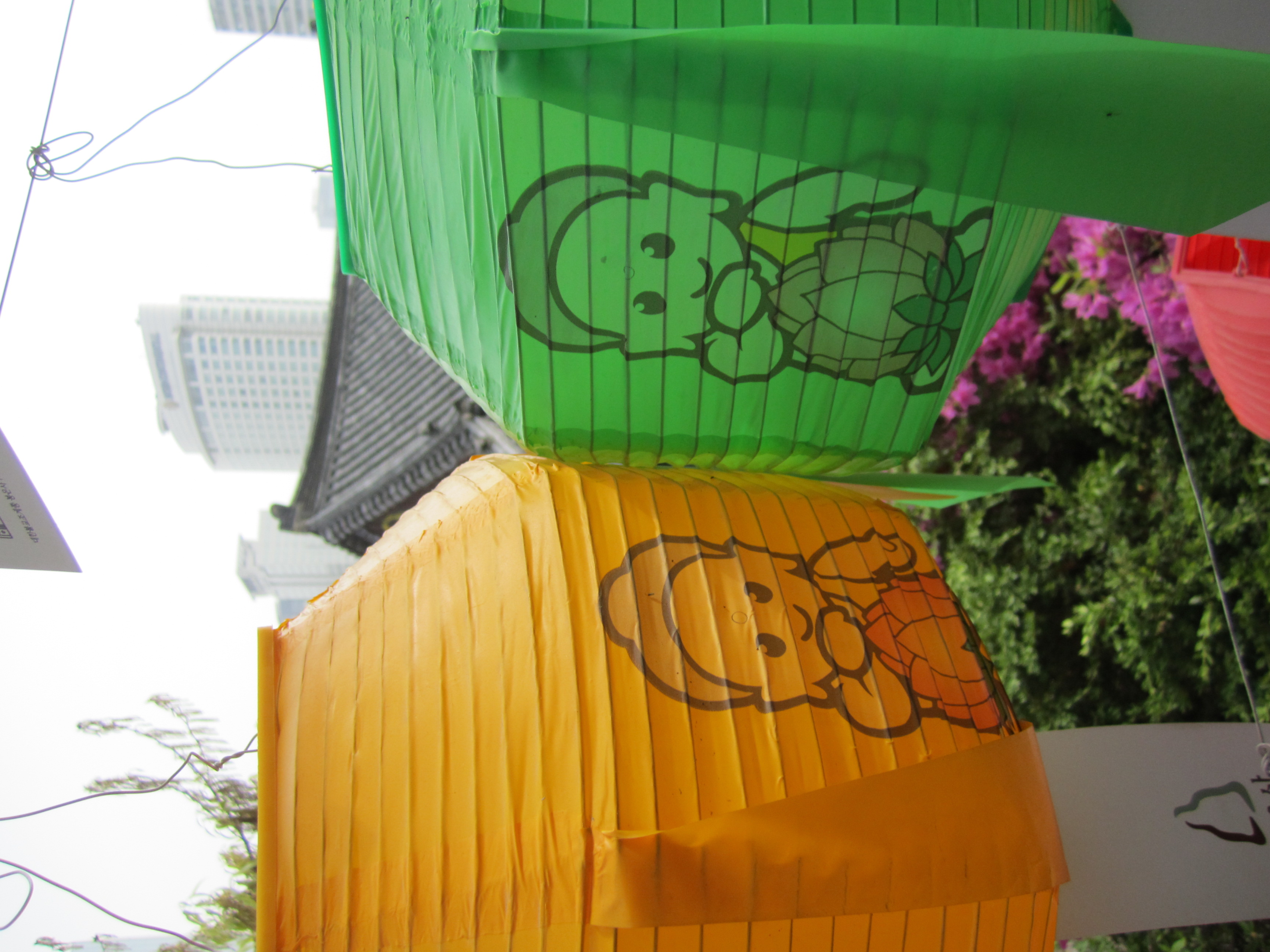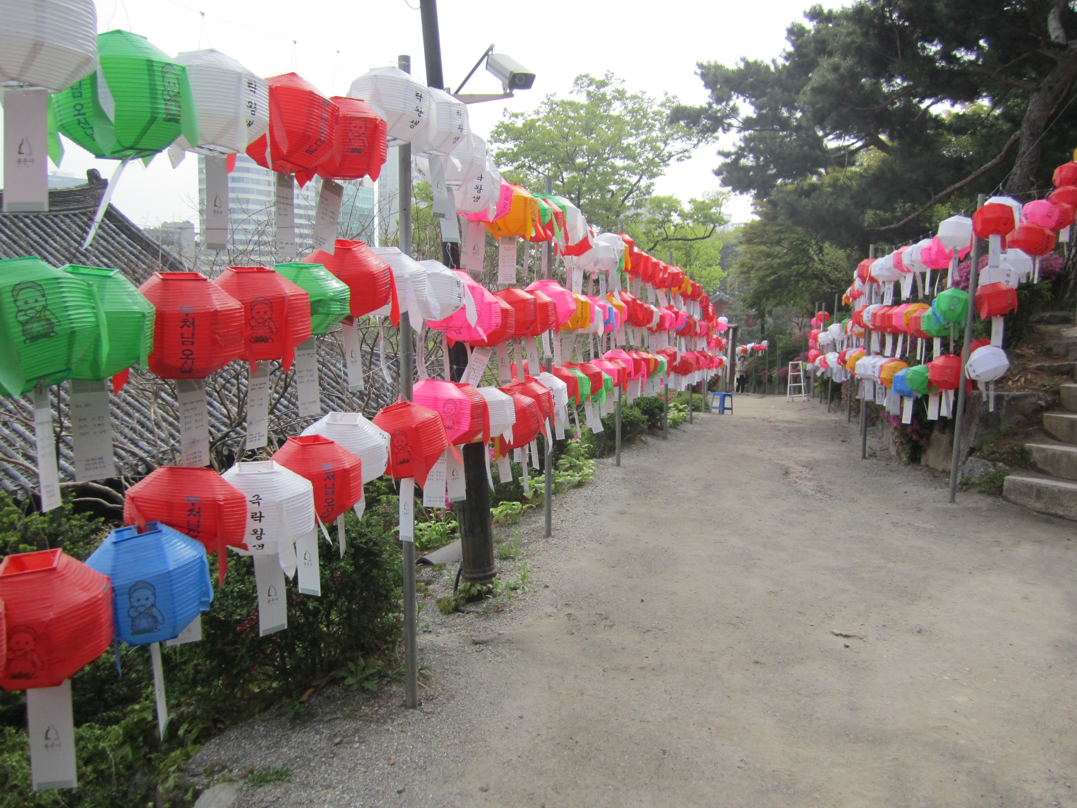 On est tombé au bon moment pour visiter les temples bouddhiques de Séoul. En effet, on y était juste avant l'anniversaire de Bouddha, le 10 mai (date qui change chaque année en fonction du calendrier lunaire). Des lanternes en papier en forme de lotus et de toutes les couleurs s'installent dans tous les temples pendant un mois. Elles habillent toute la ville.