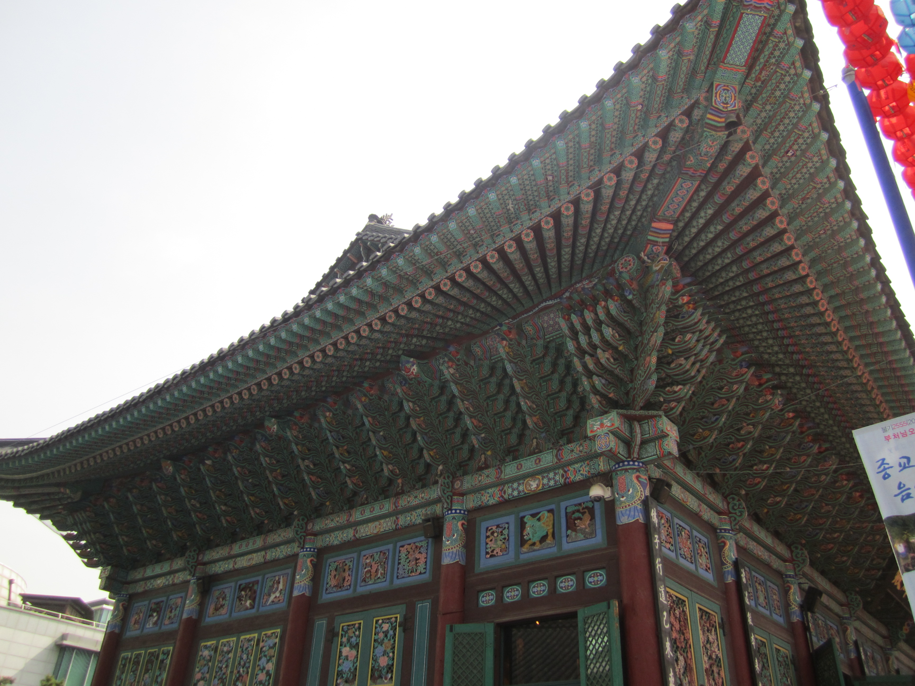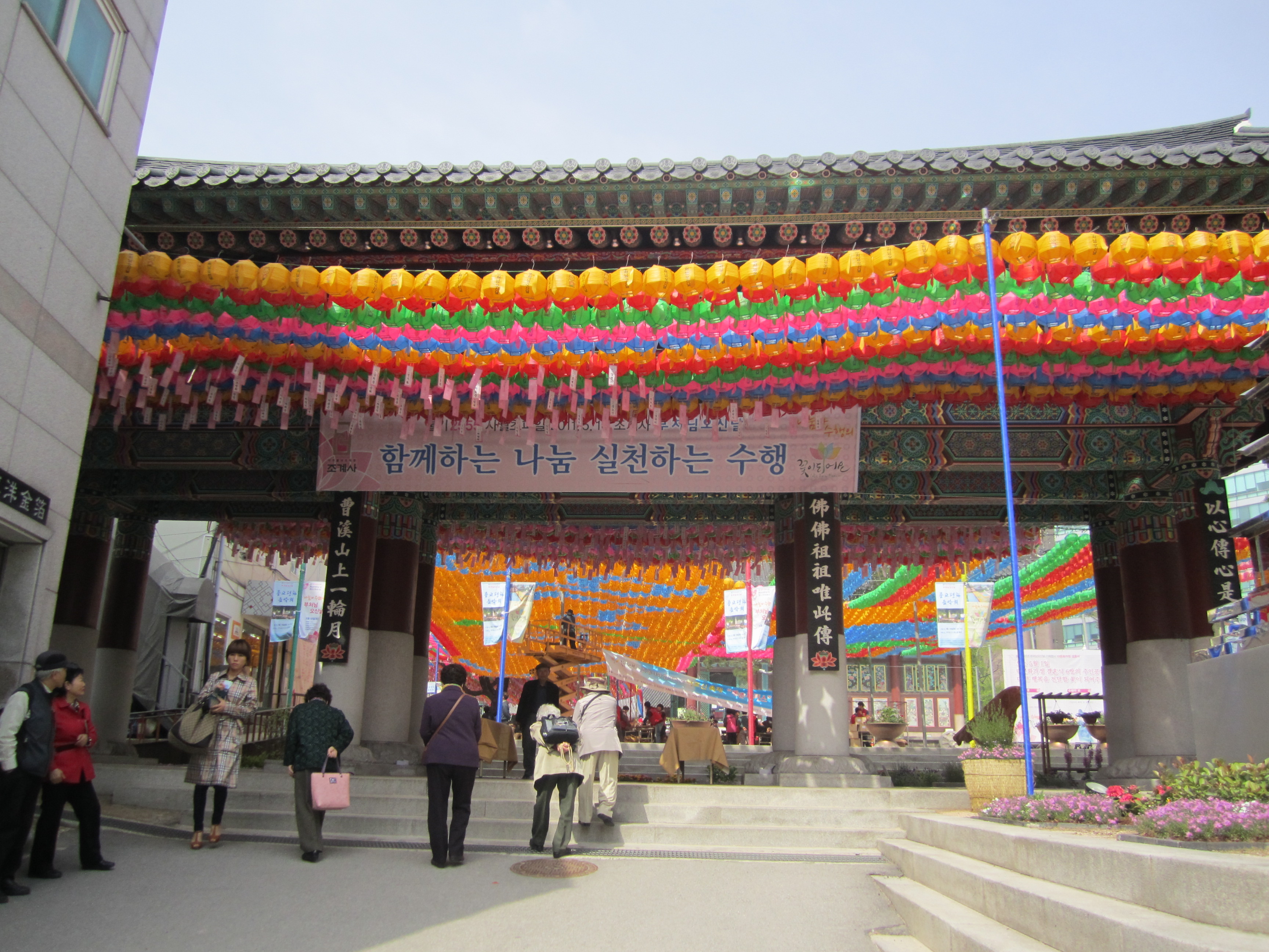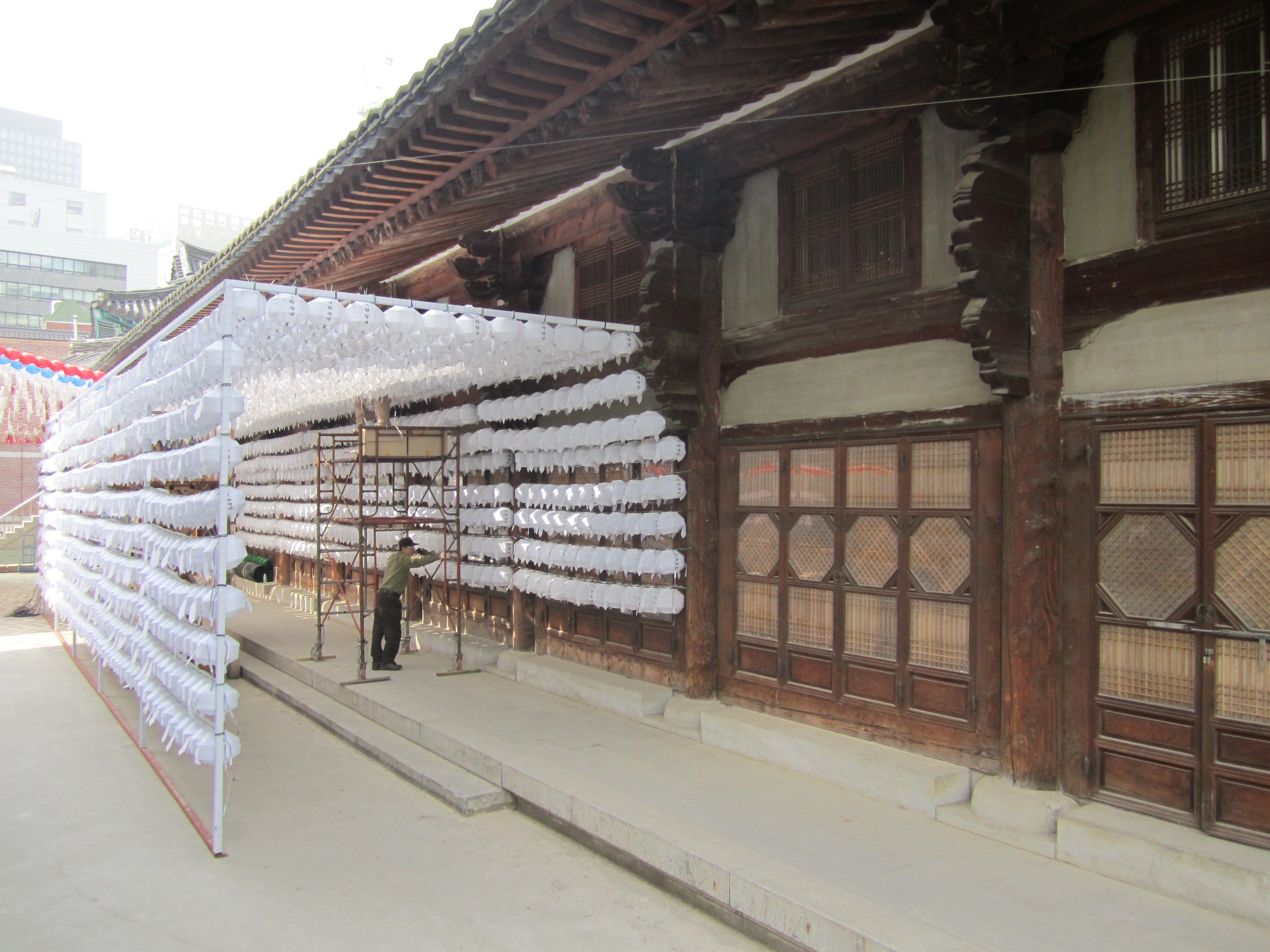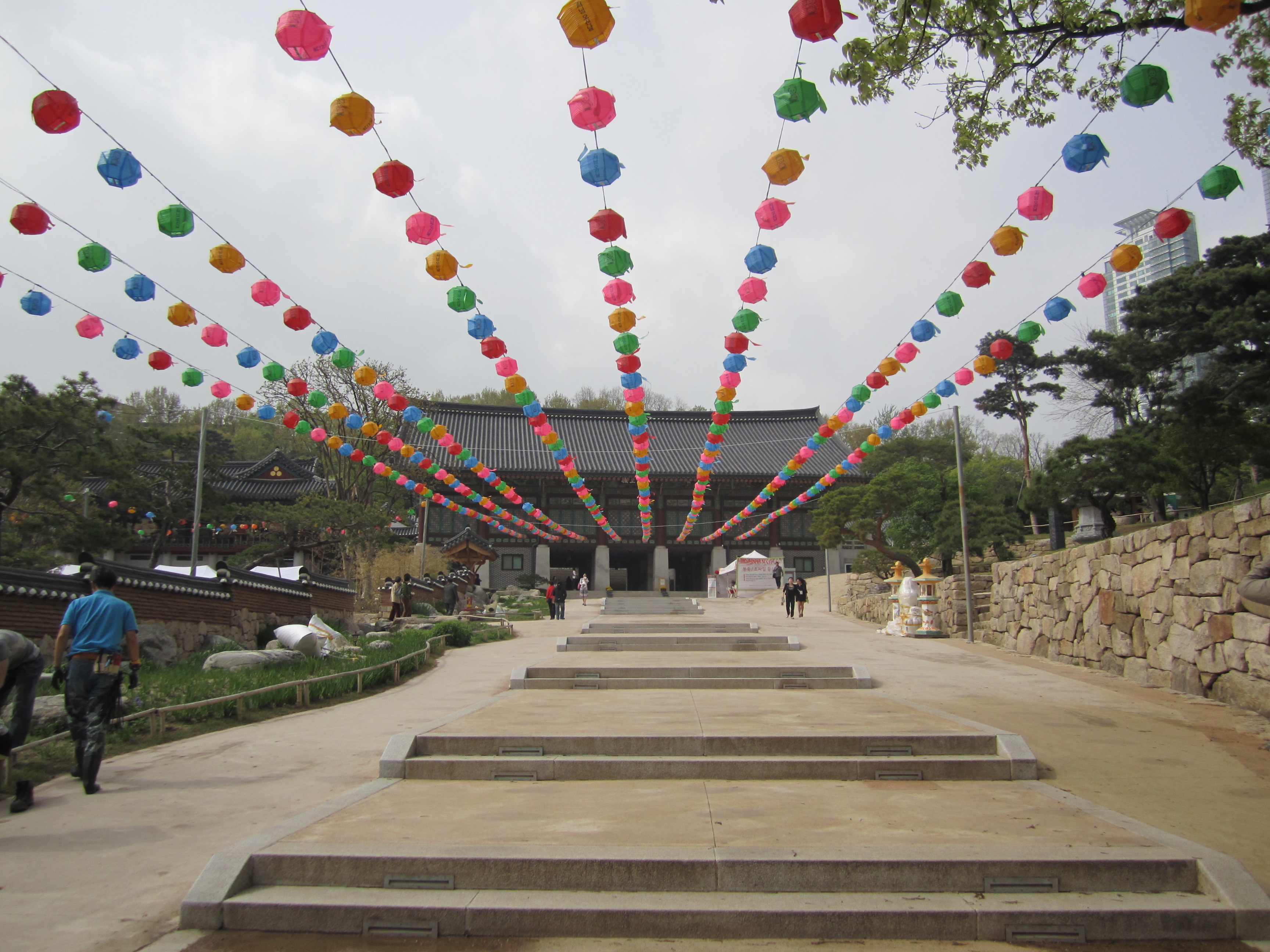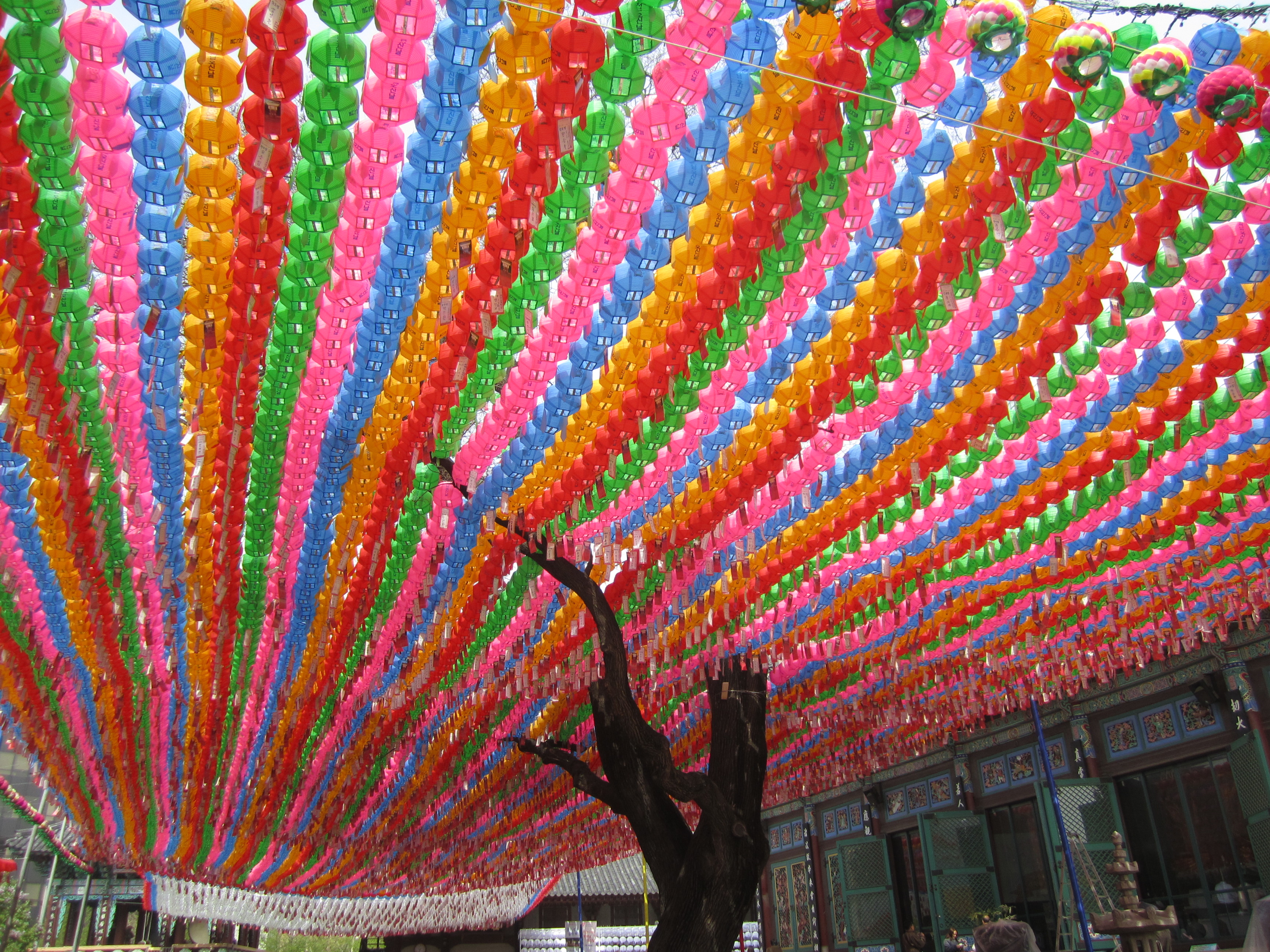 On est tombé au bon moment pour visiter les temples bouddhiques de Séoul. En effet, on y était juste avant l'anniversaire de Bouddha, le 10 mai (date qui change chaque année en fonction du calendrier lunaire). Des lanternes en papier en forme de lotus et de toutes les couleurs s'installent dans tous les temples pendant un mois. Elles habillent toute la ville.
