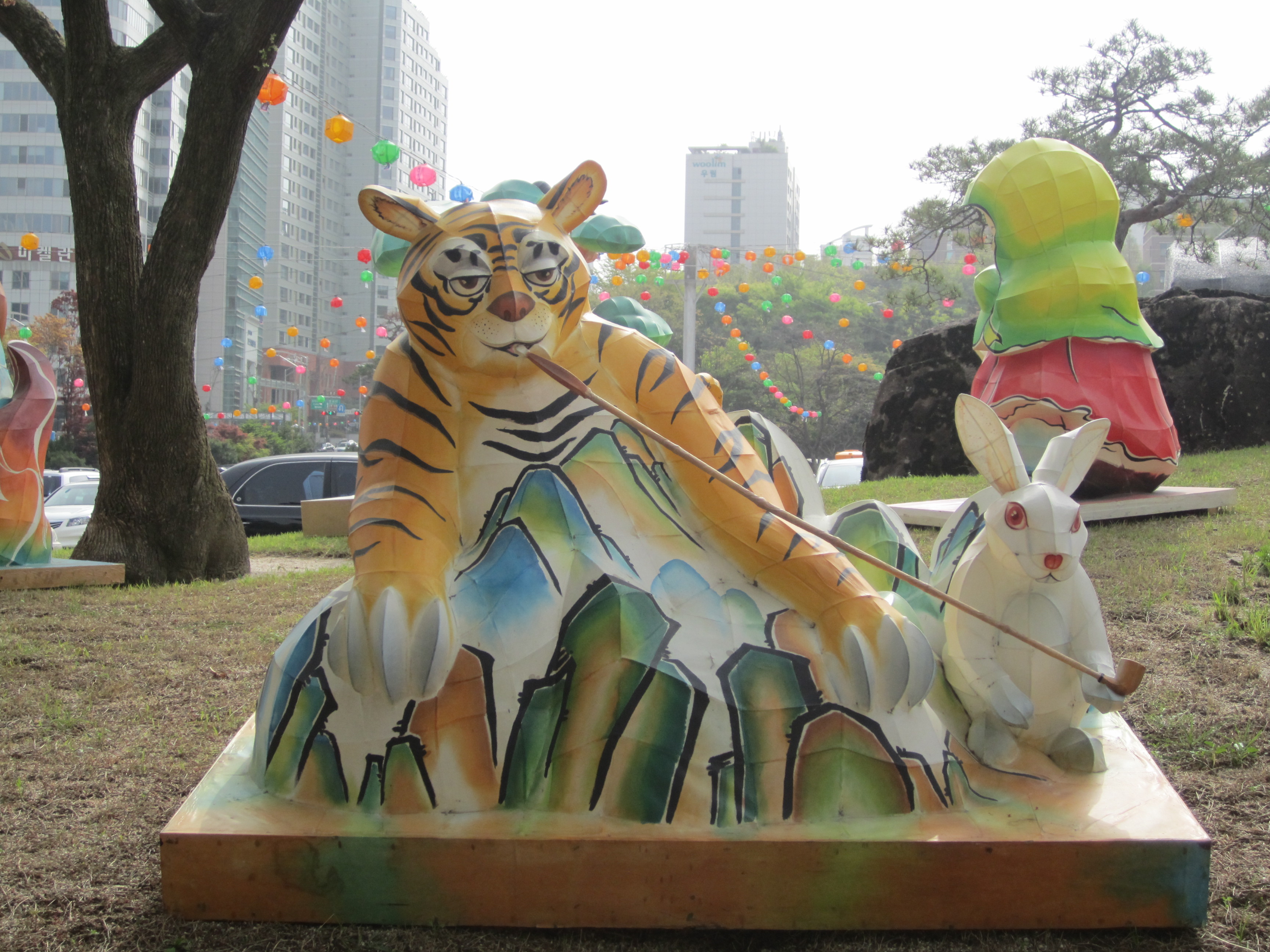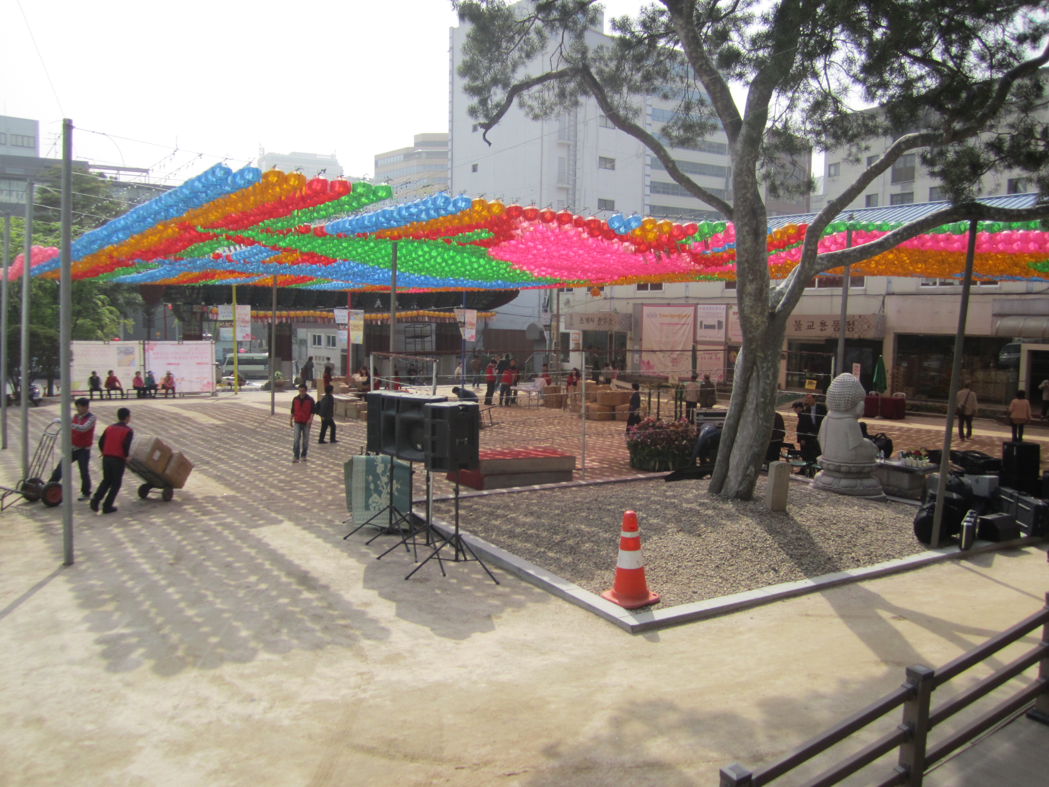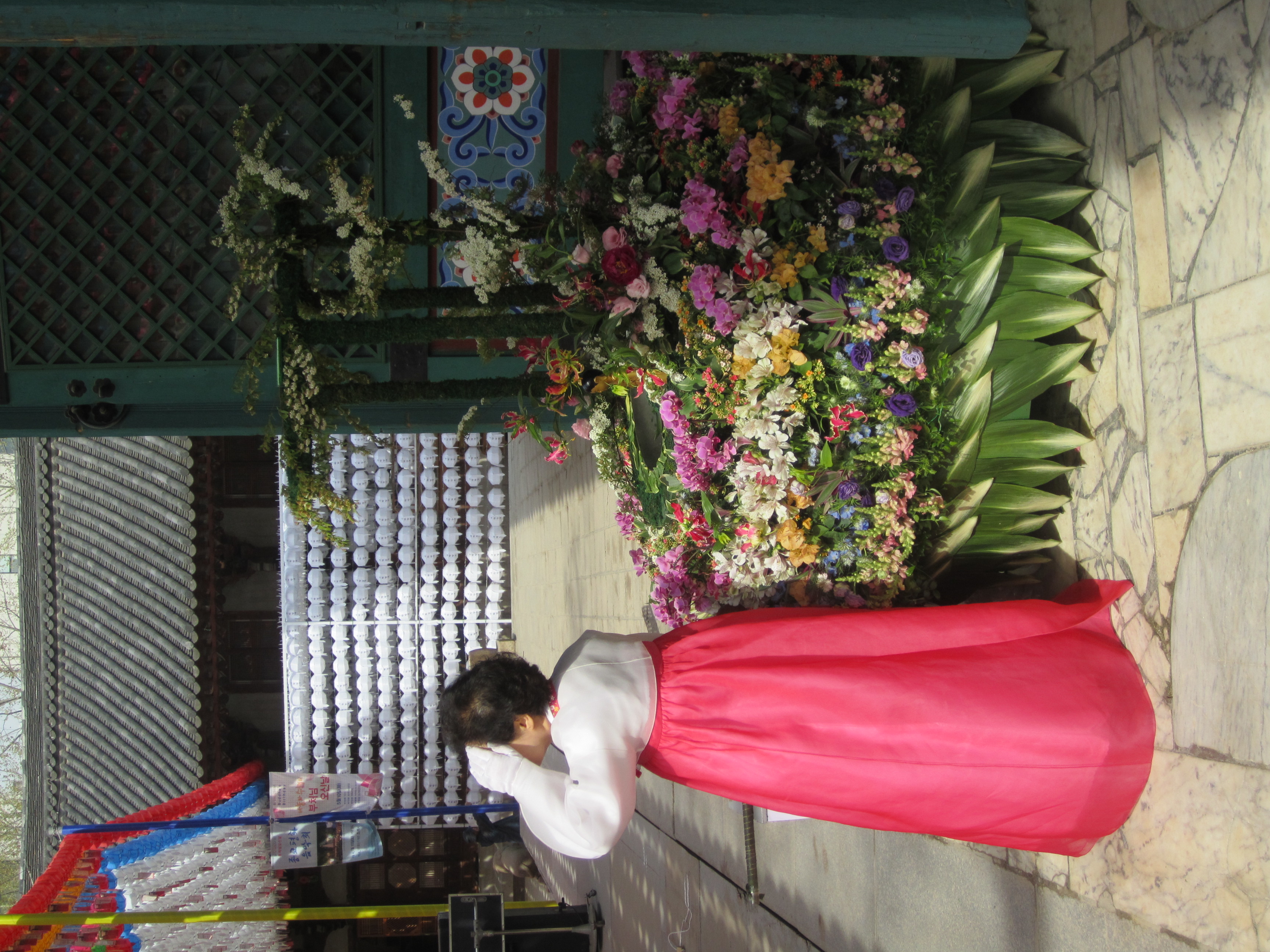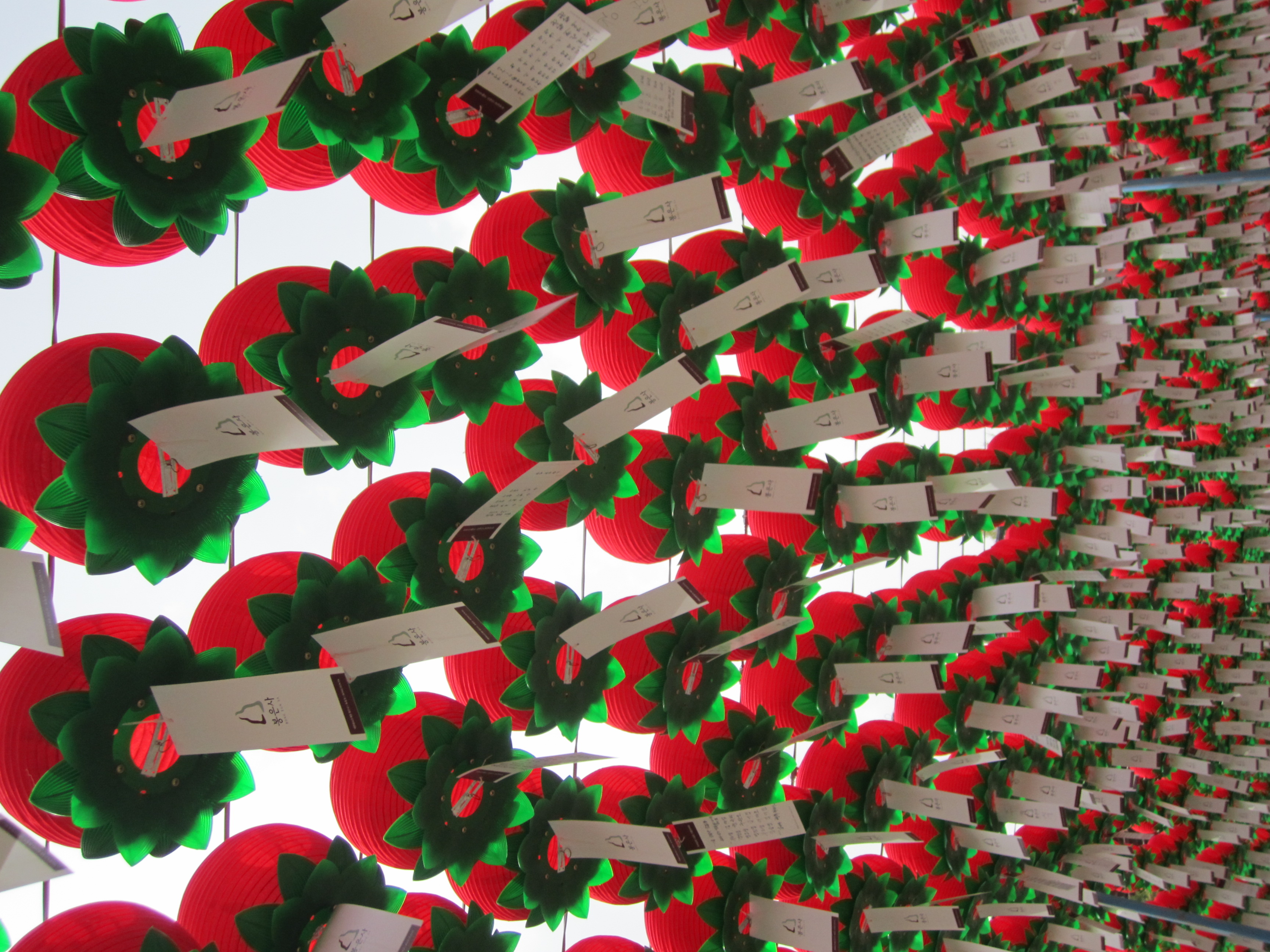 On est tombé au bon moment pour visiter les temples bouddhiques de Séoul. En effet, on y était juste avant l'anniversaire de Bouddha, le 10 mai (date qui change chaque année en fonction du calendrier lunaire). Des lanternes en papier en forme de lotus et de toutes les couleurs s'installent dans tous les temples pendant un mois. Elles habillent toute la ville.