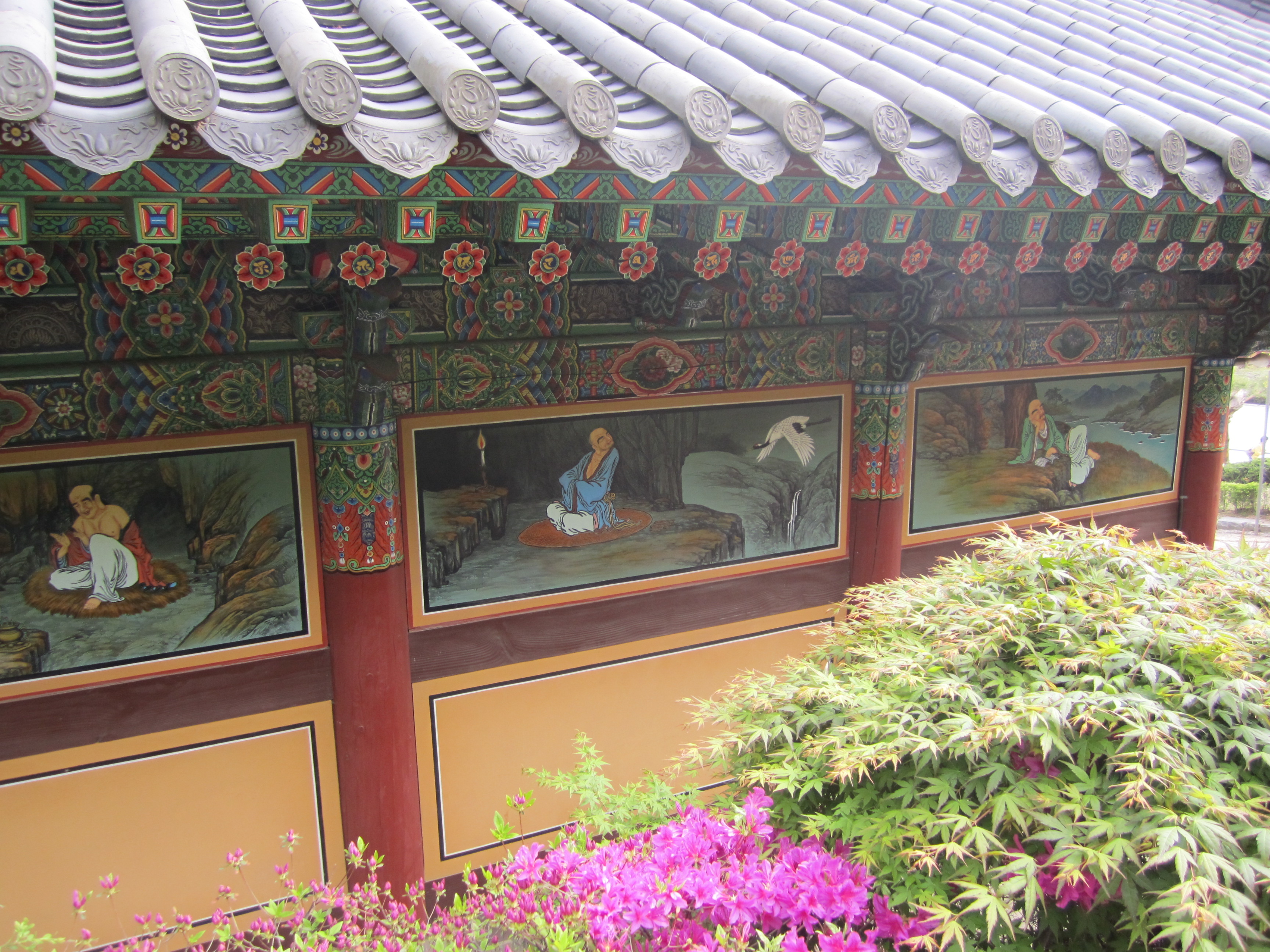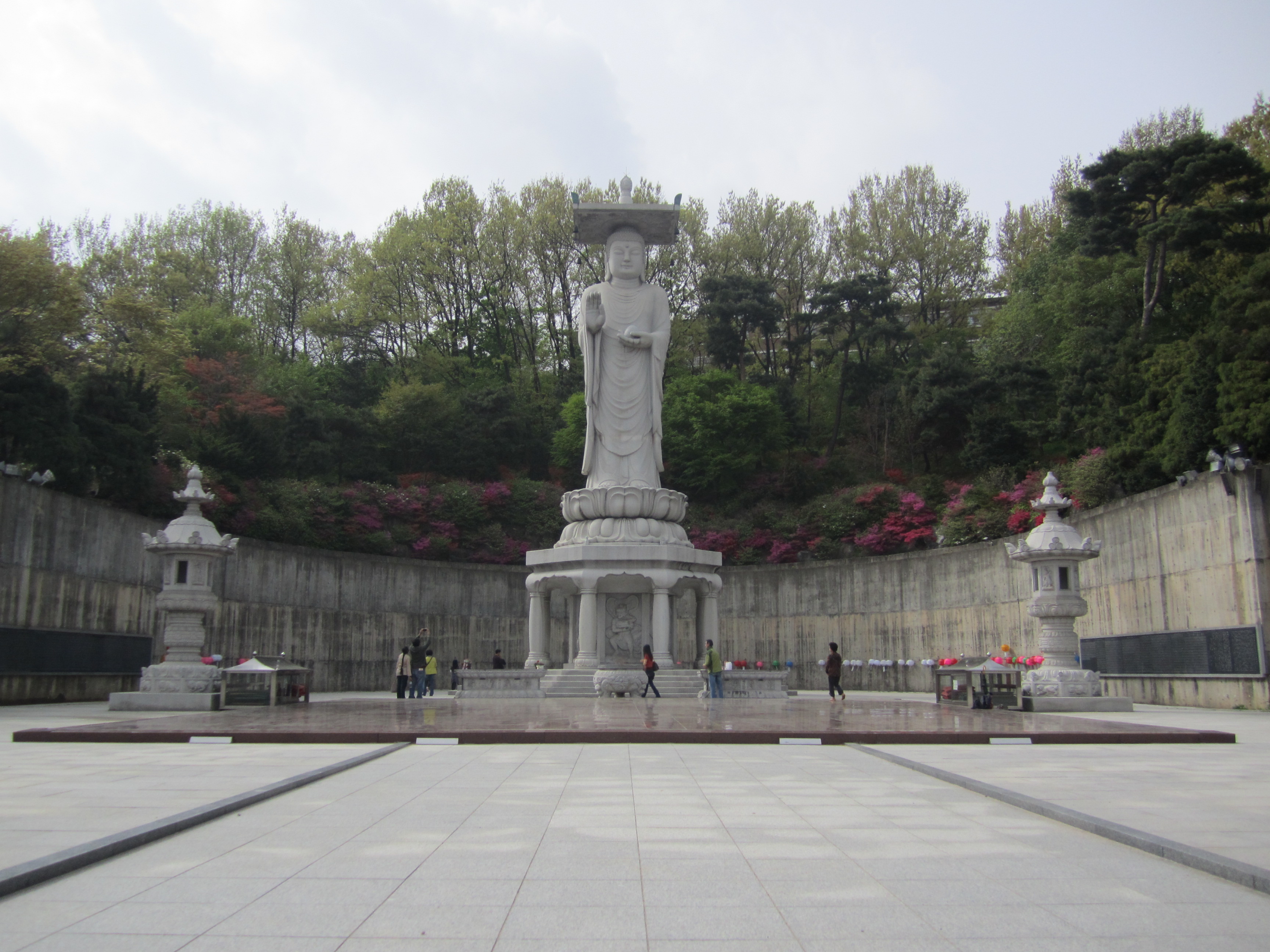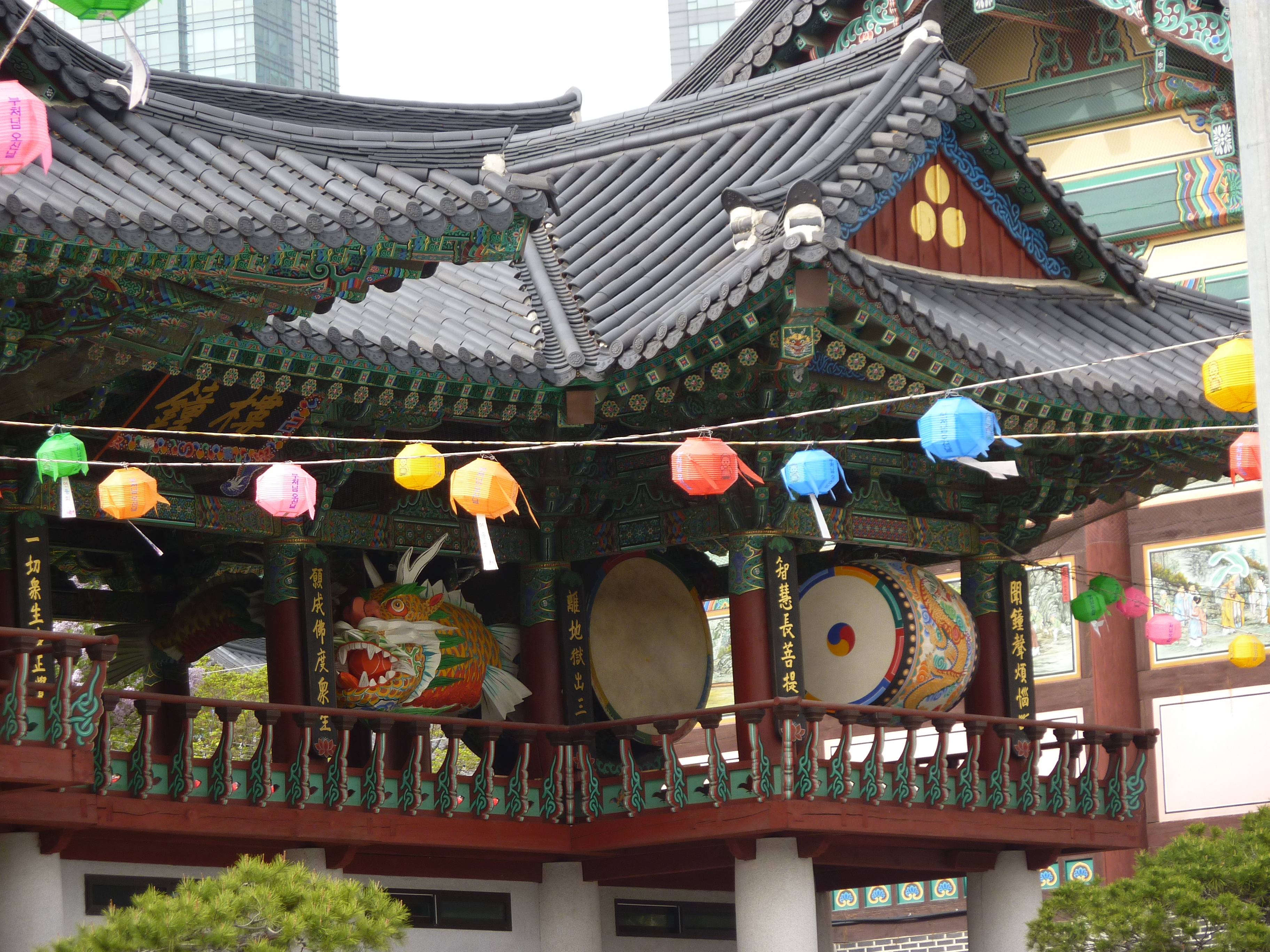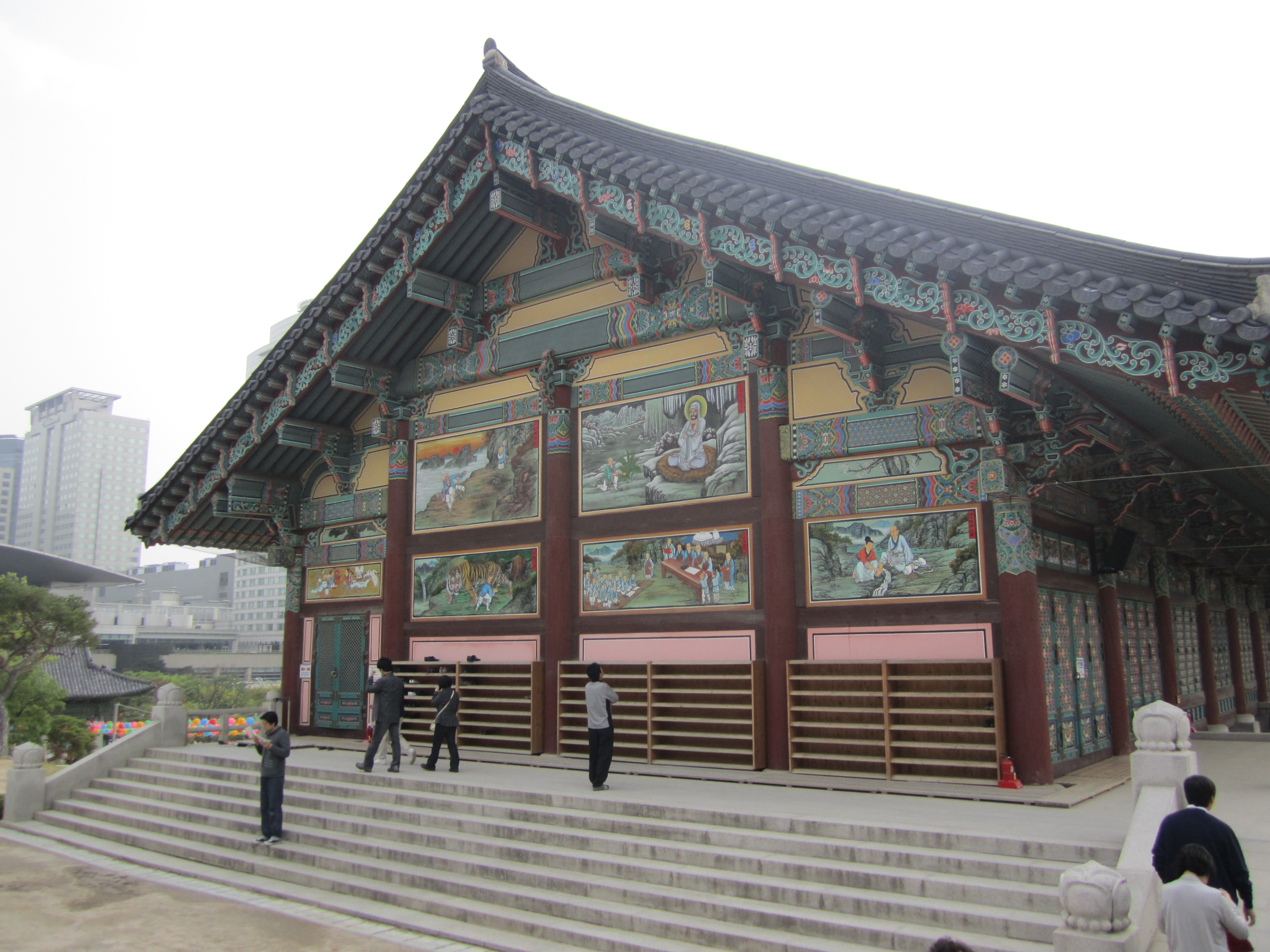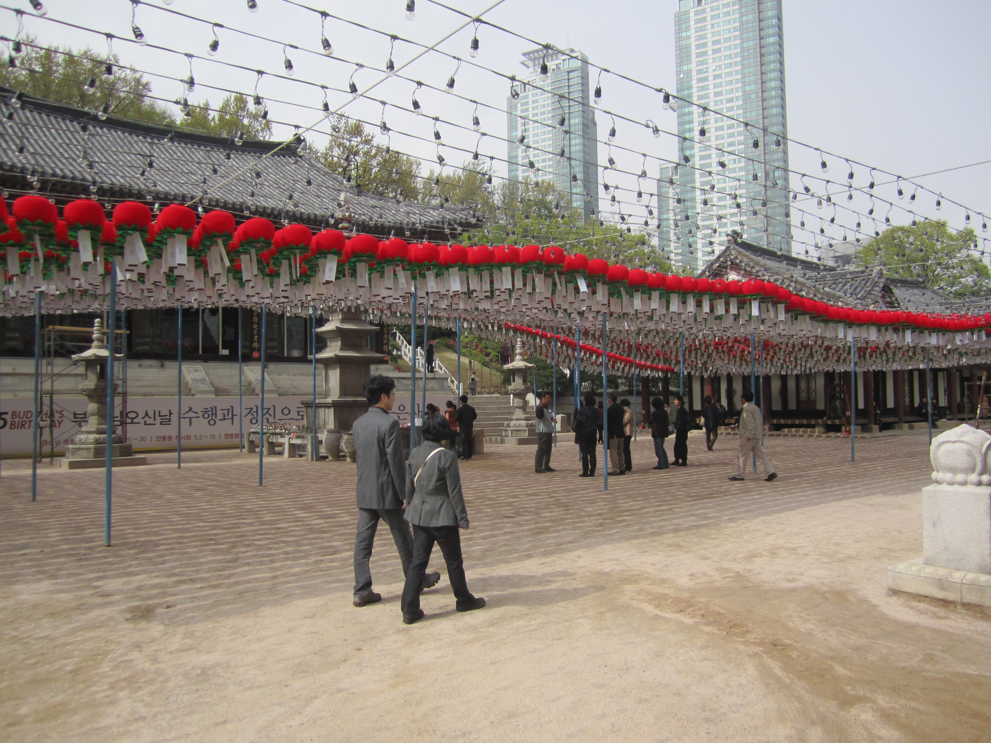 L'intérêt de ce temple, c'est qu'il se trouve au coeur de Séoul, au milieu d'immenses buildings. En face, on trouve notamment le COEX mall, le plus grand centre commercial d'Asie avec une superficie de 85 000m² (un cinéma de 16 salles, un aquarium, une énorme librairie, un théâtre et des centaines de boutiques).