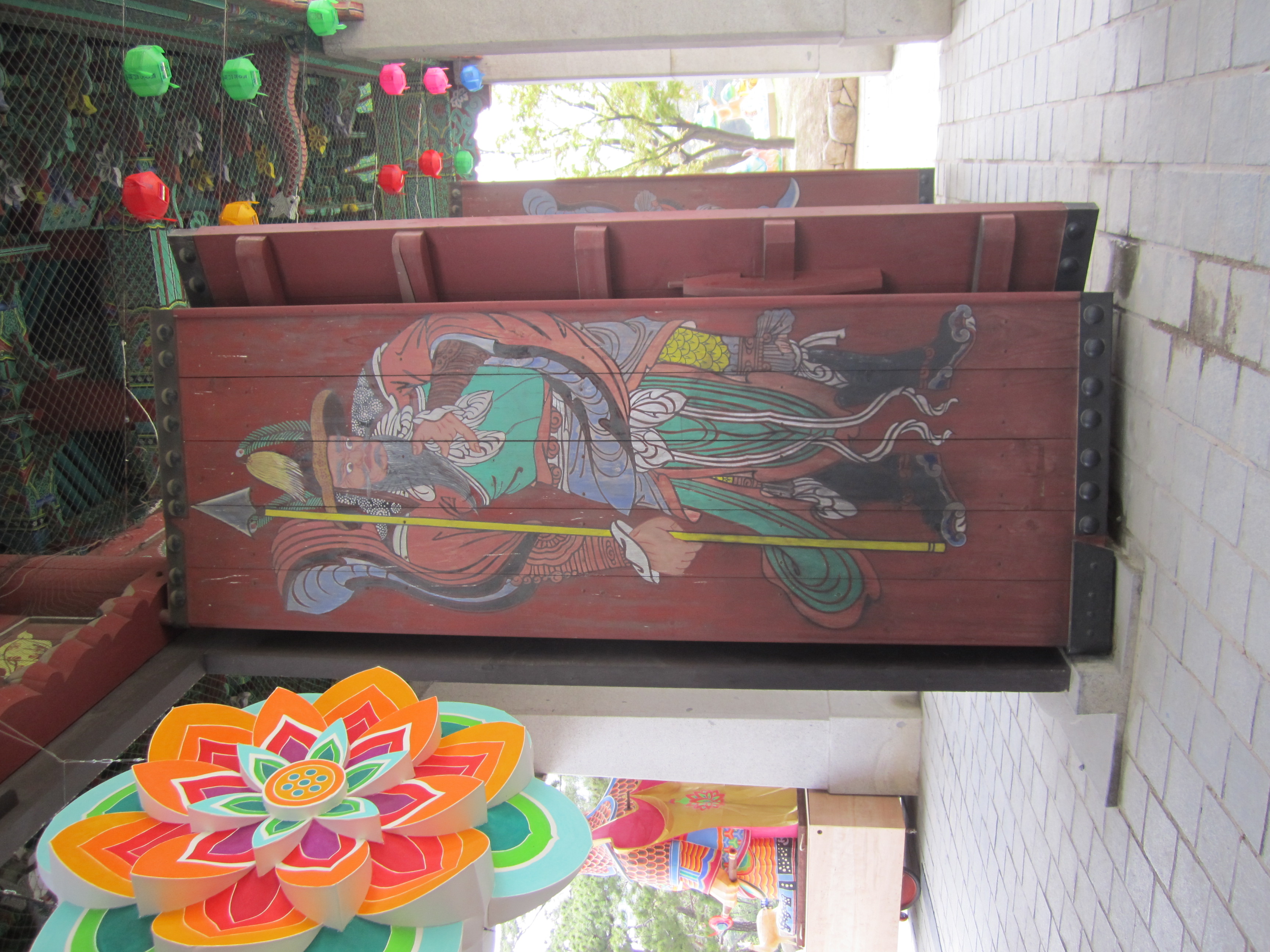 Le premier temple que nous avons visité était vraiment très décoré. Dès l'entrée, on remarque des énormes guirlandes et la porte d'entrée est gardée par 4 grandes statues de papier. C'est vraiment joli ces lanternes rouges, vertes, blanches... Il faut savoir que la plupart des lanternes sont déposées par les visiteurs: ils y accrochent une prière ou un voeux. Les murs extérieurs des pavillons sont tous décorés de peintures. Ces dessins retracent la vie de Bouddha, depuis sa naissance jusqu'à son ascension spirituelle.