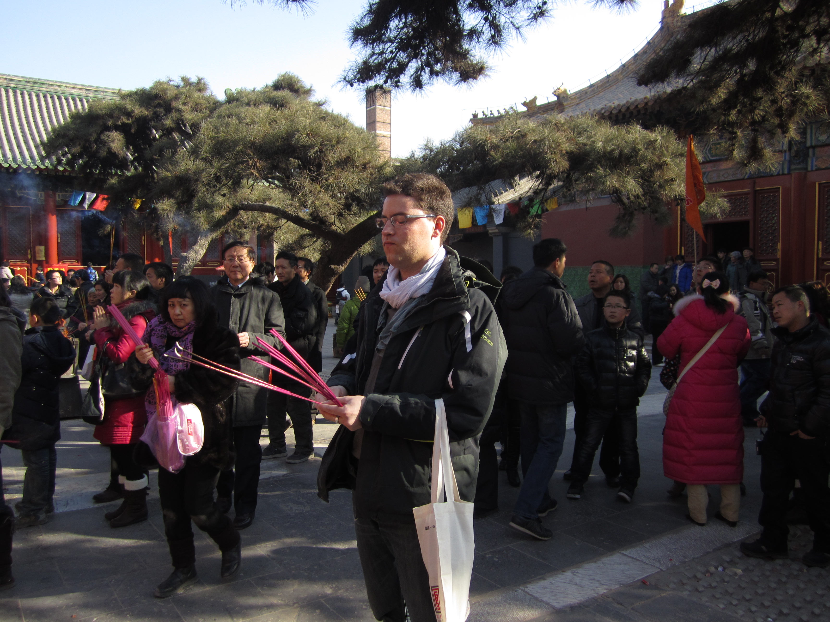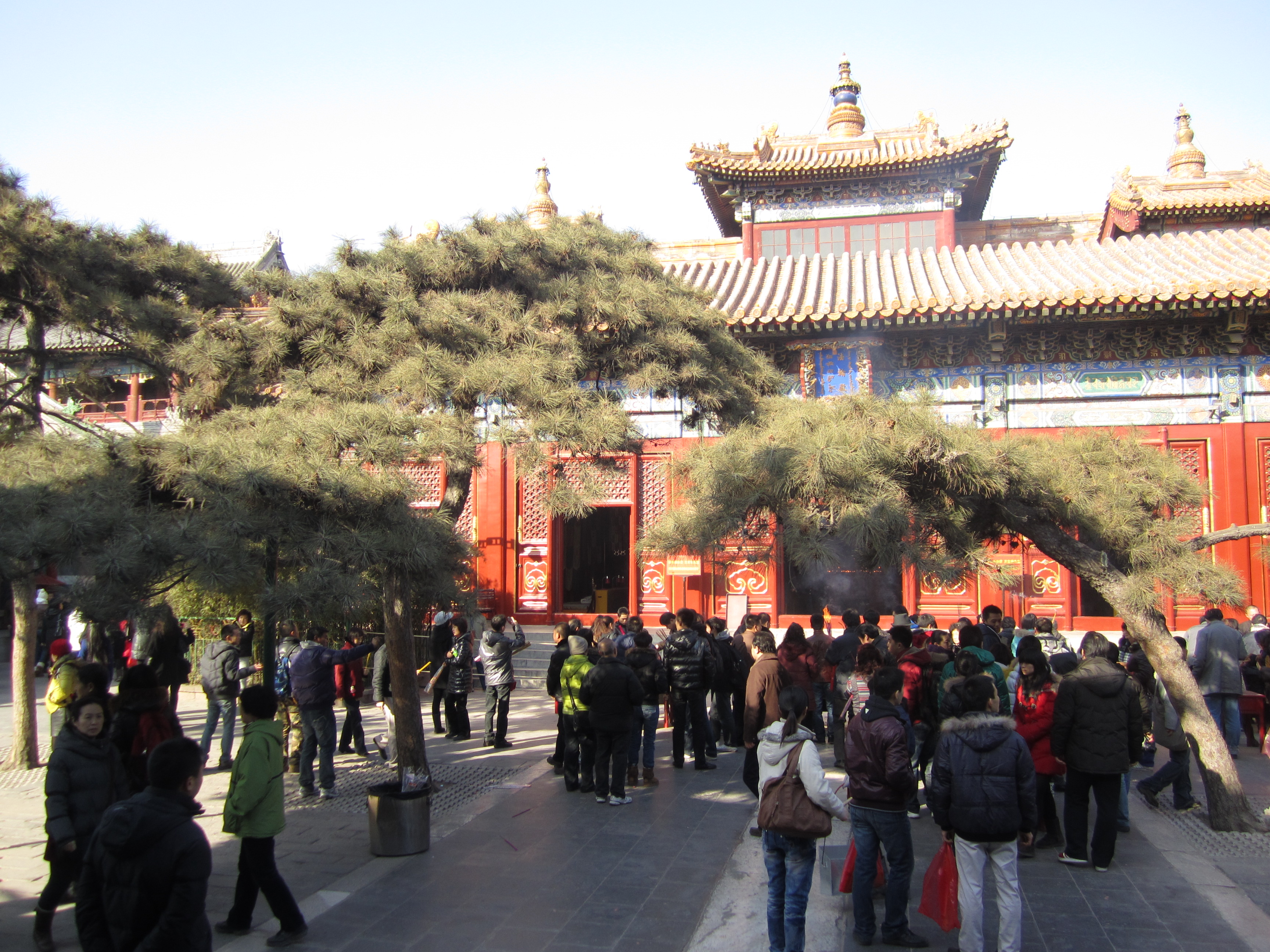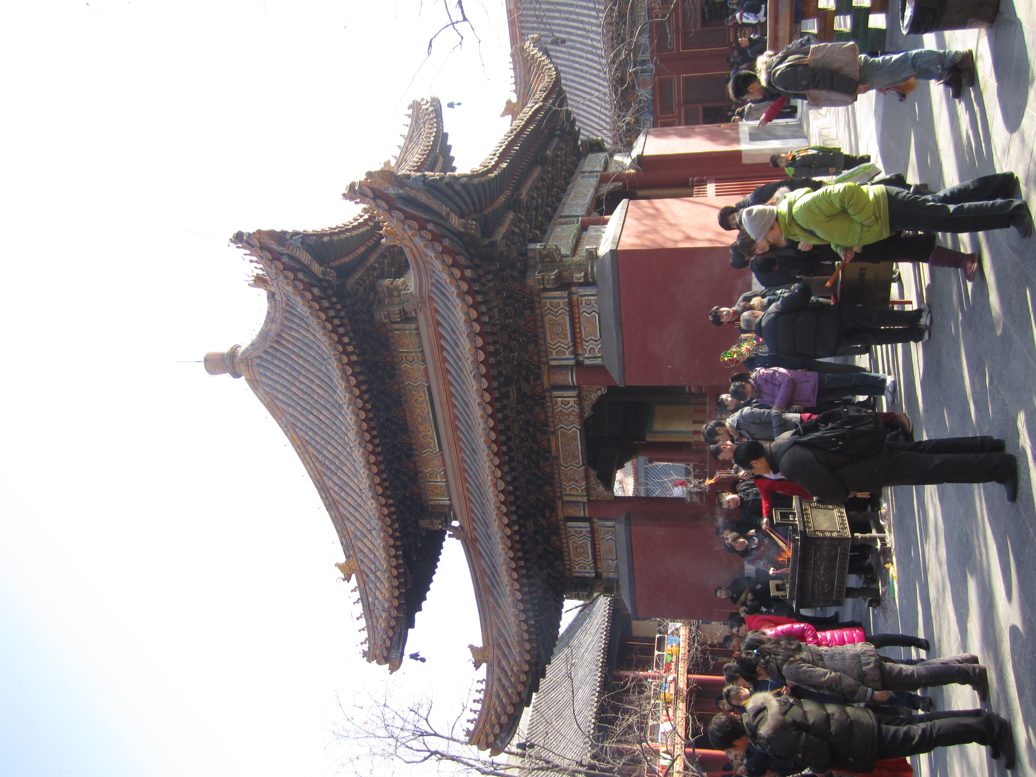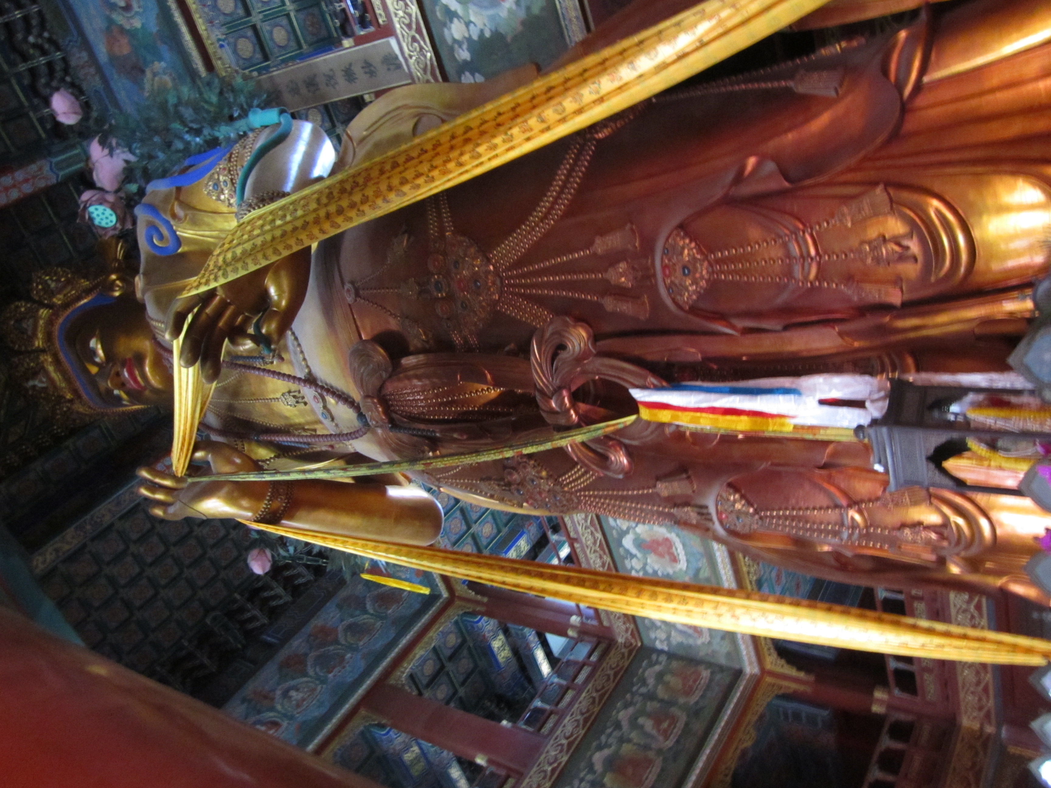 Le temple des Lamas est composé de plusieurs salles/pavillons. Dans chaque pavillon, on retrouve un ou des Bouddhas. Les encens servent aussi d’offrande, on les dépose (toujours par 3) et éteints au pied des Bouddhas. Certains déposent même des fruits. Dans le dernier pavillon, le pavillon des Dix Mille Bonheurs, le 7ème dalaï-lama a offert une statue géante à l’empereur Qianlong. Il fait 26m de hauteur et 8m de diamètre, provenant d’un seul tronc de santal blanc !