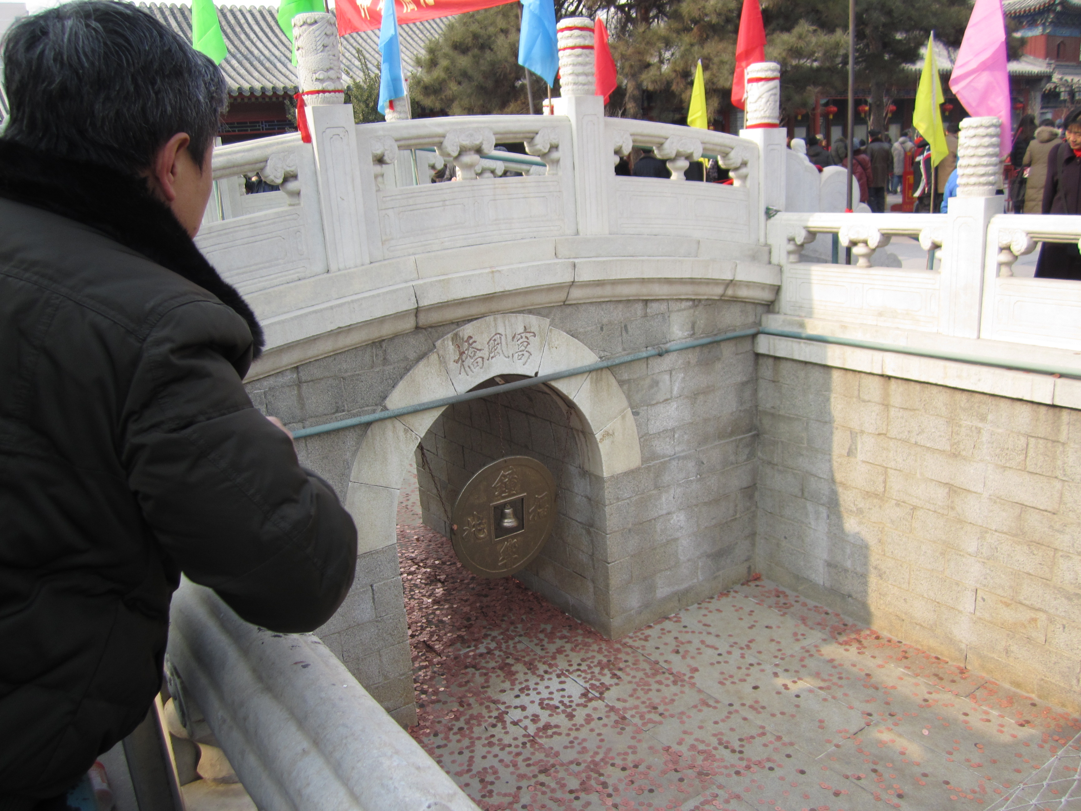 A l’entrée du temple, un attroupement de chinois est formé autour d’une espèce de fossé. Ils jettent en fait des fausses pièces, qu’ils ont acheté par lots de 20, contre deux gongs placés sous le pont, qui traverse le fossé. Ca porte chance, il paraît. En tout cas, ils y jouent beaucoup, ça fait un sacré raffut.