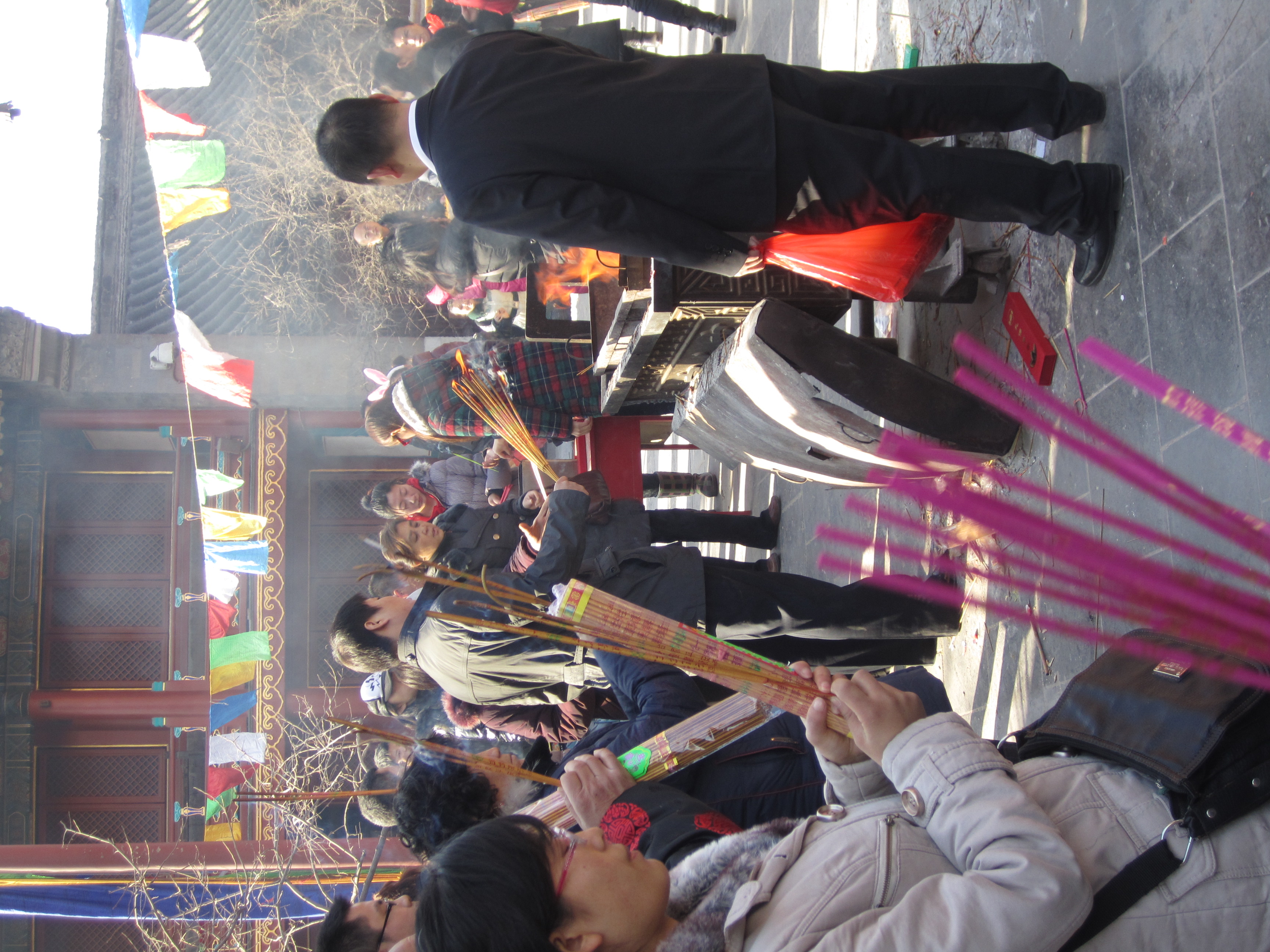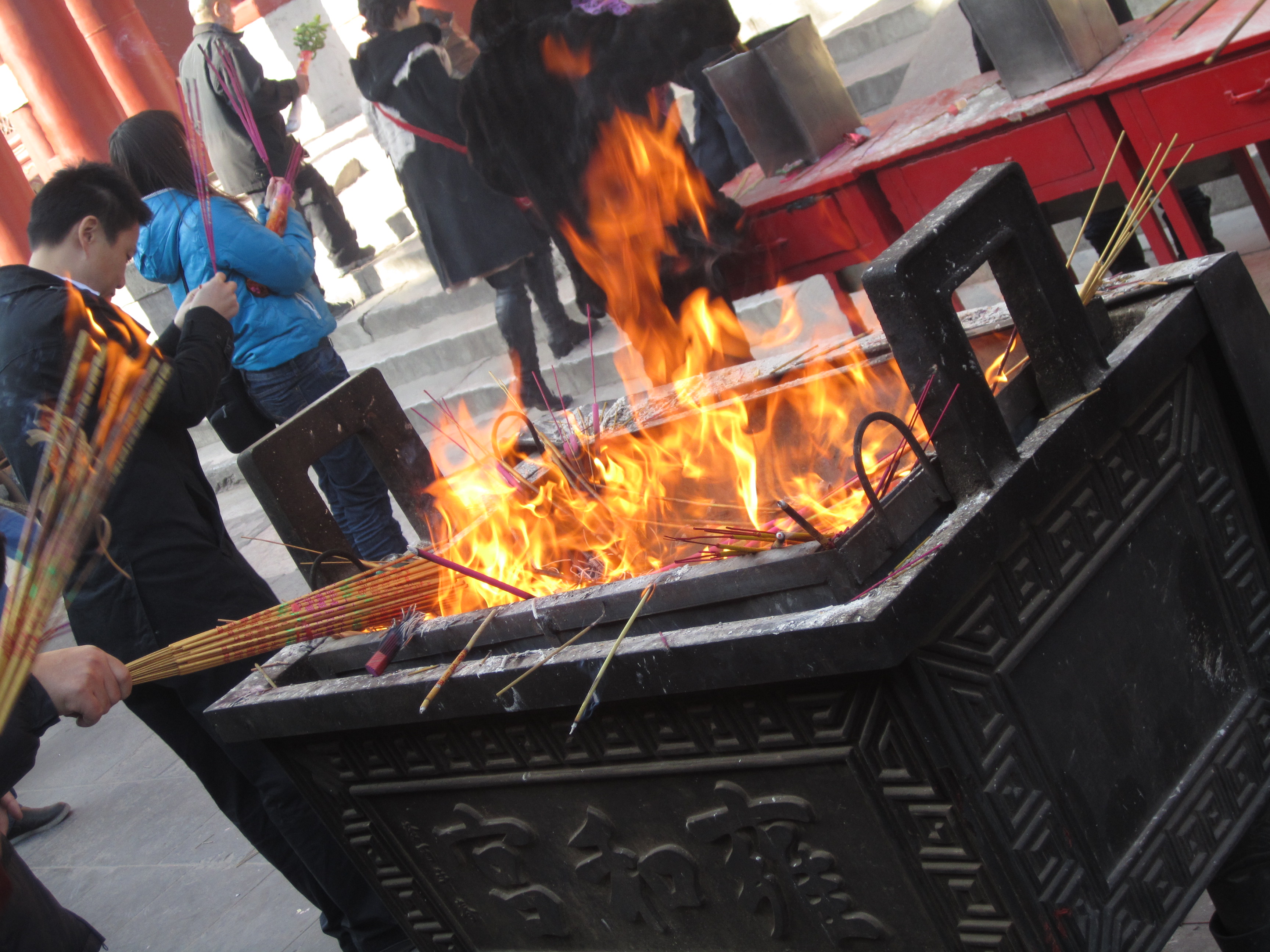 Dans ce temple aussi, tout le monde rentre avec des encens. A la différence du temple des Lamas, on ne peut pas les faire brûlés directement. On les dépose sur une table et ils sont ensuite pris et déposé dans le feu.
