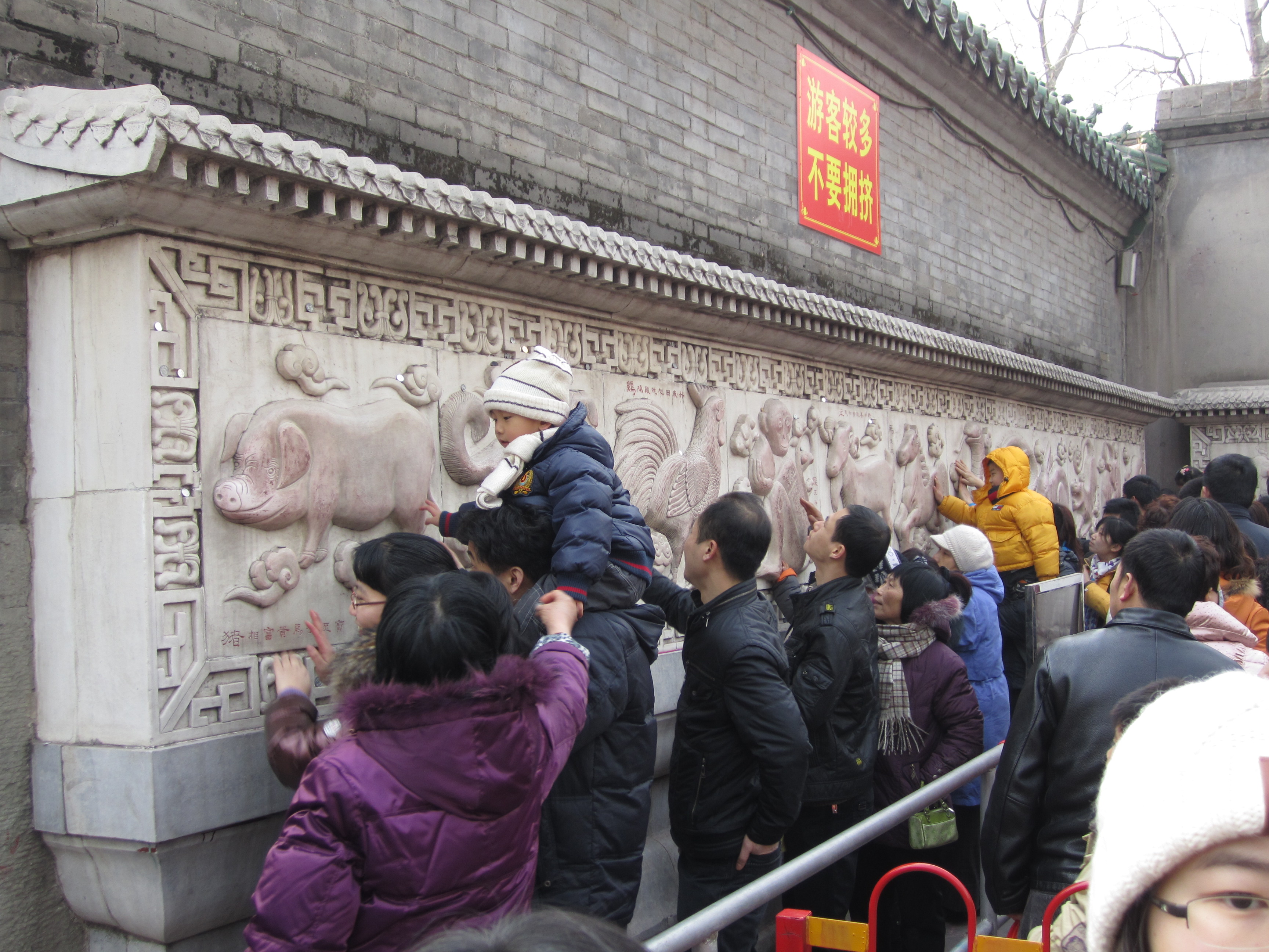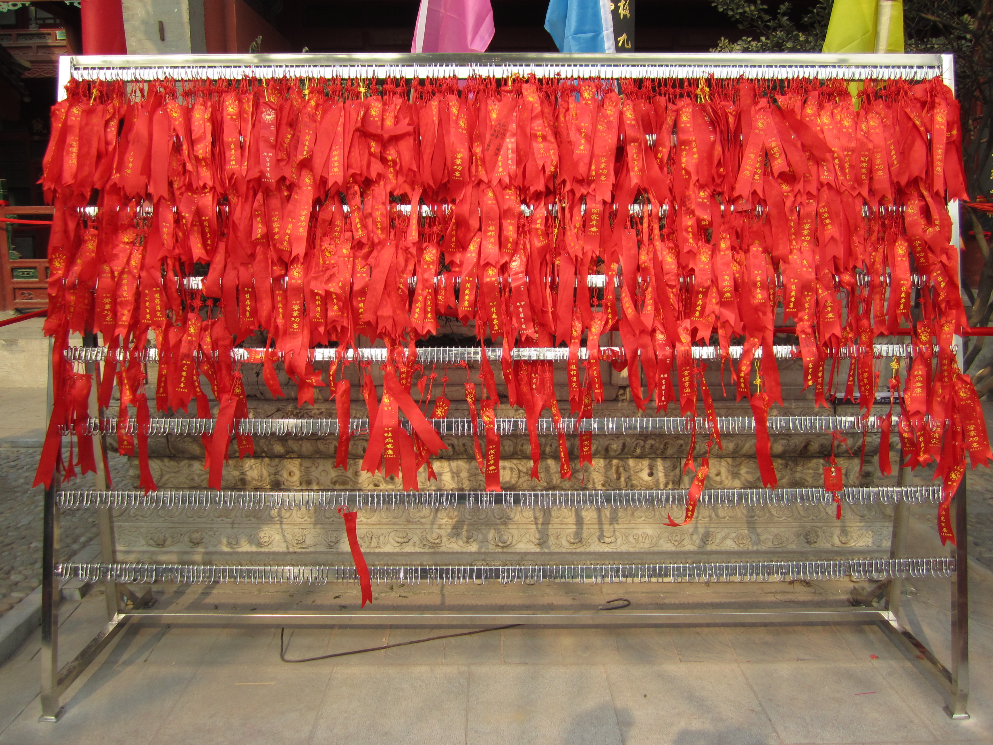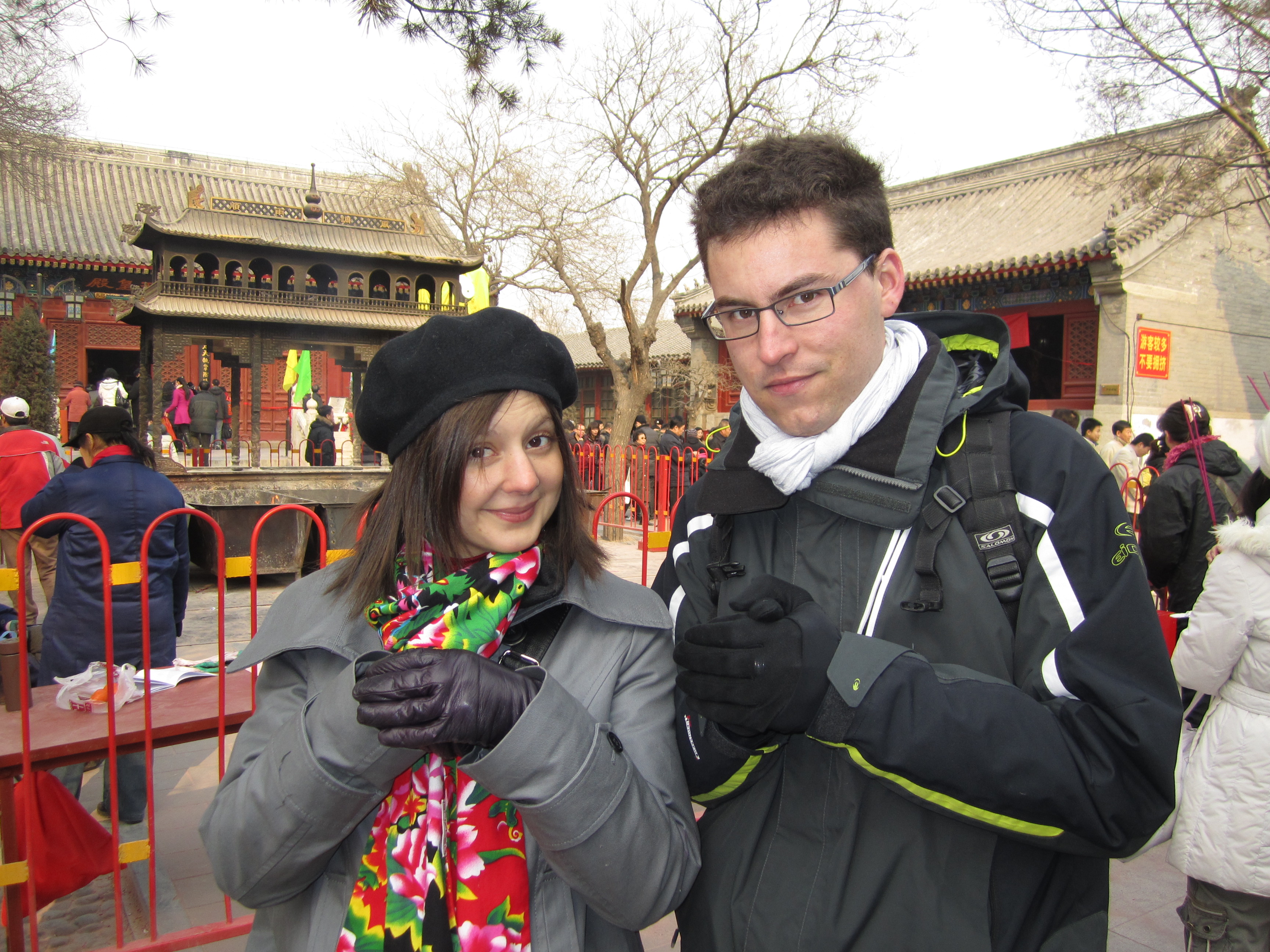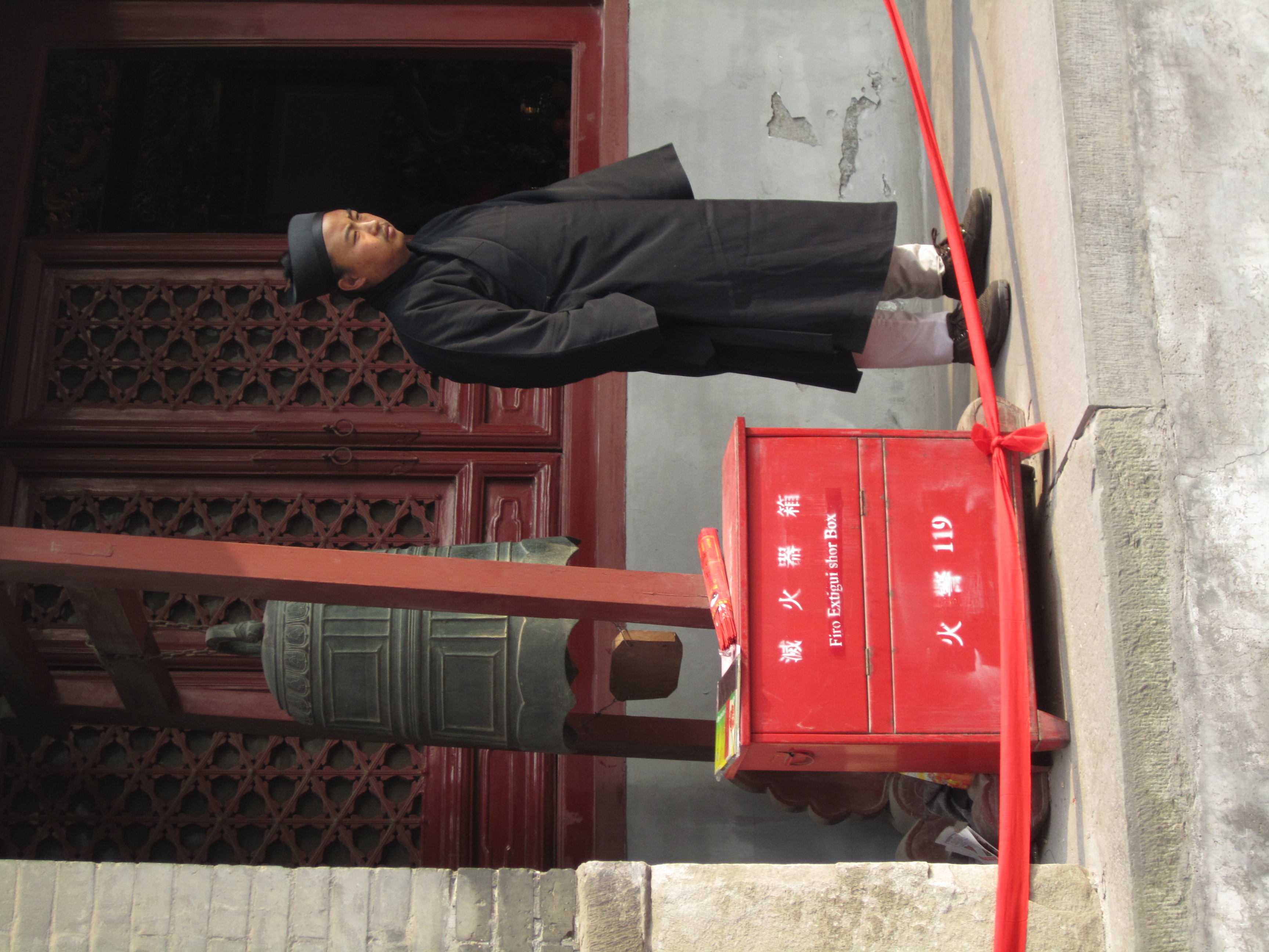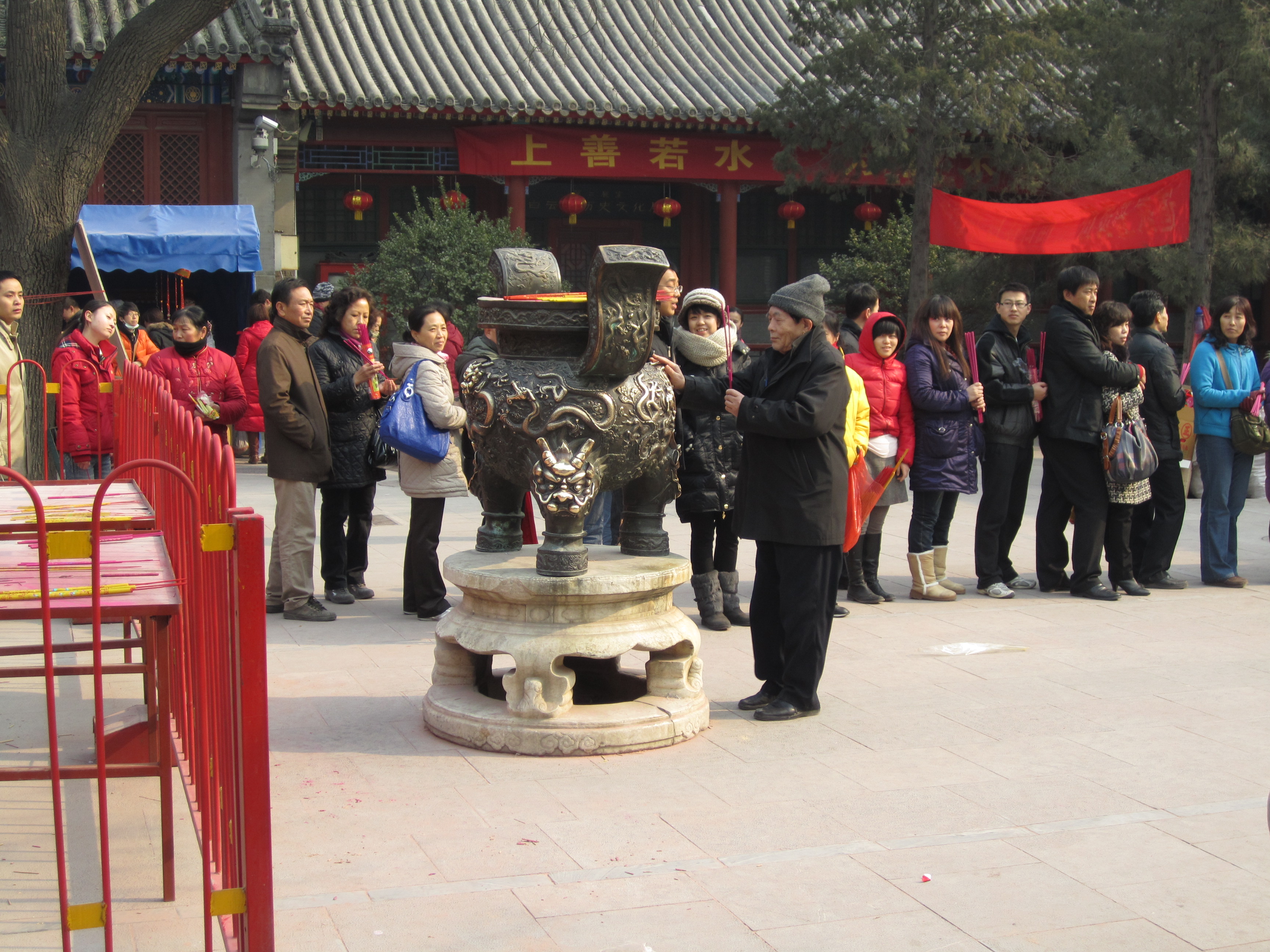 Dans une cours, un mur de petits bandeaux rouges est présenté, un peu comme des petites bannières. Les chinois achètent ces petits bandeaux, écrivent leurs vœux dessus et les accrochent ensuite sur ce mur. Dans cette même cours, on assiste à un autre rituel : une file s’est formée à côté d’une statue en forme de vase. Chaque personne de cette file, à tour de rôle, se place à 10m du vase, tends la main droite en avant, prend 3 encens dans l’autre main, ferme les yeux et marche jusqu’à elle, les yeux fermés. Je suis assez étonné de voir qu’ils arrivent à avancer plutôt franchement et pas non pas à tâtons de peur de rentrer de plein fouet dans le vase. Ils doivent tricher ! Une fois contre le vase, ils font certainement une prière, un vœu puis dépose les encens dessus et laisse la place au prochain, qui avance déjà à l’aveuglette.