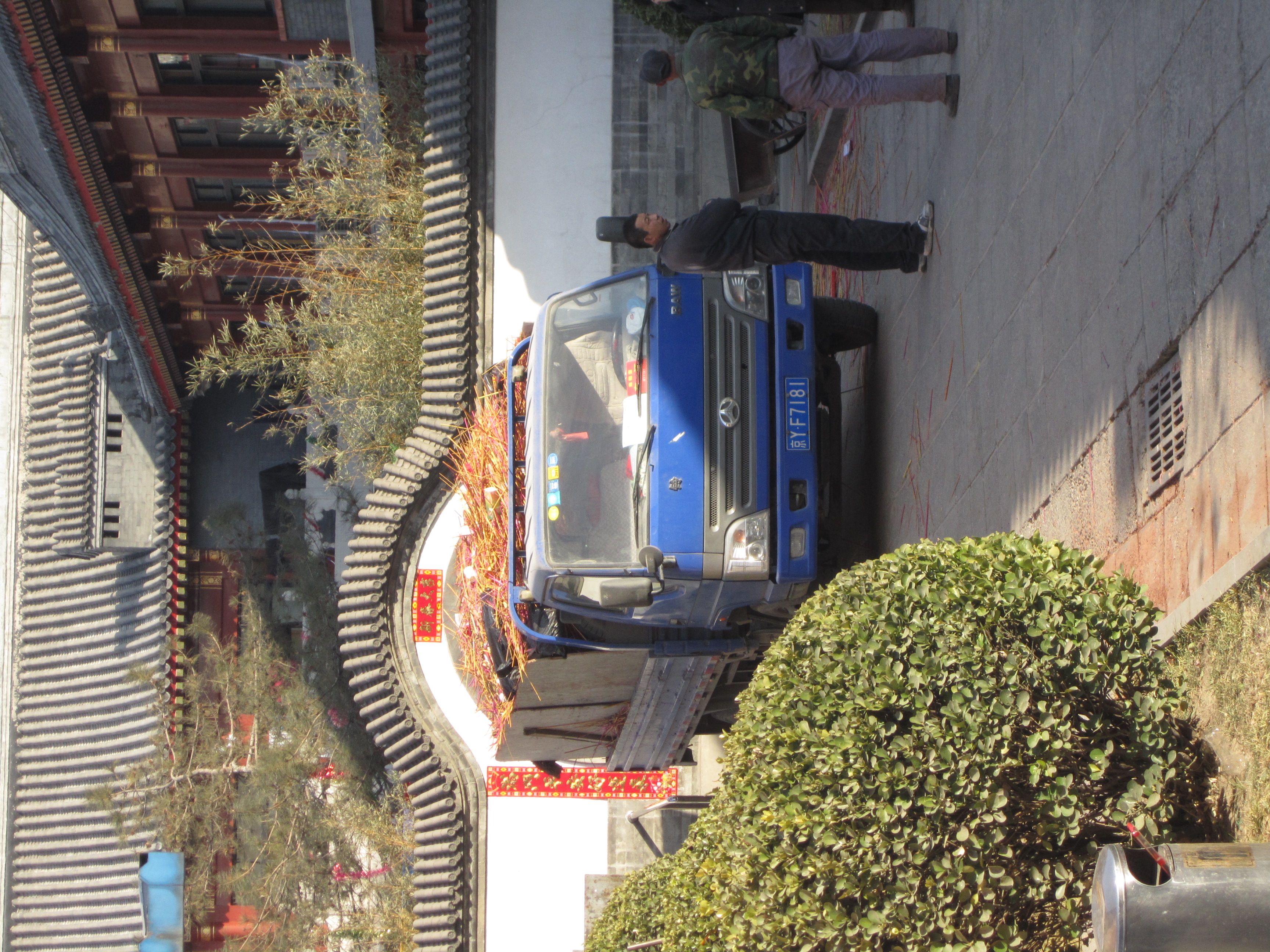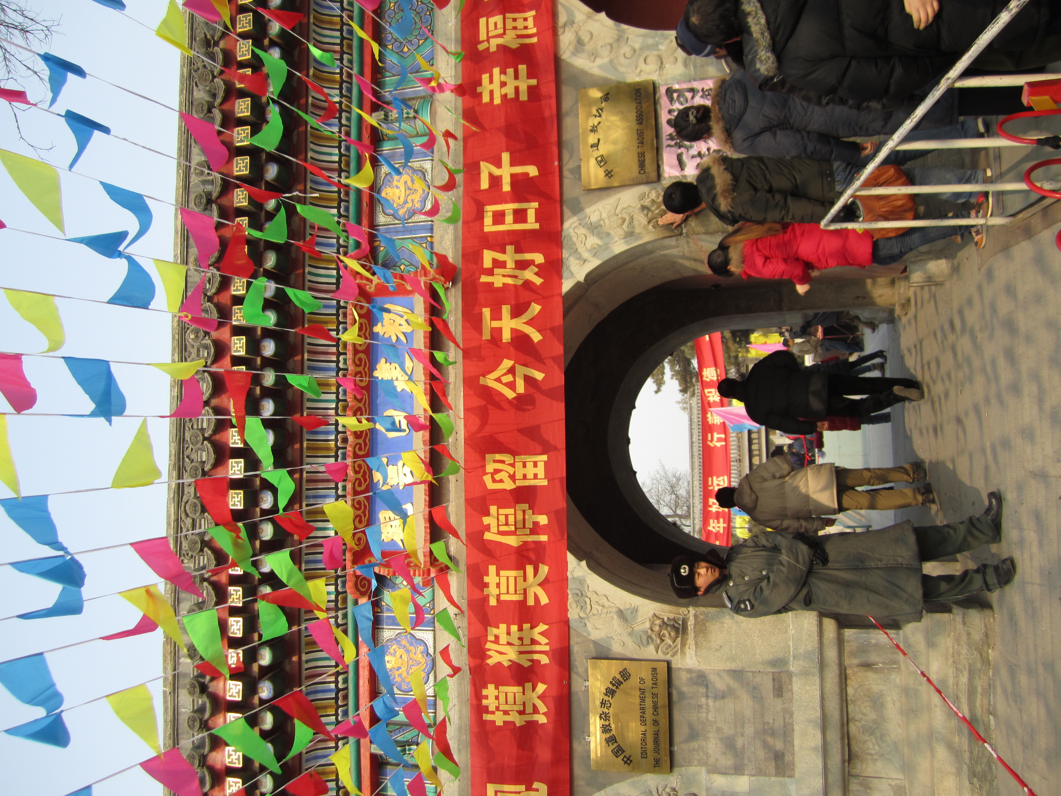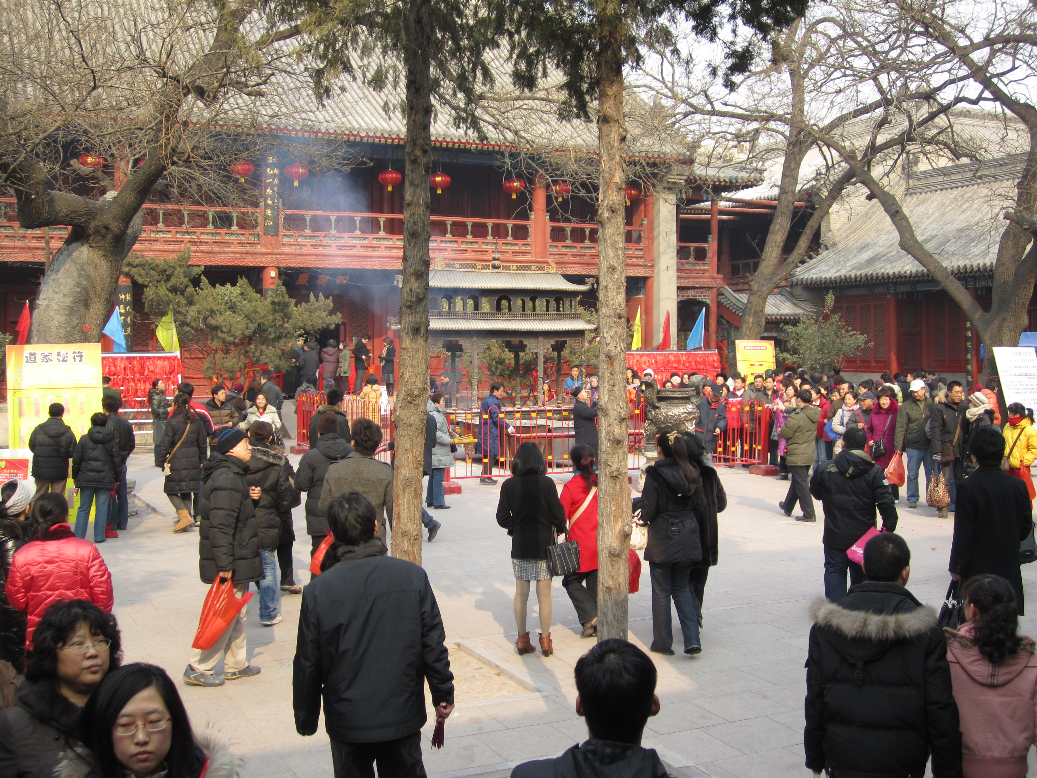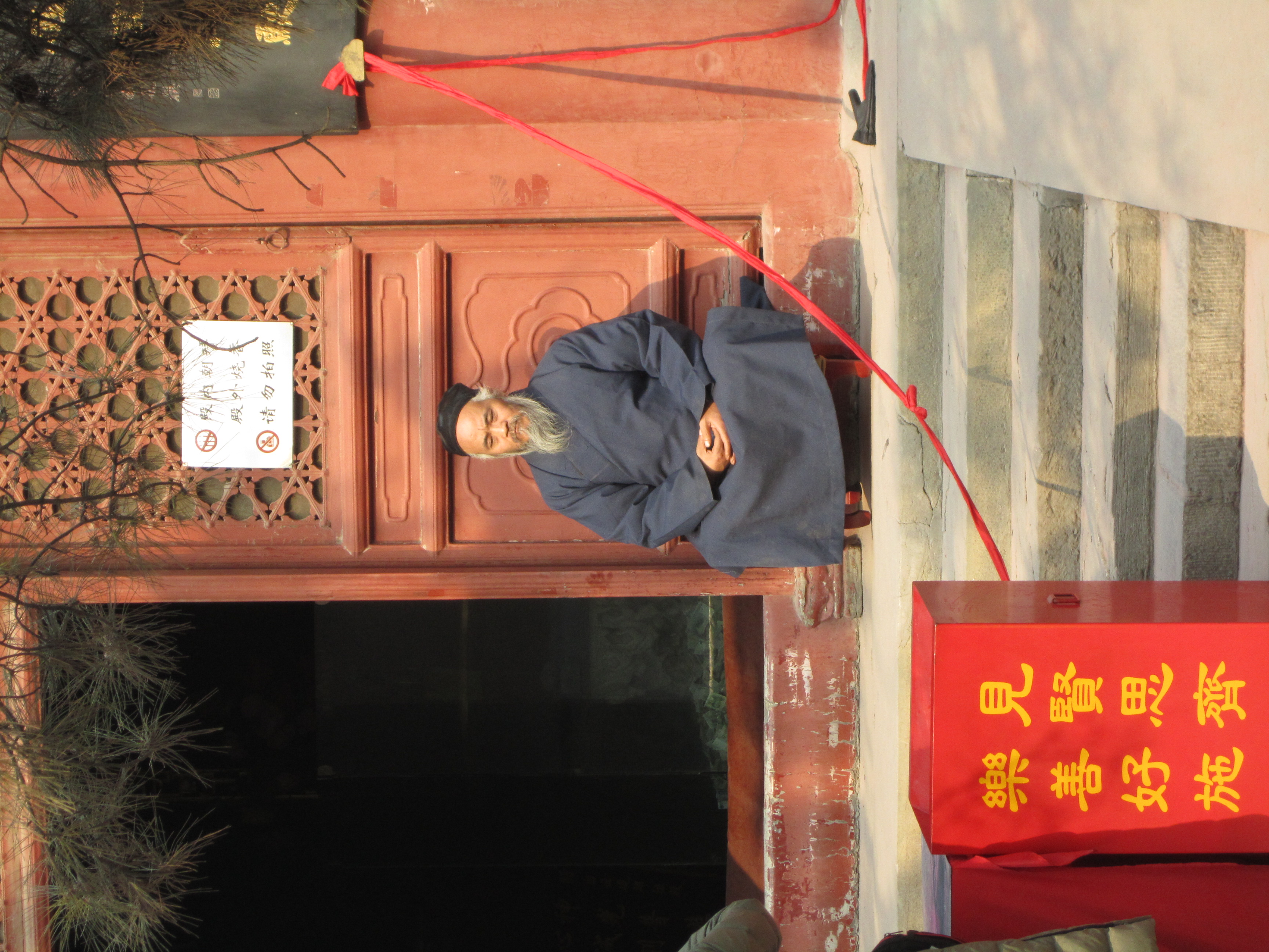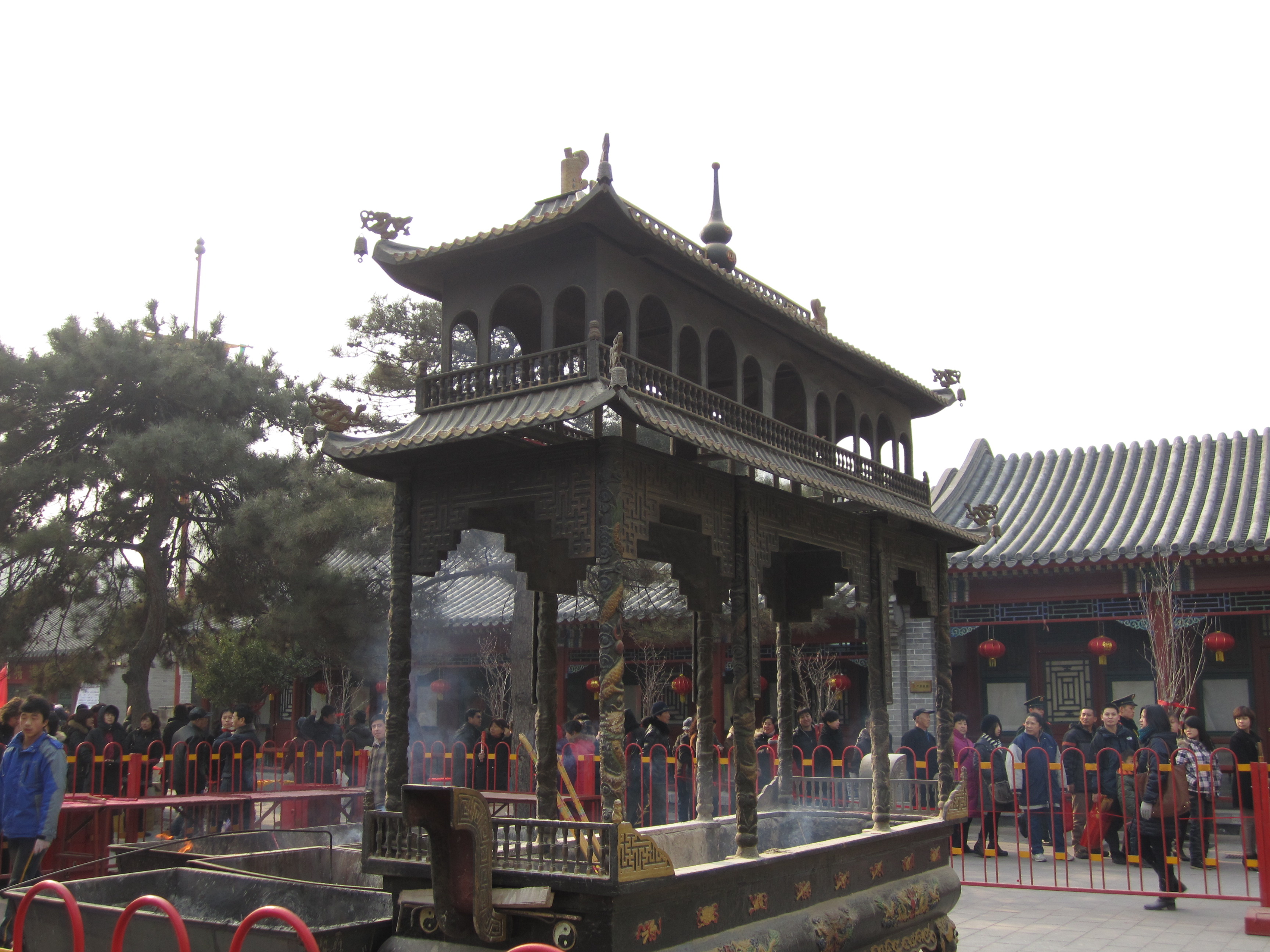 Dans une cours, un mur de petits bandeaux rouges est présenté, un peu comme des petites bannières. Les chinois achètent ces petits bandeaux, écrivent leurs vœux dessus et les accrochent ensuite sur ce mur. Dans cette même cours, on assiste à un autre rituel : une file s’est formée à côté d’une statue en forme de vase. Chaque personne de cette file, à tour de rôle, se place à 10m du vase, tends la main droite en avant, prend 3 encens dans l’autre main, ferme les yeux et marche jusqu’à elle, les yeux fermés. Je suis assez étonné de voir qu’ils arrivent à avancer plutôt franchement et pas non pas à tâtons de peur de rentrer de plein fouet dans le vase. Ils doivent tricher ! Une fois contre le vase, ils font certainement une prière, un vœu puis dépose les encens dessus et laisse la place au prochain, qui avance déjà à l’aveuglette.