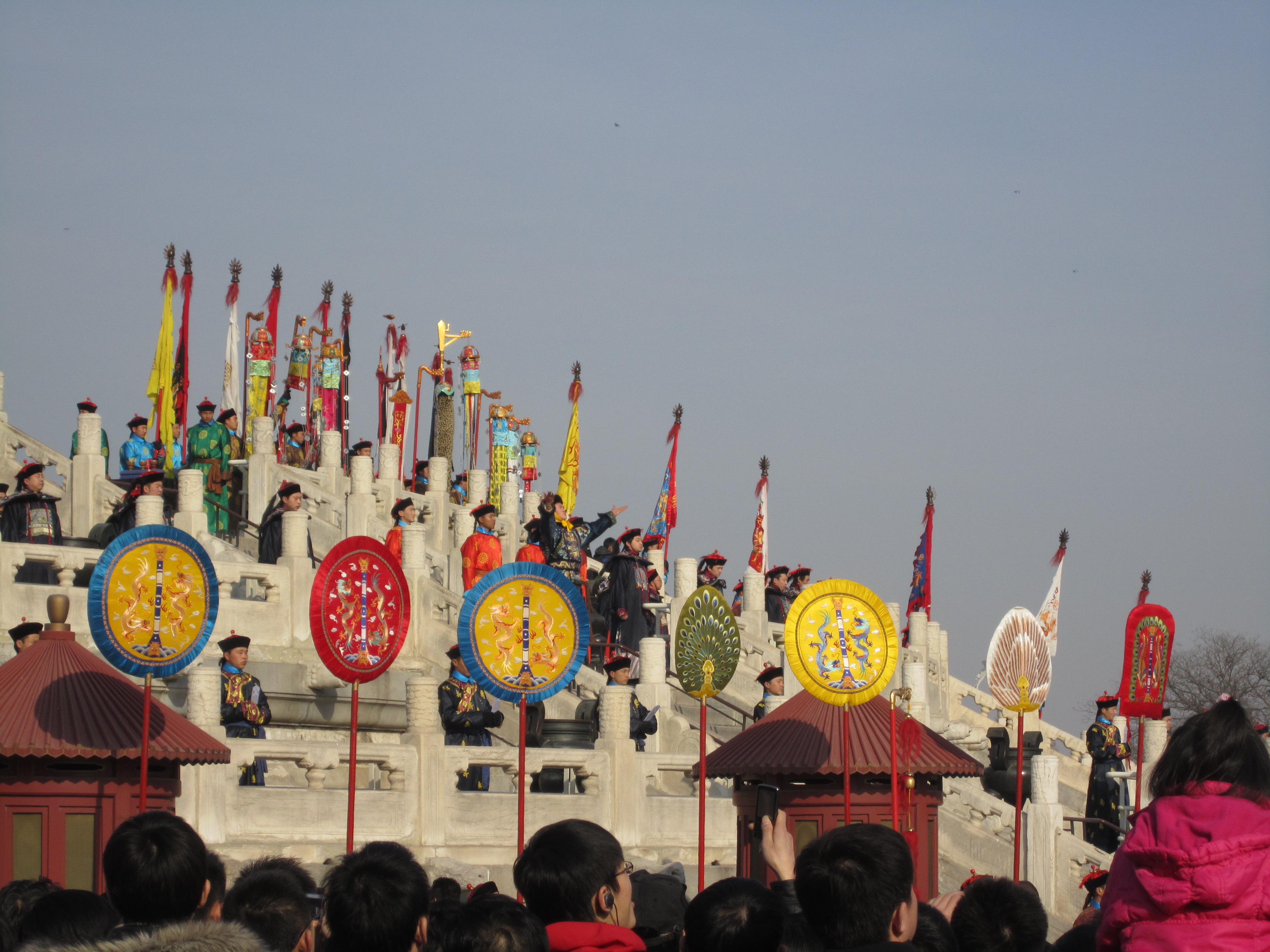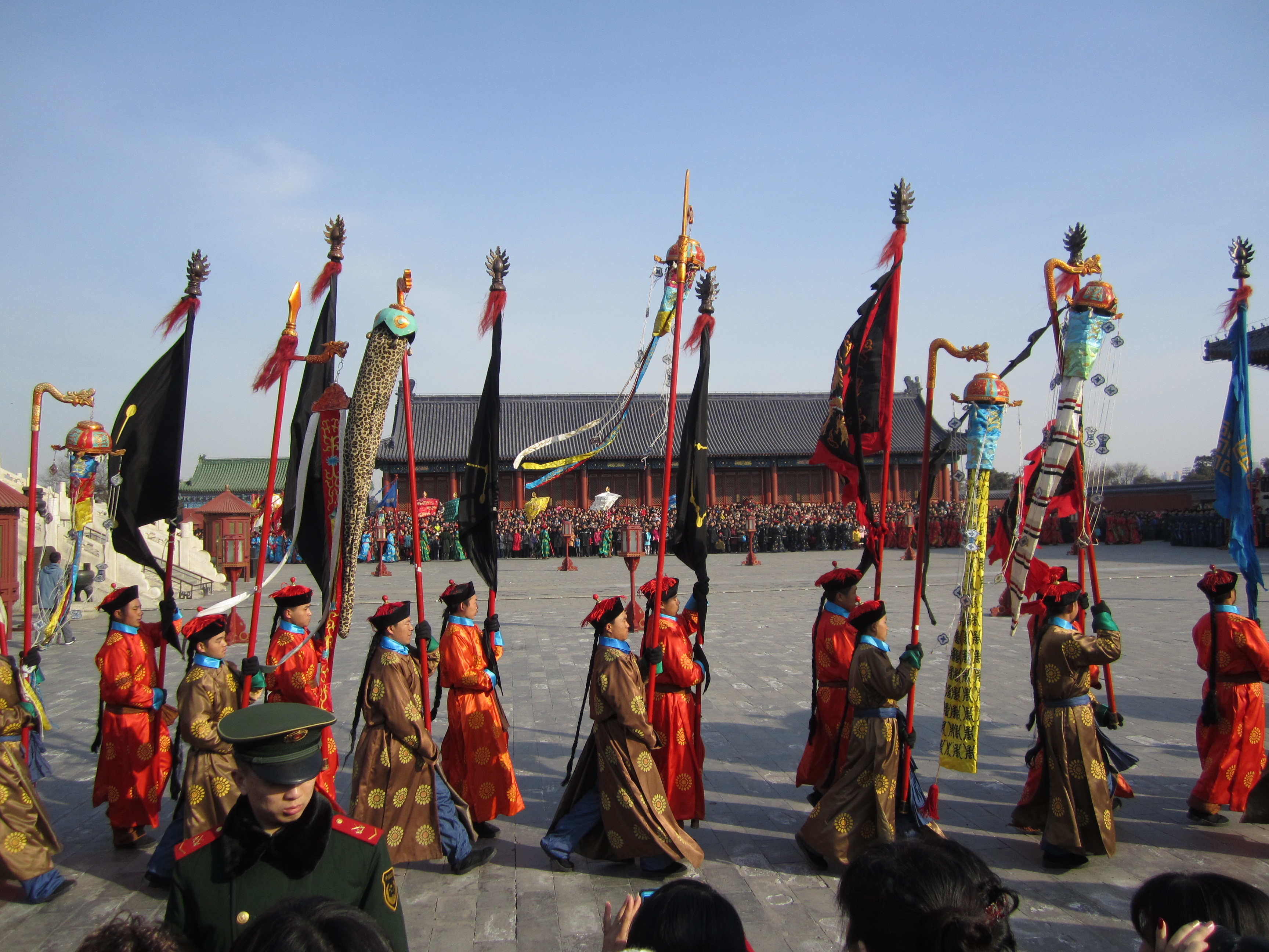 Le défilé commence, on voit passer de grands drapeaux portés par des Chinois habillés de plein de couleurs. Ils se placent devant la salle des prières, sur les 3 niveaux d’escaliers pour y monter. Ensuite c’est autour de l’empereur (un faux hein) d’arriver. S’en suis 3 vagues de soldats qui font chacun une danse sur l’esplanade. Entre chaque danse, l’empereur fait une offrande face à la salle des prières. Un hommage au Ciel qui, en échange, lui renouvelle son mandat (ça c’est pour l’histoire). La cérémonie a duré à peu près 30 minutes.
