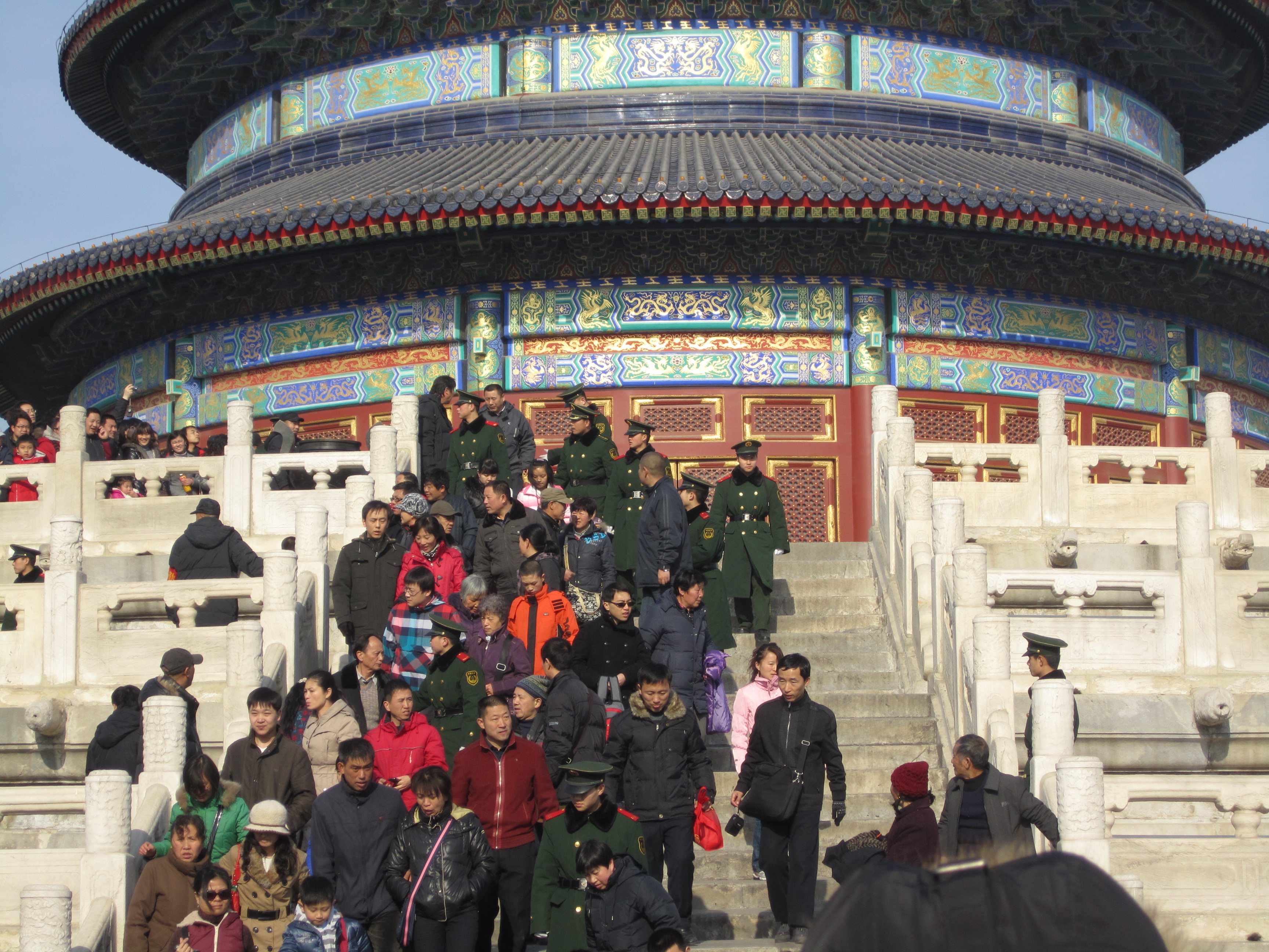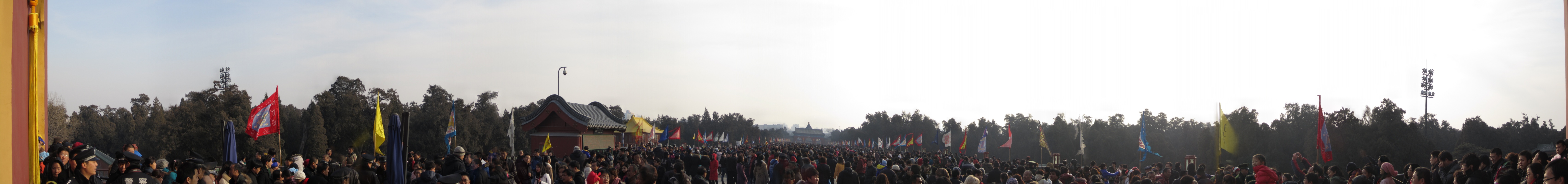 Toute cette foule descend ensuite le long du pont Danbi (le panorama). Nous voilà à la voûte céleste impériale, un enclos circulaire avec au centre un temple rond qui conservait les tablettes du Ciel des empereurs décédés. La marche se finit en allant sur l’autel du Ciel, un grand centre cérémoniel circulaire élevé dans une enceinte carrée. Tous les chinois étaient rassemblés sur le haut de l’autel, le centre de la terrasse supérieure : le trône du Ciel, un lieu où les souhaits se réalisent.