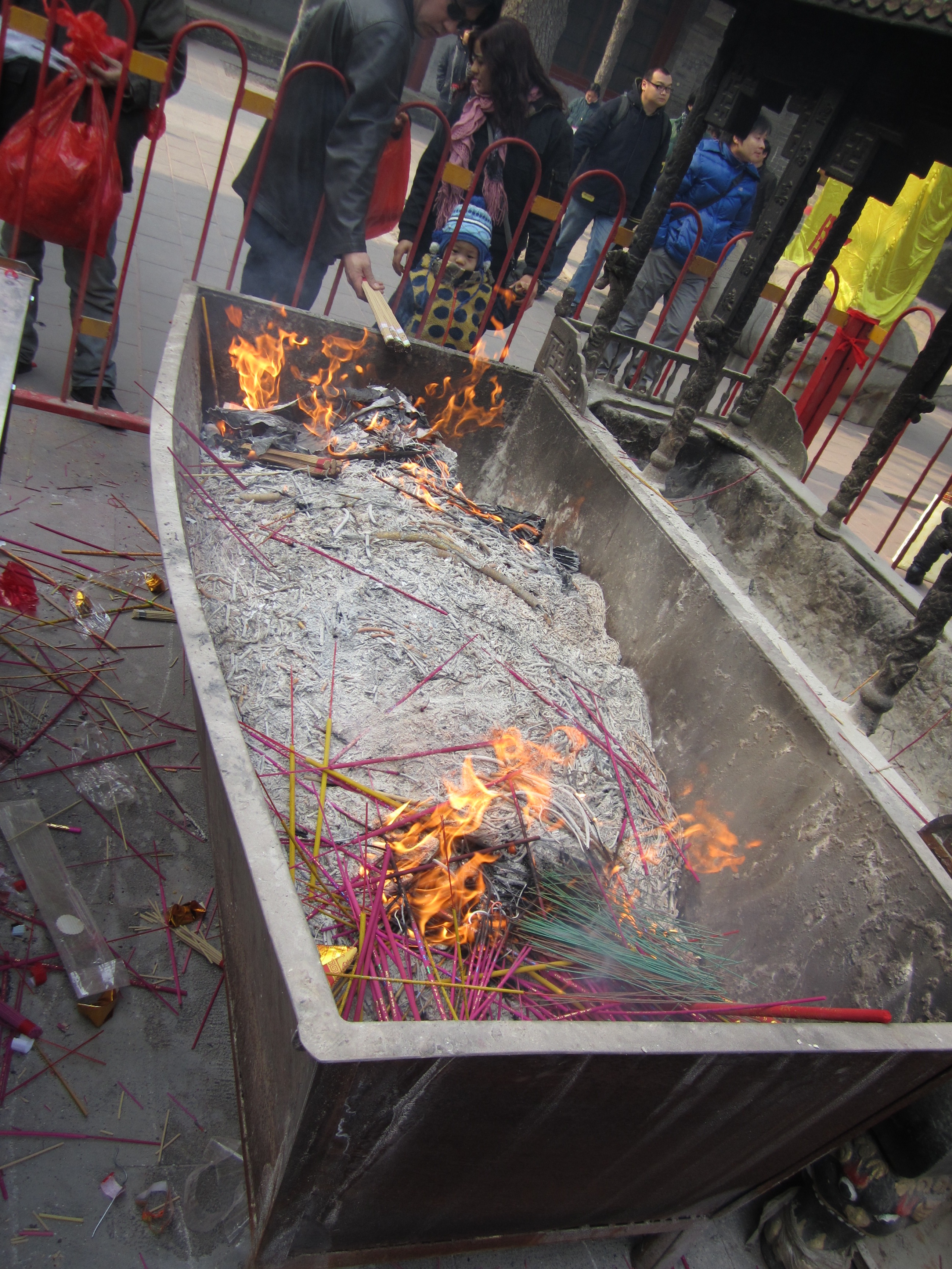A l’extérieur du temple, toutes les boutiques vendent des encens et la fumée embaume tout le trottoir. La tradition veut qu’on achète des encens, pas des petits comme en France, des gros (même diamètre qu’un crayon, voire qu’un marqueur des fois) et qu’on les fassent bruler par 3 (ou tous d’un coup) devant chaque temple en faisant une prière. Une fois la prière effectuée, il faut rejeter les encens dans le feu pour qu’elle ait une chance de se réaliser. Ca sent bon dans tous les méandres, une quantité folle d’encens sont brulés.