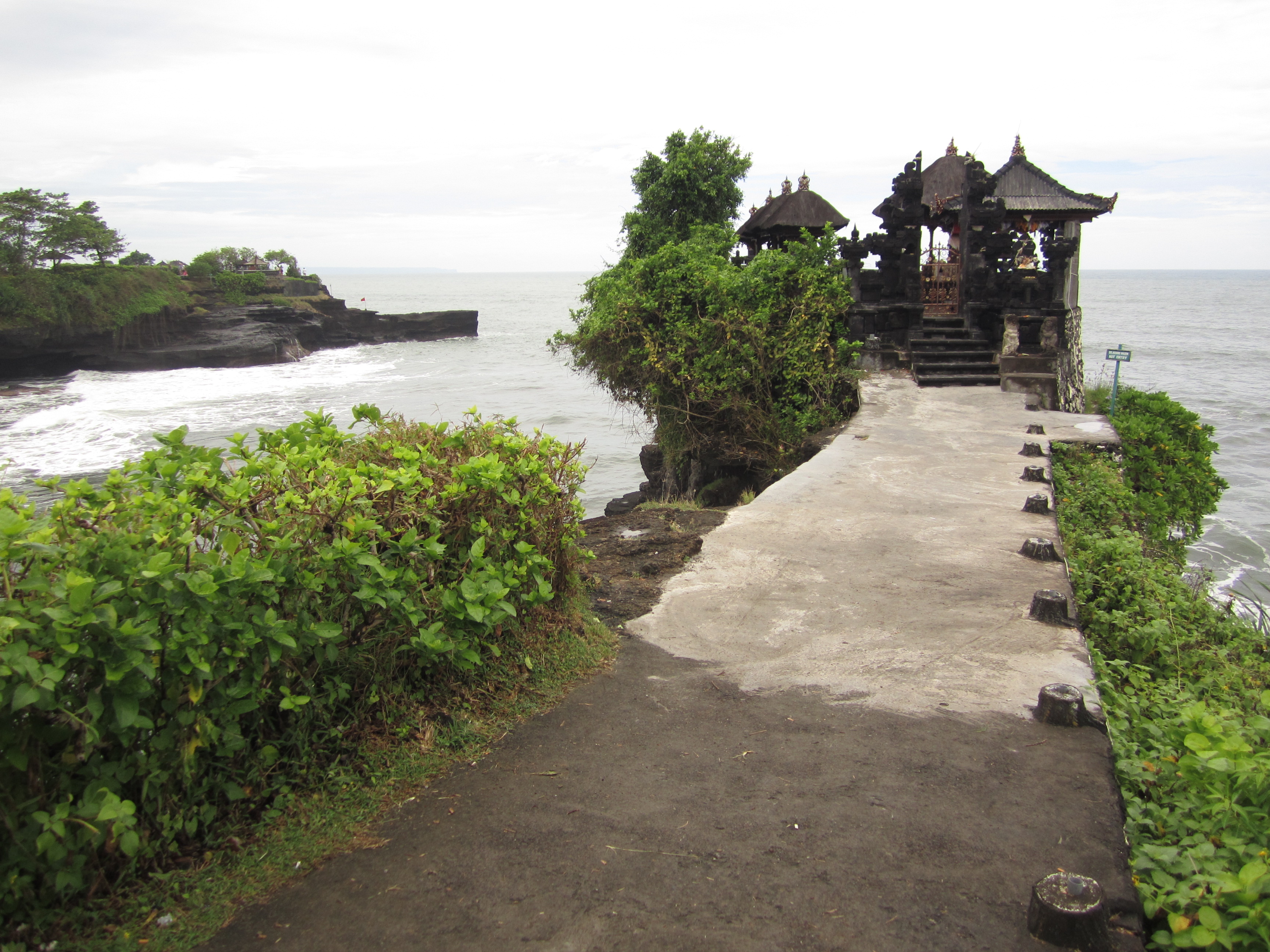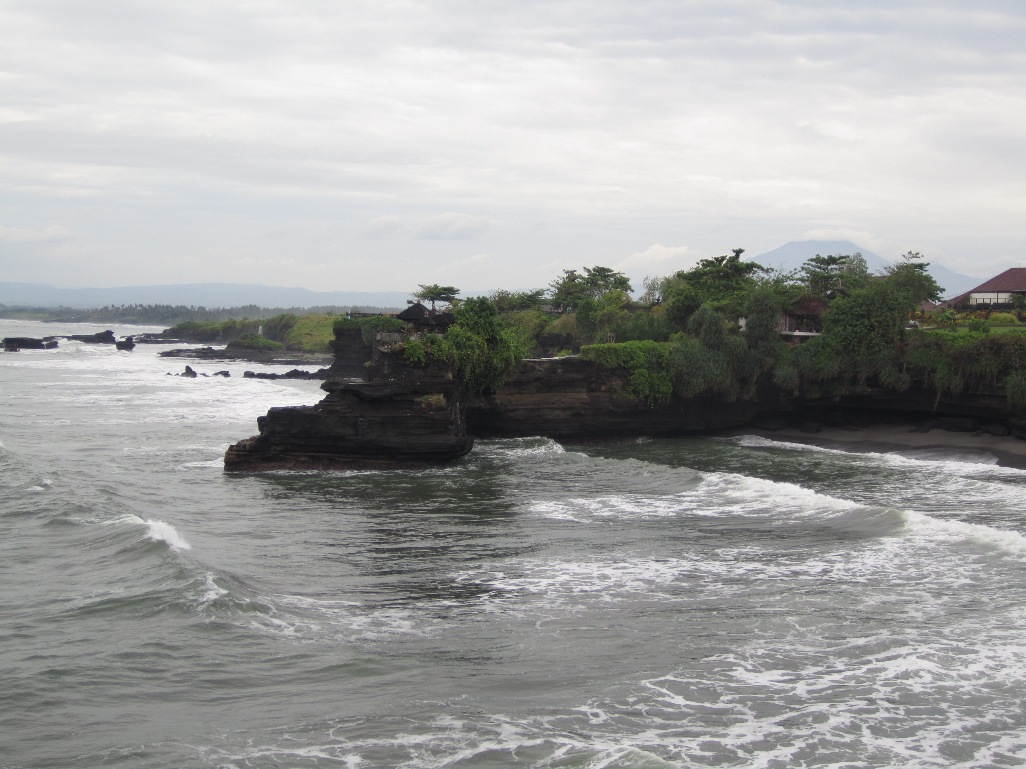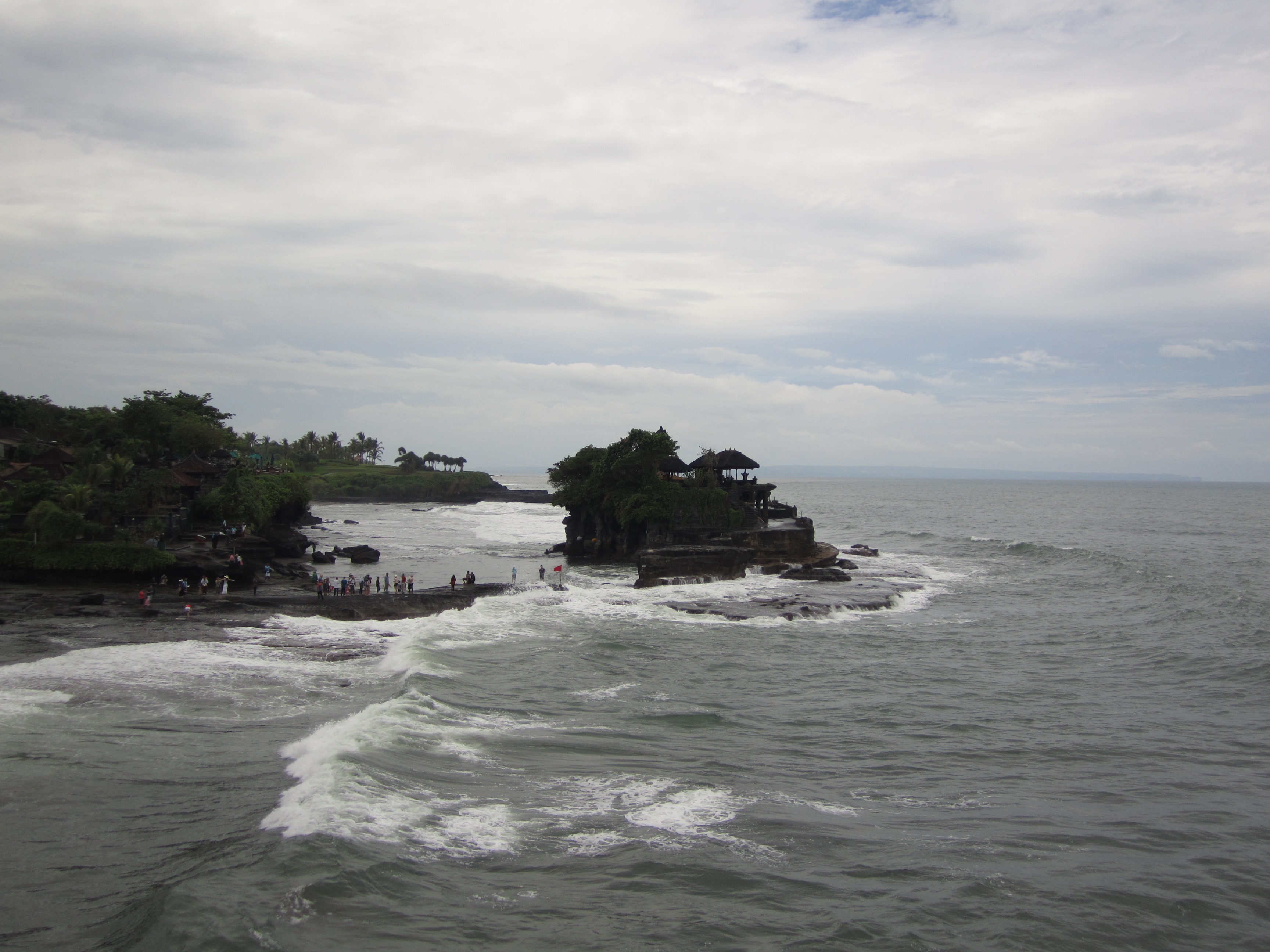 Le temple est perché sur un îlot de rocher à une vingtaine de mètre de la côte. Apparemment il est fait à 30% de pierres artificielles suite à des rénovations car il menaçait de s’effondrer. La pluie a fini par s’arrêter. Tout le monde se prend en photo sous toutes les coutures devant le temple, dos à la mer. C’est justement dos à la mer que certains ont goutté au plaisir d’avoir les chaussures mouillées par une trop grosse vague. C’est toujours aussi drôle de les observer. Une pause pour la photo, la vague arrive assez vite mais sans bruit par derrière et inonde toutes les godasses qu’elle trouve sur son passage. Eclat de rire chez les photographes et vent de panique chez les photographiés qui ont beau sautiller dans tous les sens vers le rivage, la vague est toujours sous leurs pieds. Rahlala.