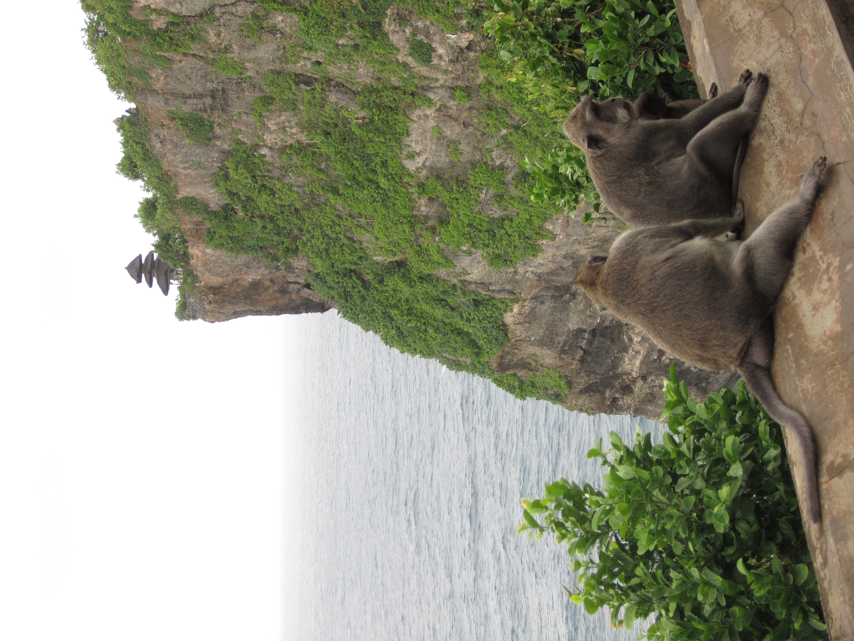 Les singes grouillent dans tous les sens et on croise une meute qui fait la pose devant le temple tout en se cherchant les puces ou se foutant sur la tronche. En partant sur la gauche du temple, pour avoir une belle vue de la falaise et du temple, on emprunte un chemin boueux. Après quelques galères et glissades, les autres touristes, partis devant nous, nous disent qu’il n’y a rien à voir au bout … demi tour, tout de suite. On a les pieds boueux certes, mais on a ri dans nos glissades…