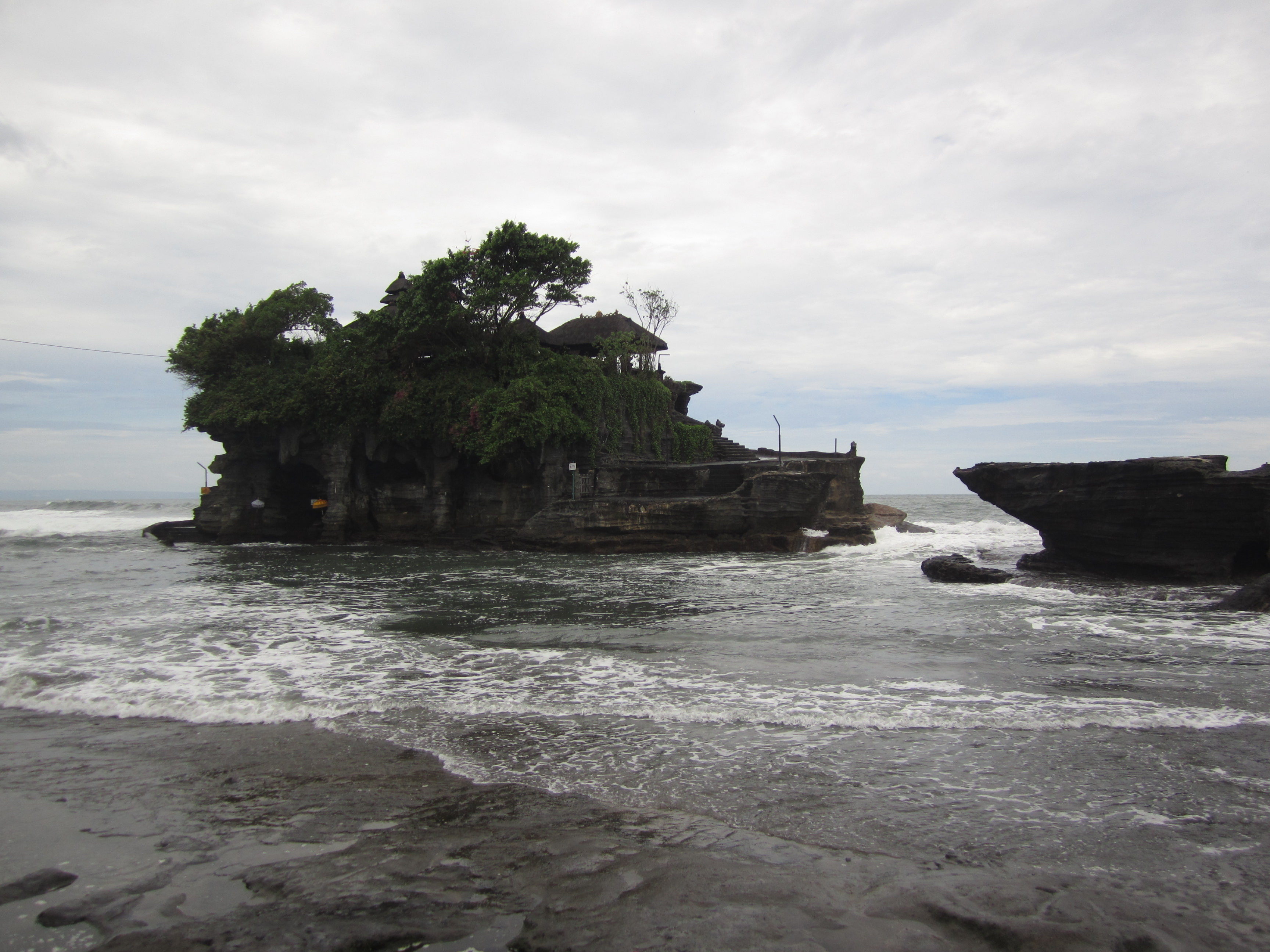 L’arrivée à Tanah Lot se fait sous la pluie, c’est une toute autre façon de voir le temple que dans les guides où ils précisent de venir le voir le soir au coucher de soleil. Il est 12h. Mais ça ne change en rien sa beauté.
