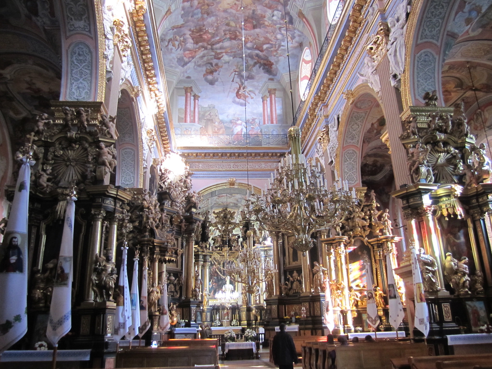 Construite dans les années 1600 en même temps que le monastère des Bernardins juste à côté, elle est située dans le plein centre de Lviv. Impossible d'oublier l'intérieur de l'église. D'une décoration baroque et même rococo (!), on a l'impression de se retrouver dans la vieille maison trop chargée d'un riche collectionneur de vieux objets. Des ornements descolonnes dorées imposants, des lustres qui doivent peser des tonnes, un plafond en trompe-l'œil (apparemment typique du baroque tardif) pour donner encore plus de grandeur, des dorures sur tous les murs, un orgue imposant, etc ..