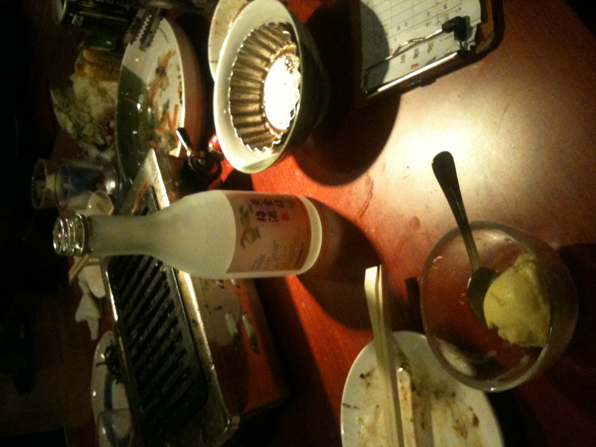 Il commande plein de viandes différentes (assaisonnées, tartare, de la langue, etc ...), des légumes, des salades, des pommes de terre et du plum wine (la p'tite bouteille est visible sur la dernière photo). Les tournées s'enchaînent et les plats de viandes aussi. De temps en temps, quand la plaque de cuissons est trop sale, ils viennent nous la changer. Les pommes de terre sont servies dans un moule à tartelette avec une noix de beurres (la 3e photos), c'est long à cuire, mais au final, c'est un vrai régal. La viande est très bonne. Le bol de riz fini de nous remplir le ventre. En guise de dessert, il nous donne un espèce de boule de glace à un fruit obscur, le jackfruit, et pas très bon (la dernière photo).