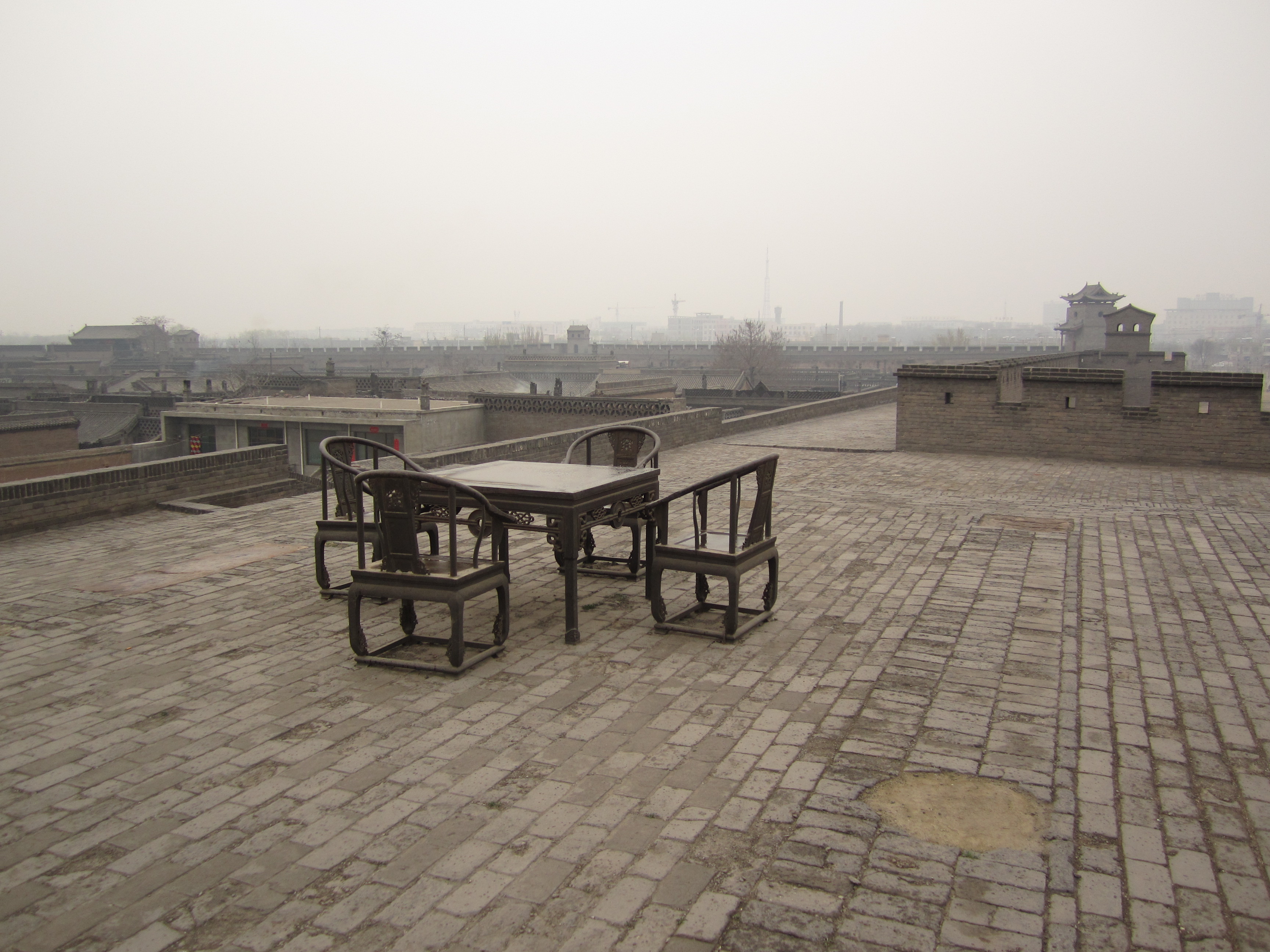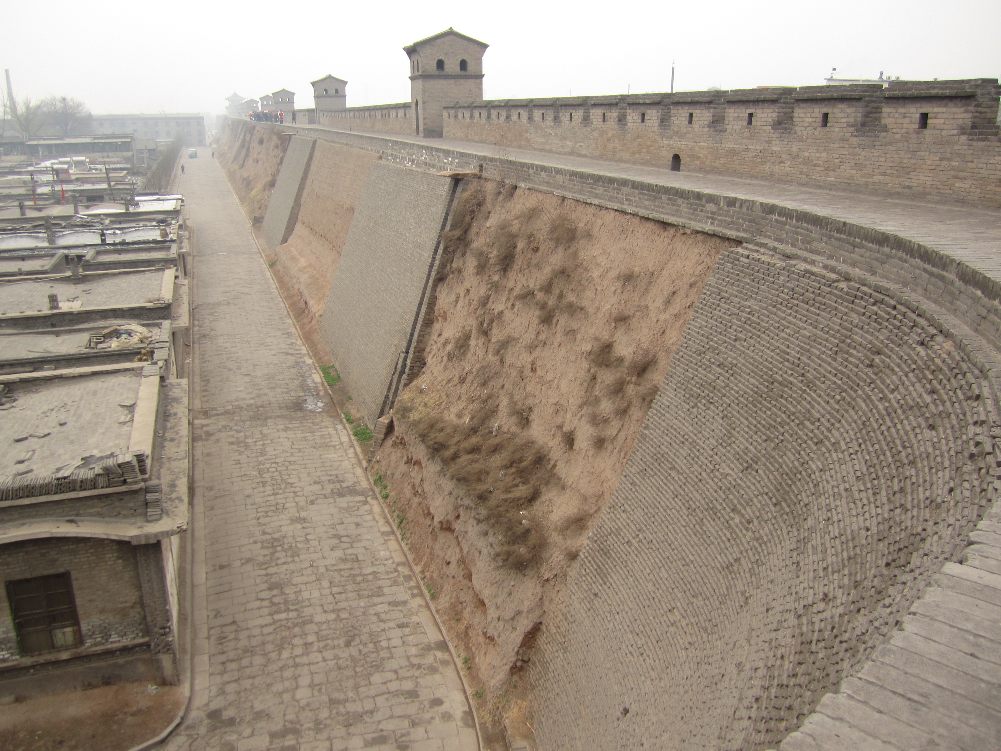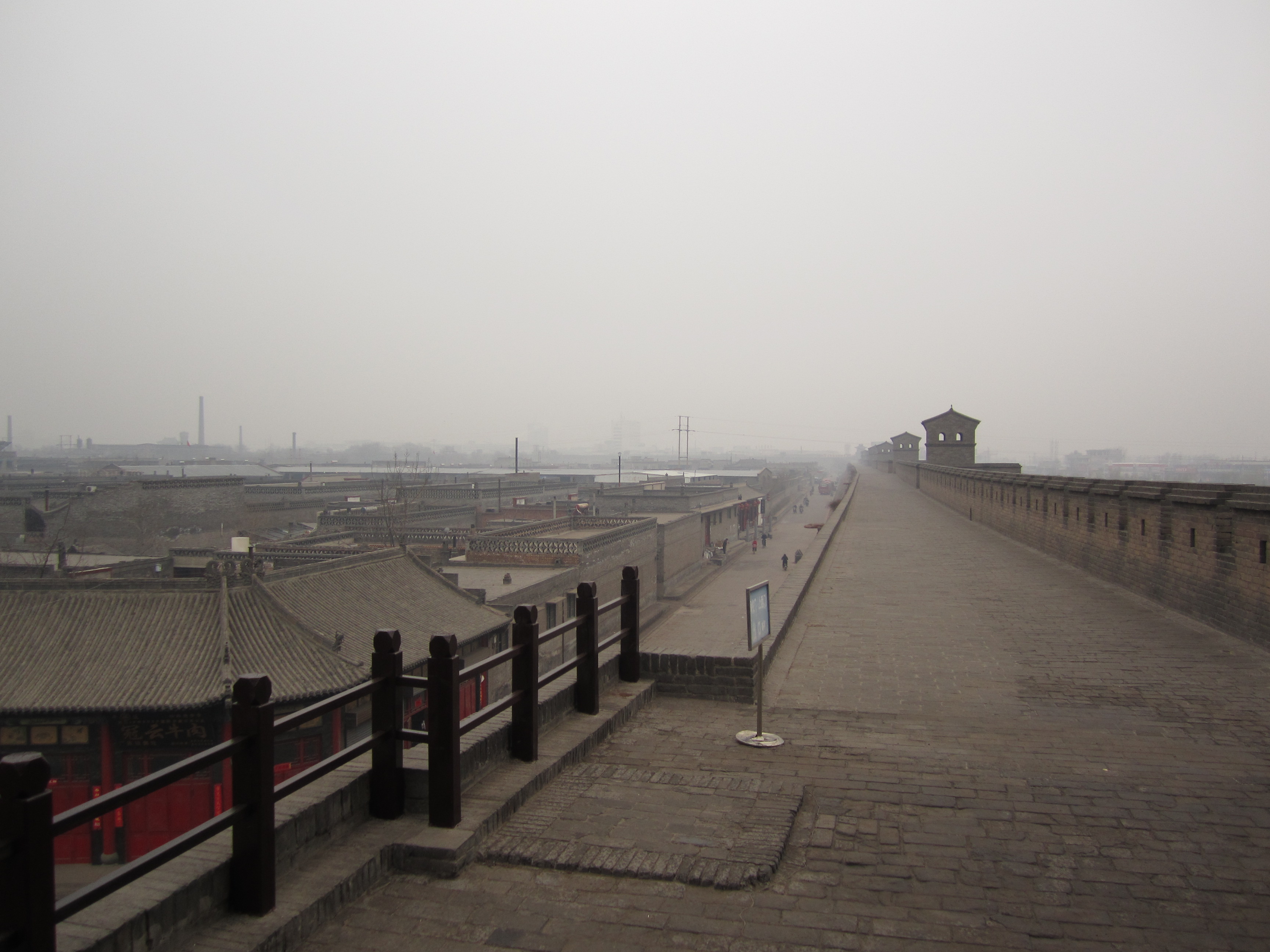 La petite taille de Pingyao permet d'achèter un seul ticket à 150¥ (16€) pour visiter la vieille ville (remparts, musées, vieilles demeures, etc …). Je commence par les remparts en attendant que la ville se réveille un peu. Ils sont déserts eux aussi et beaucoup moins larges que ceux de Xi’an. Le plus intéressant est de constater qu'il s'agit d'une vraie séparation entre le nouveau Pingyao et l’ancien. D’un côté, on voit les vieilles maisons, des ruelles étroites et pavées à peine large pour un seul vélo, des murés s’effondrant, et surtout aucune maison ne dépassant la hauteur des remparts. De l’autre côté: grands immeubles, circulation, affiches publicitaires et quadrillage rectiligne pour les rues.