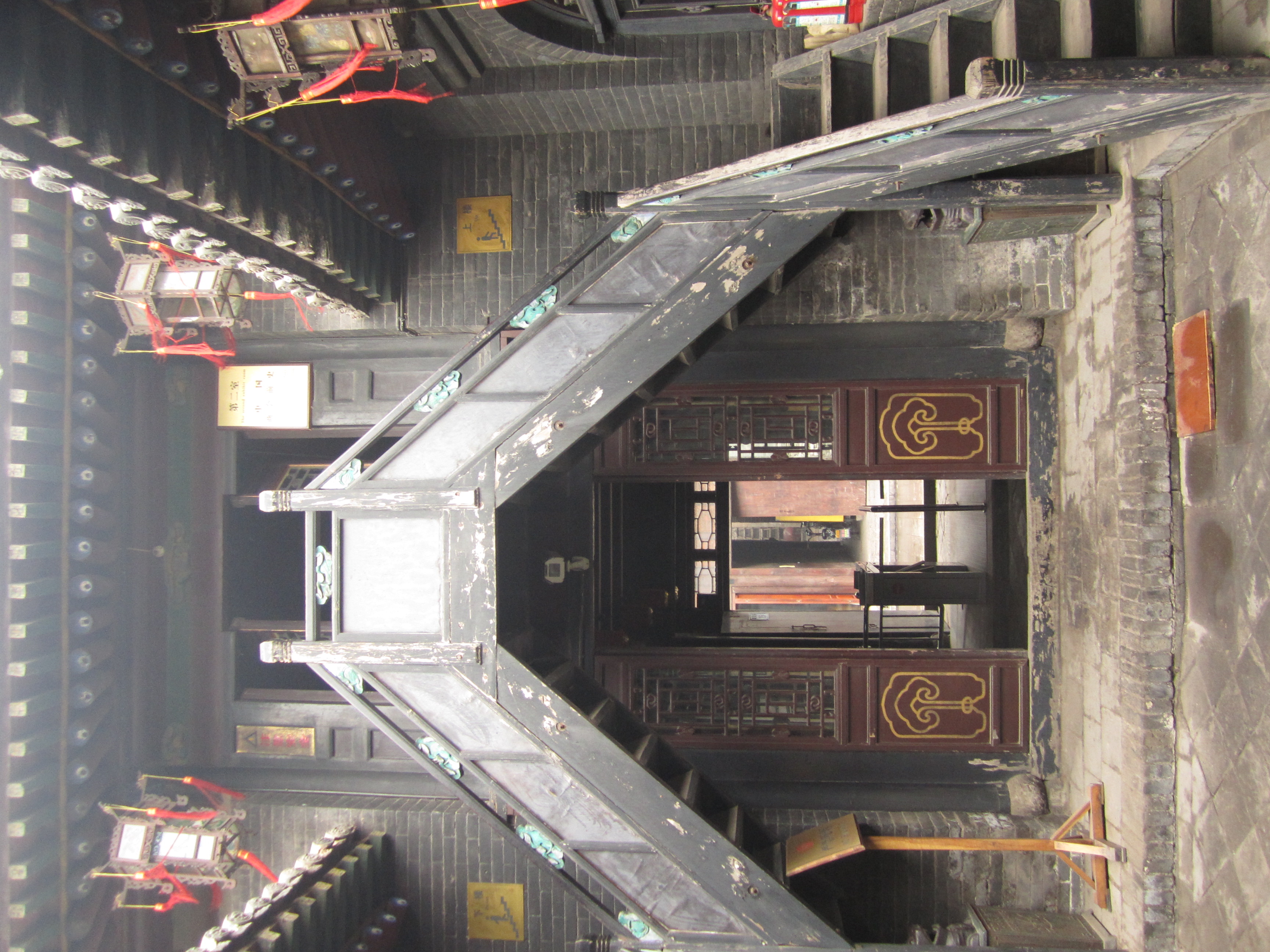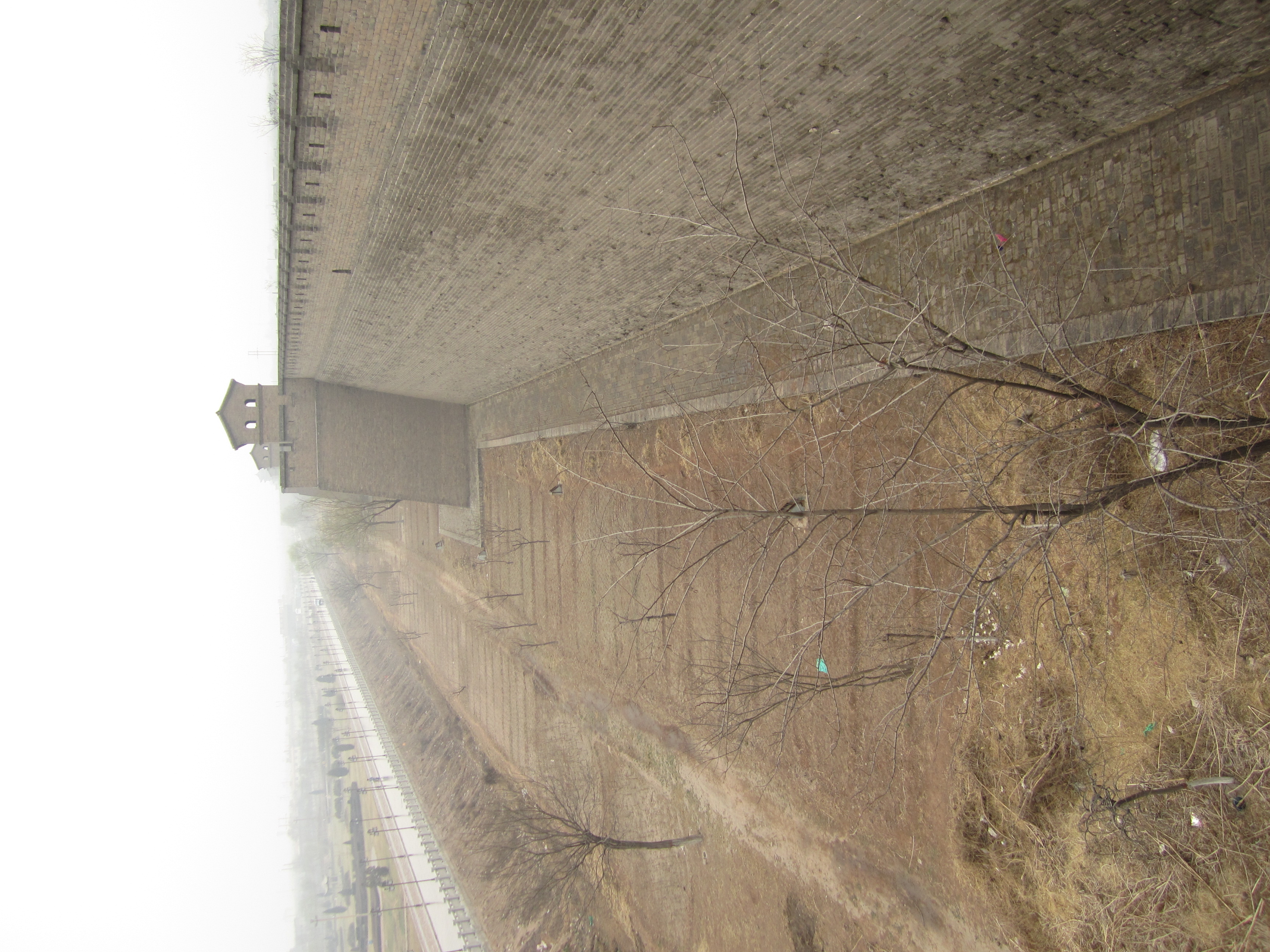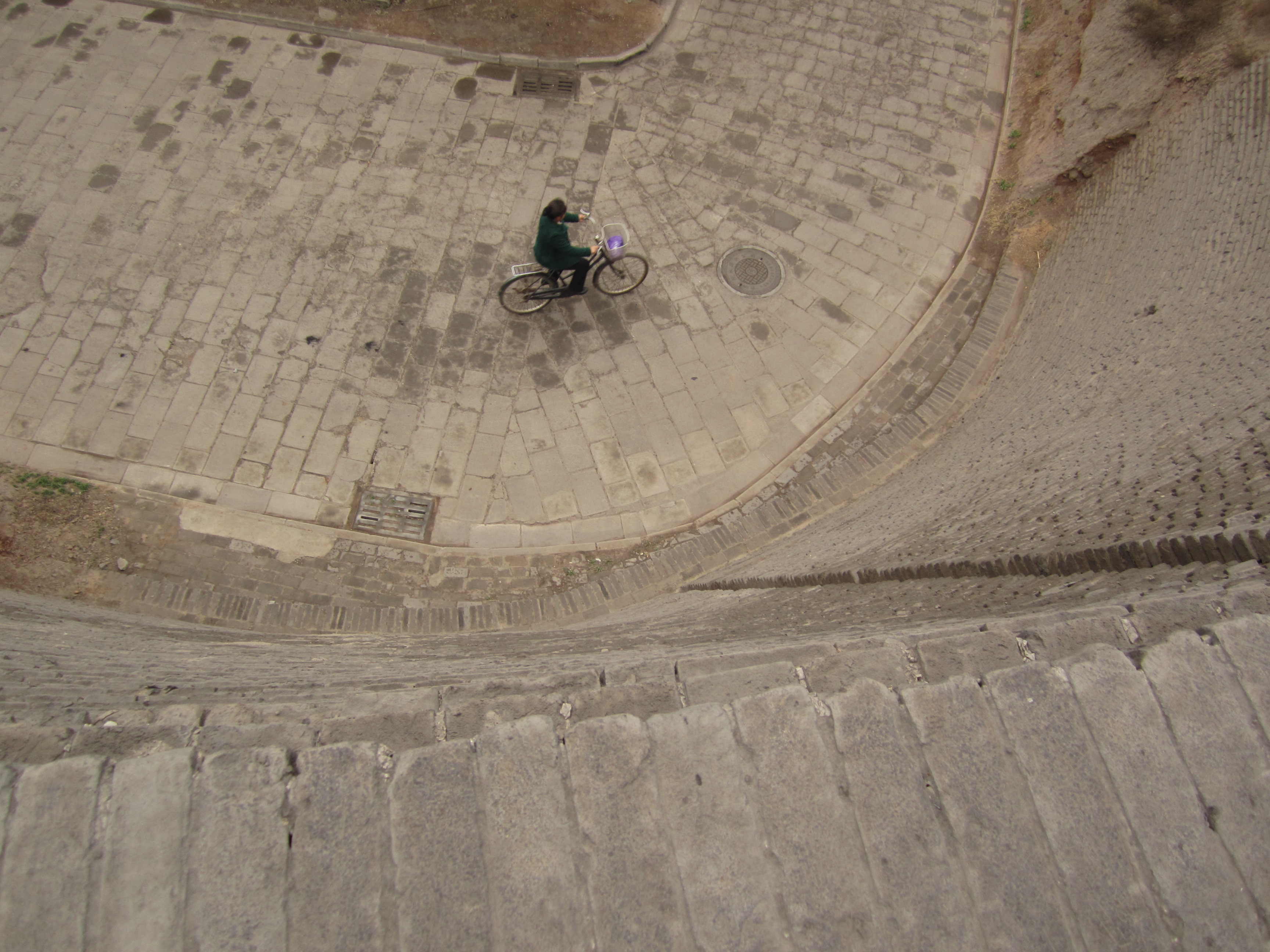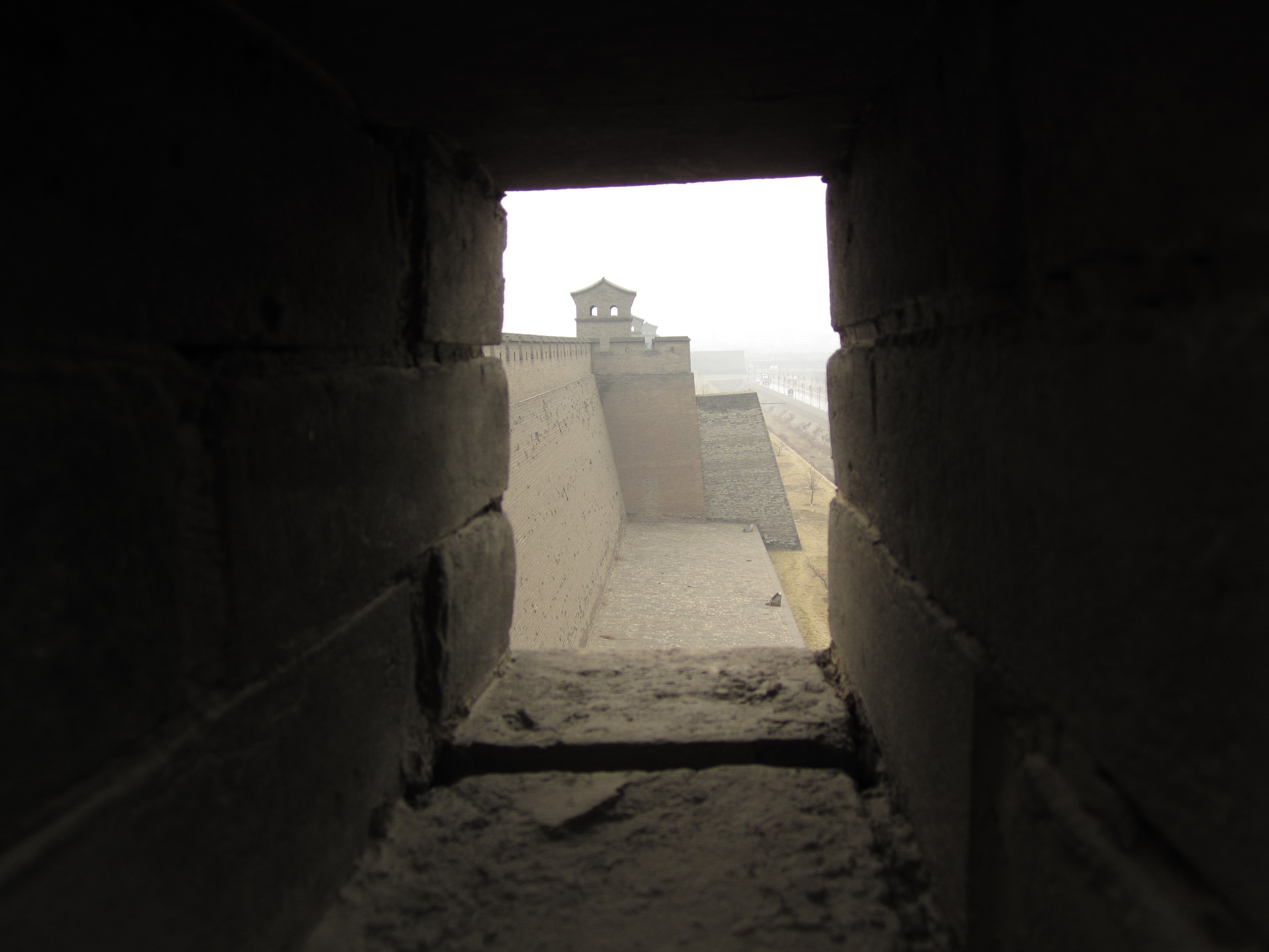 La petite taille de Pingyao permet d'achèter un seul ticket à 150¥ (16€) pour visiter la vieille ville (remparts, musées, vieilles demeures, etc …). Je commence par les remparts en attendant que la ville se réveille un peu. Ils sont déserts eux aussi et beaucoup moins larges que ceux de Xi’an. Le plus intéressant est de constater qu'il s'agit d'une vraie séparation entre le nouveau Pingyao et l’ancien. D’un côté, on voit les vieilles maisons, des ruelles étroites et pavées à peine large pour un seul vélo, des murés s’effondrant, et surtout aucune maison ne dépassant la hauteur des remparts. De l’autre côté: grands immeubles, circulation, affiches publicitaires et quadrillage rectiligne pour les rues.