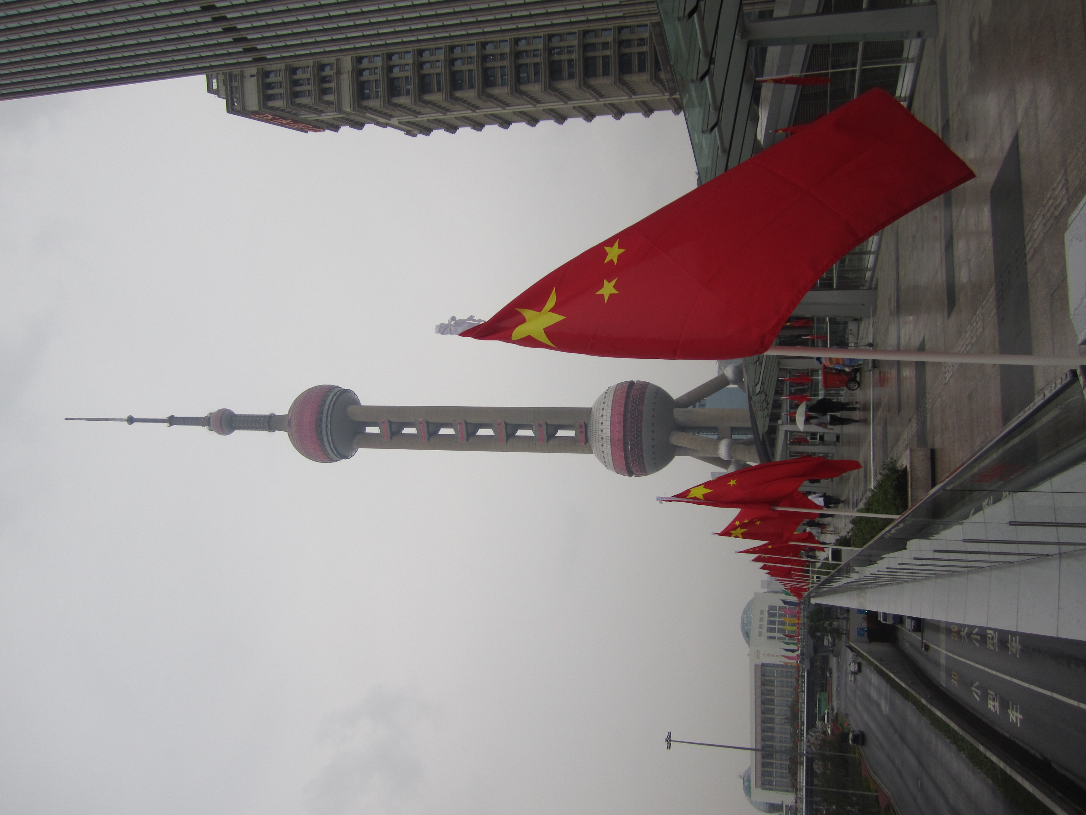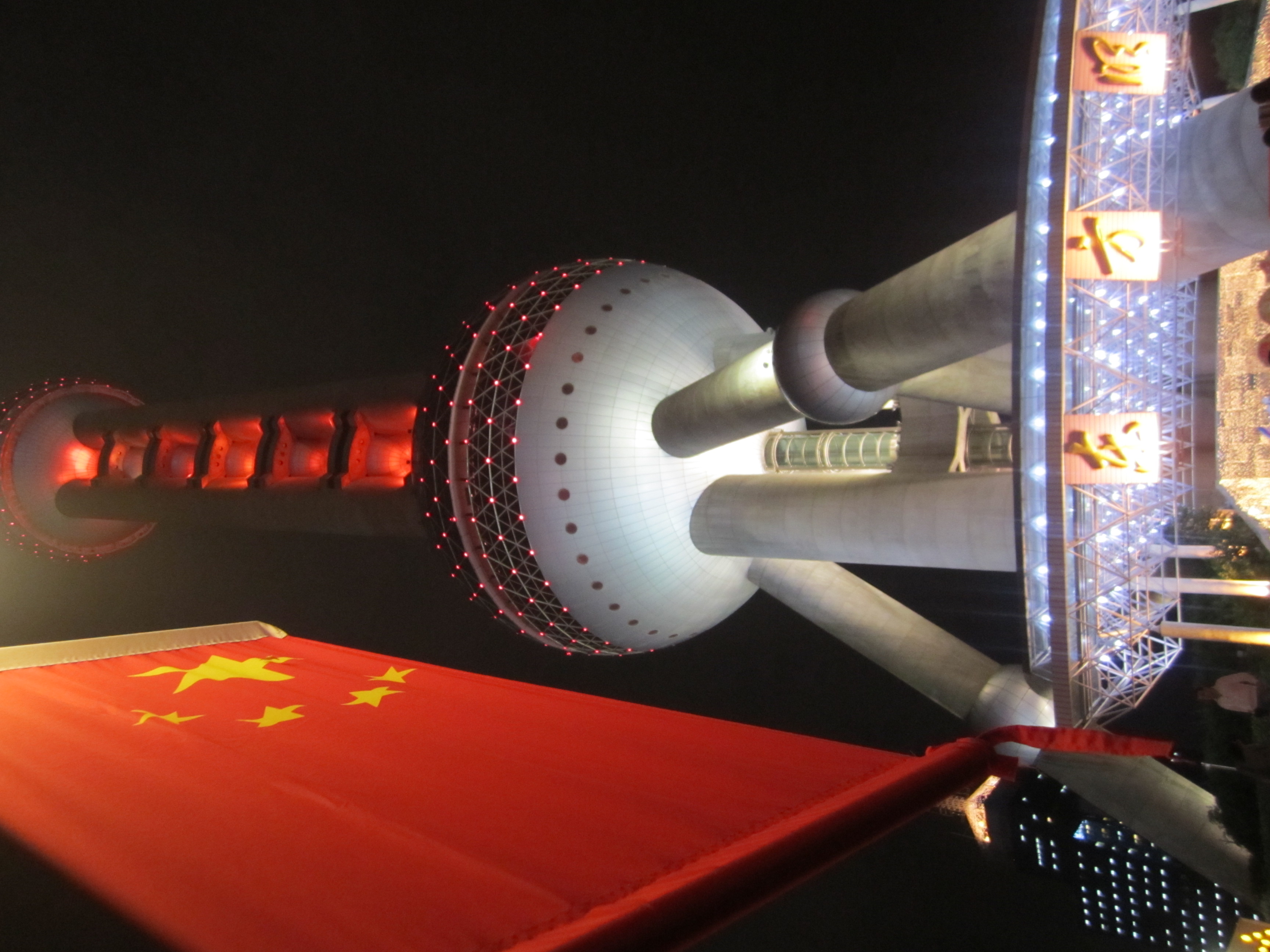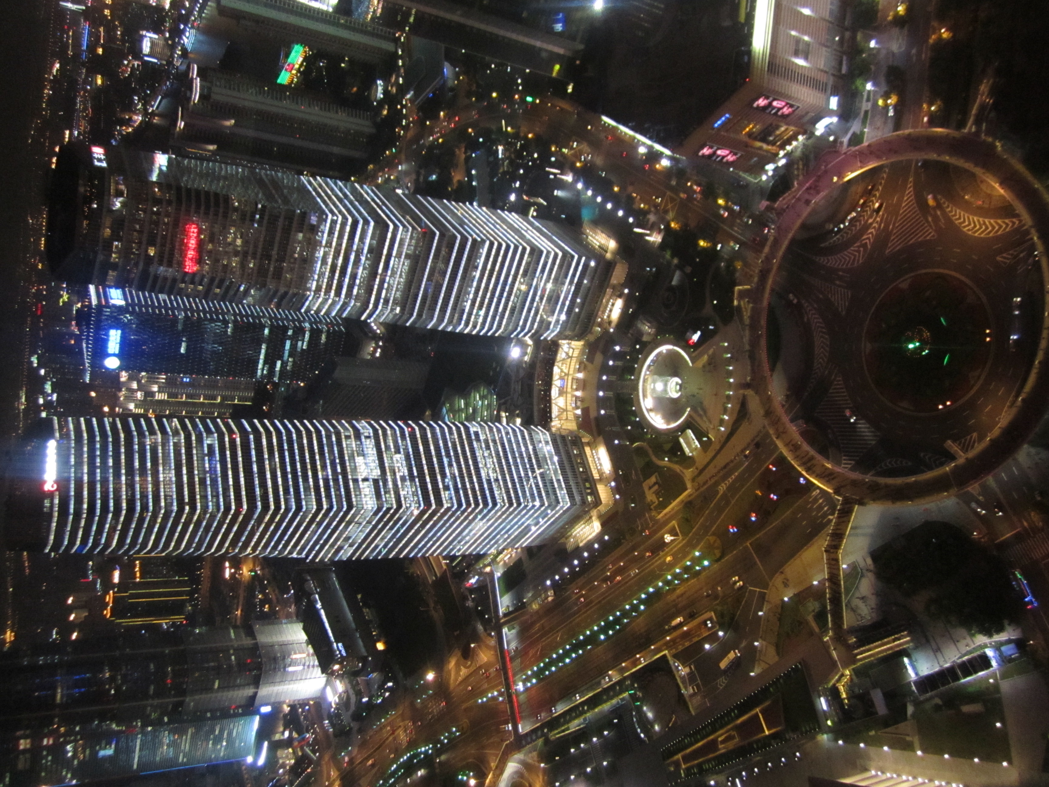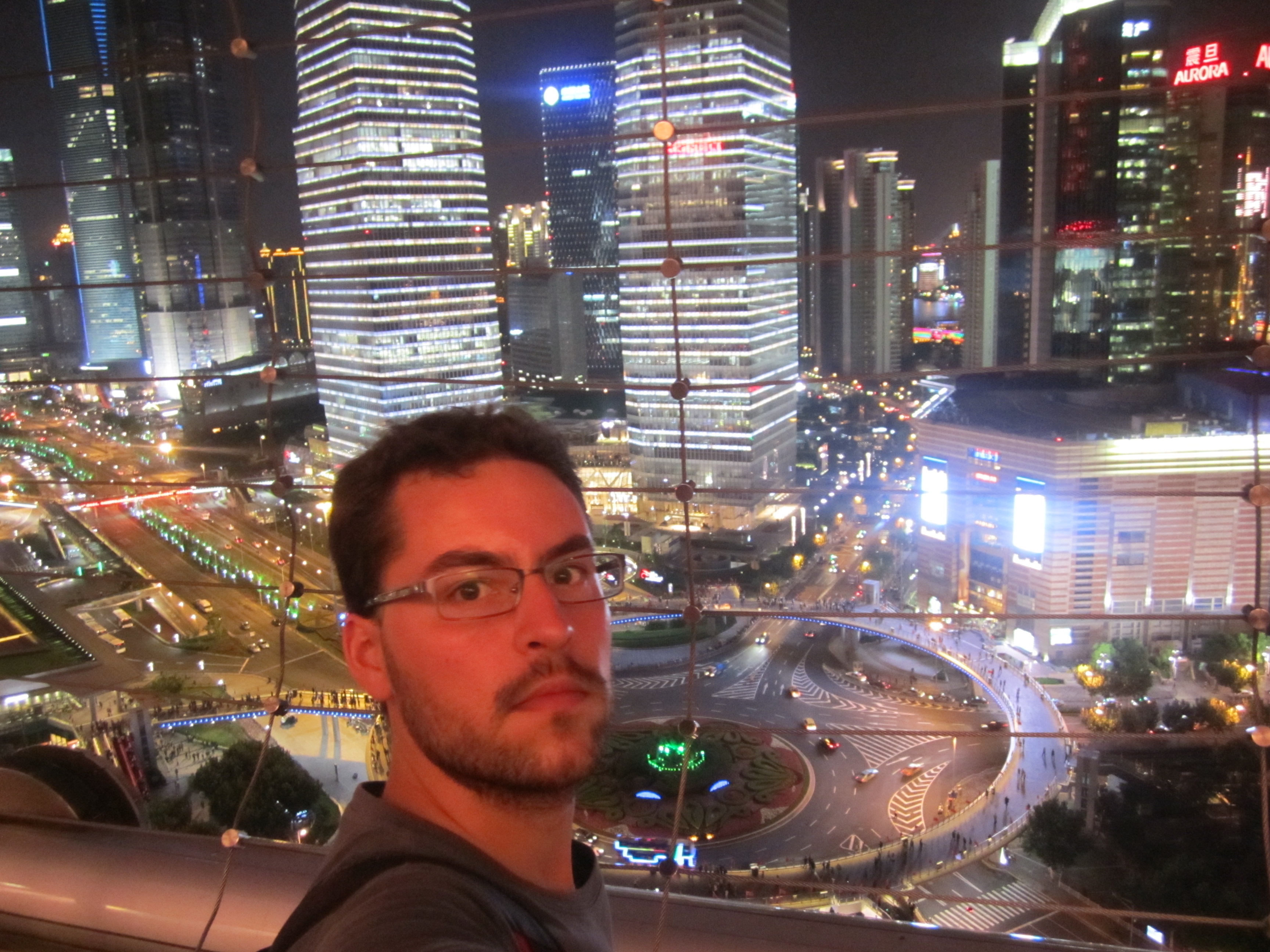 Le soir, je suis revenu pour aller voir l'Oriental Tower, la 3eme plus haute tour de TV et radio au monde (468m). Elle ressemble à une espèce d'immense aiguille à tricoter en béton gris, avec une haute tige verticale à laquelle s'accrochent 2 grosses boules avec des baies vitrées de couleur rose et une 3eme boule, plus petite, au pied de la flèche finale. Idéal pour voir tout le Bund de nuit. Il y a grosso-modo 3 niveaux pour profiter de la vue. Tout en haut, mais une vitre est présente. Au milieu, pour prendre une photo sur le sol en verre. Et enfin, un peu plus bas où l'on est plus ou moins à l'air libre.