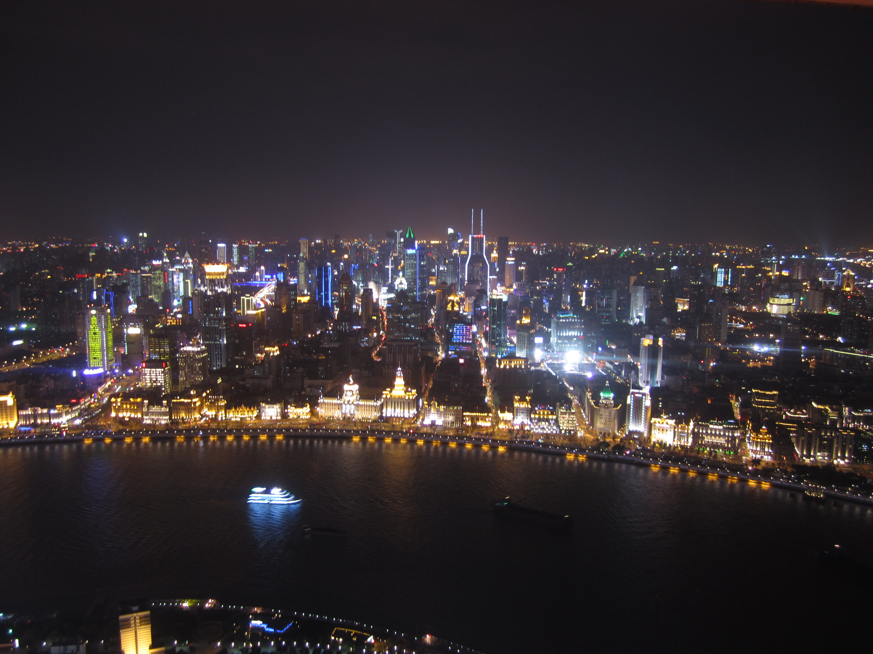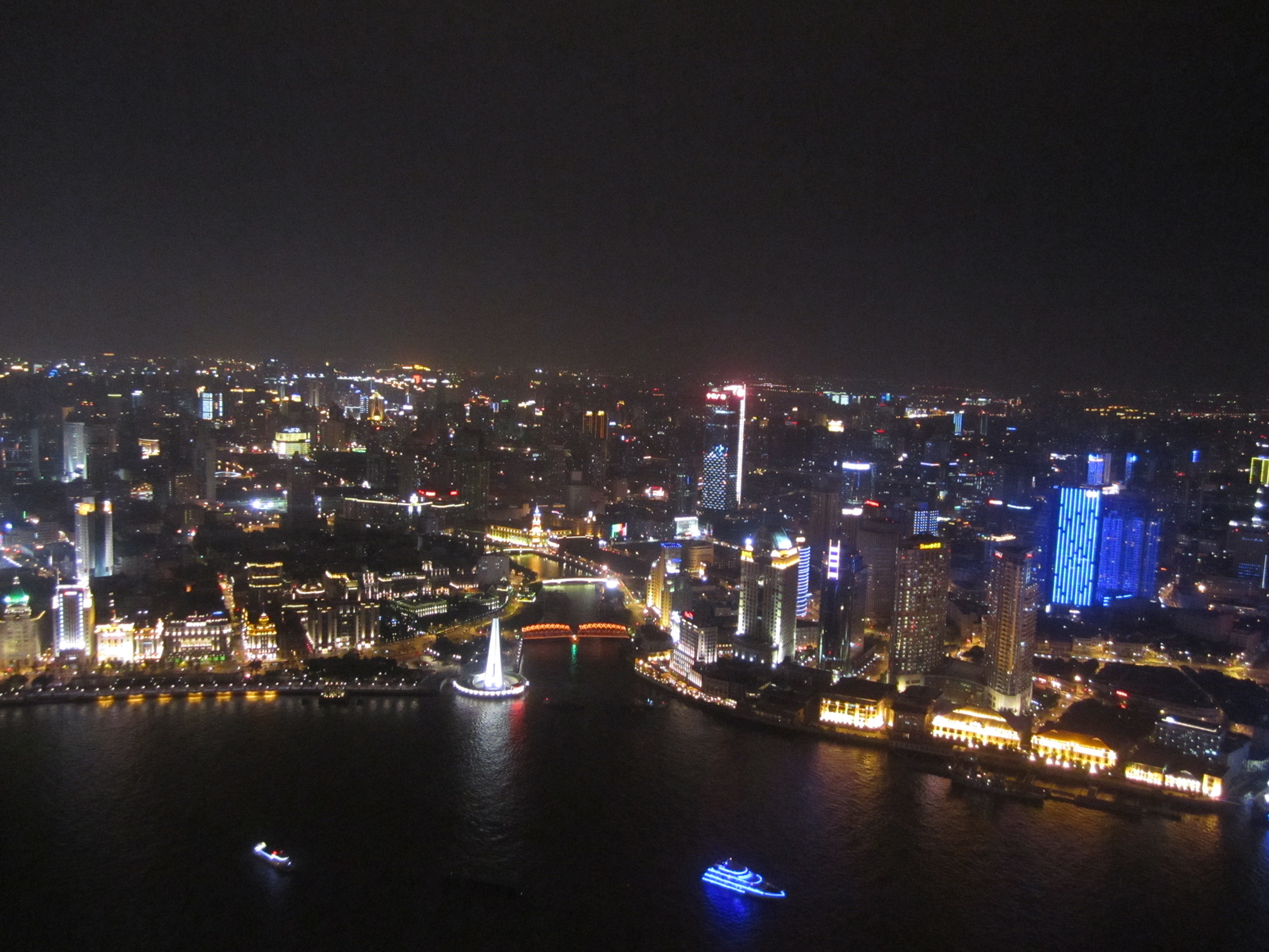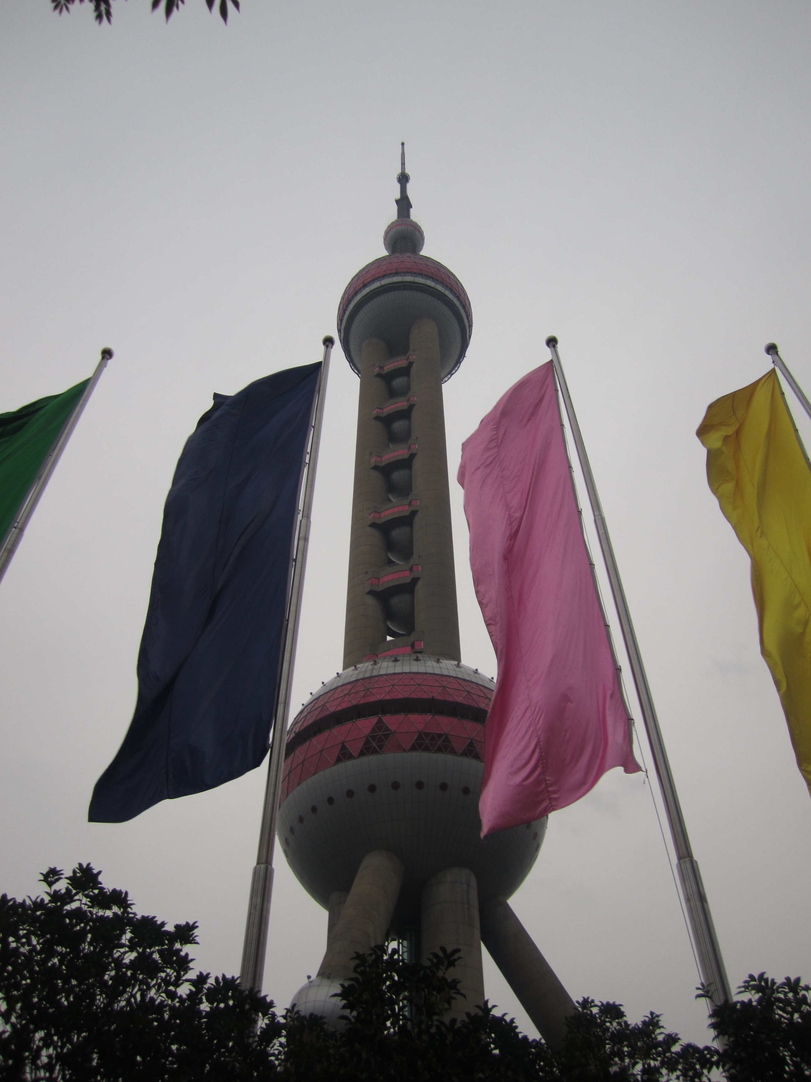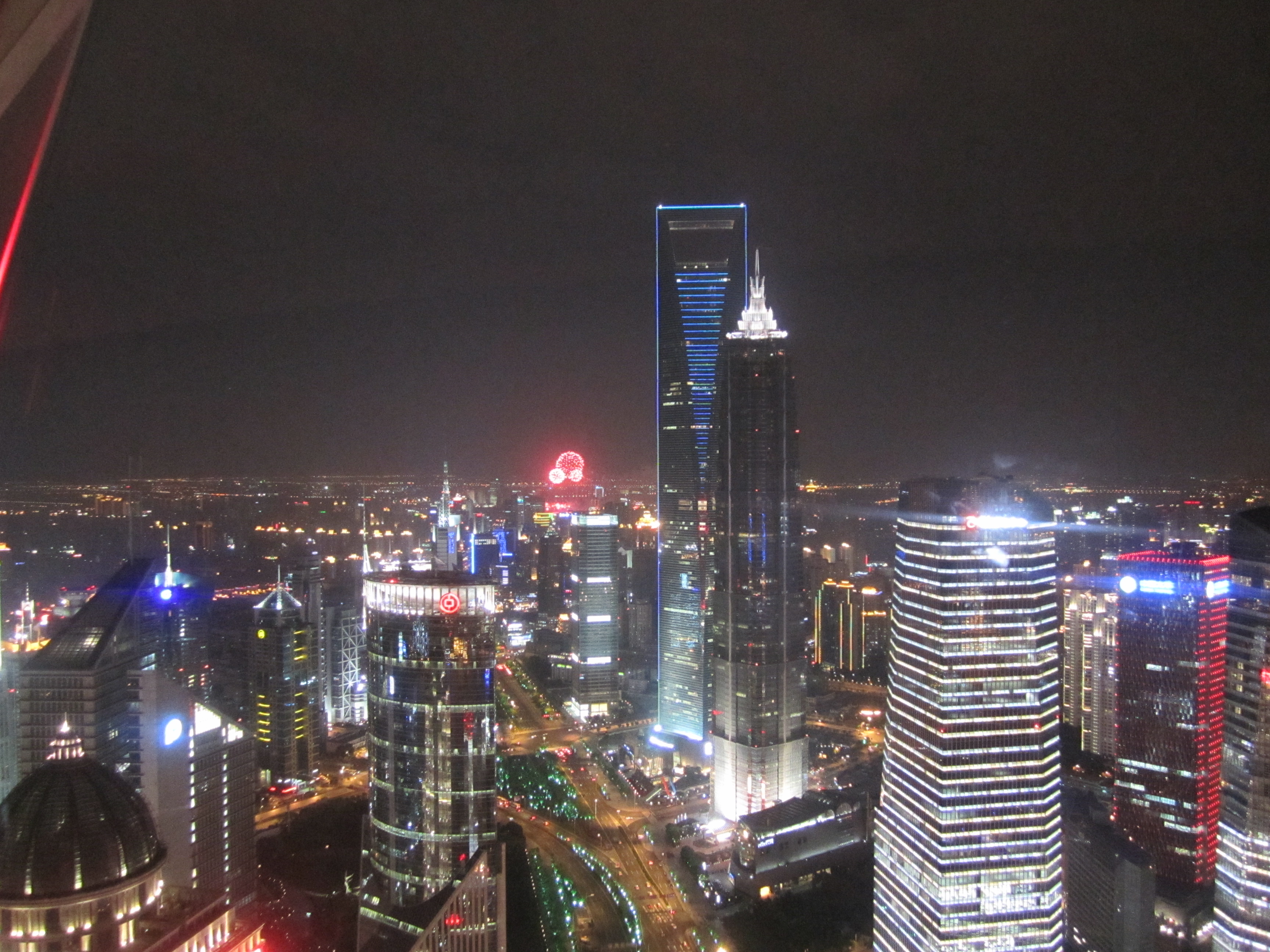 Le soir, je suis revenu pour aller voir l'Oriental Tower, la 3eme plus haute tour de TV et radio au monde (468m). Elle ressemble à une espèce d'immense aiguille à tricoter en béton gris, avec une haute tige verticale à laquelle s'accrochent 2 grosses boules avec des baies vitrées de couleur rose et une 3eme boule, plus petite, au pied de la flèche finale. Idéal pour voir tout le Bund de nuit. Il y a grosso-modo 3 niveaux pour profiter de la vue. Tout en haut, mais une vitre est présente. Au milieu, pour prendre une photo sur le sol en verre. Et enfin, un peu plus bas où l'on est plus ou moins à l'air libre.