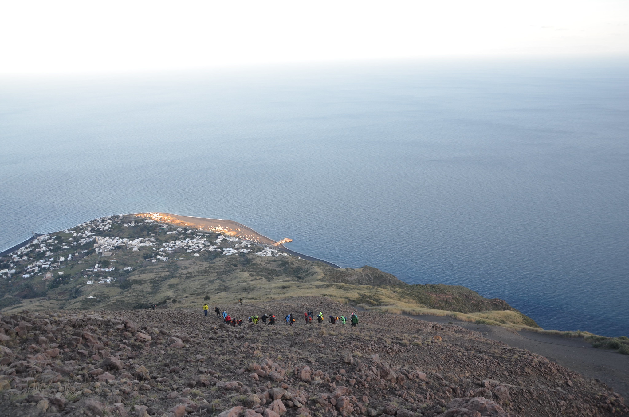 La première partie de l'ascension est plutôt simple. Le sentier quitte rapidement le village et prend de la hauteur, tout en restant encore dans la forêt. Une fois arrivés sur un terrain plus desertique et volcanique, il est temps de grignoter un peu et surtout de nous couvrir. Le village en contrebas passe peu à peu dans l'ombre du volcan et la petite île de Strombolicchio, face au village, nous regarde. Elle serait d'ailleurs l'ancien cratère du Stromboli, mais c'était il y a 300 000 ans.