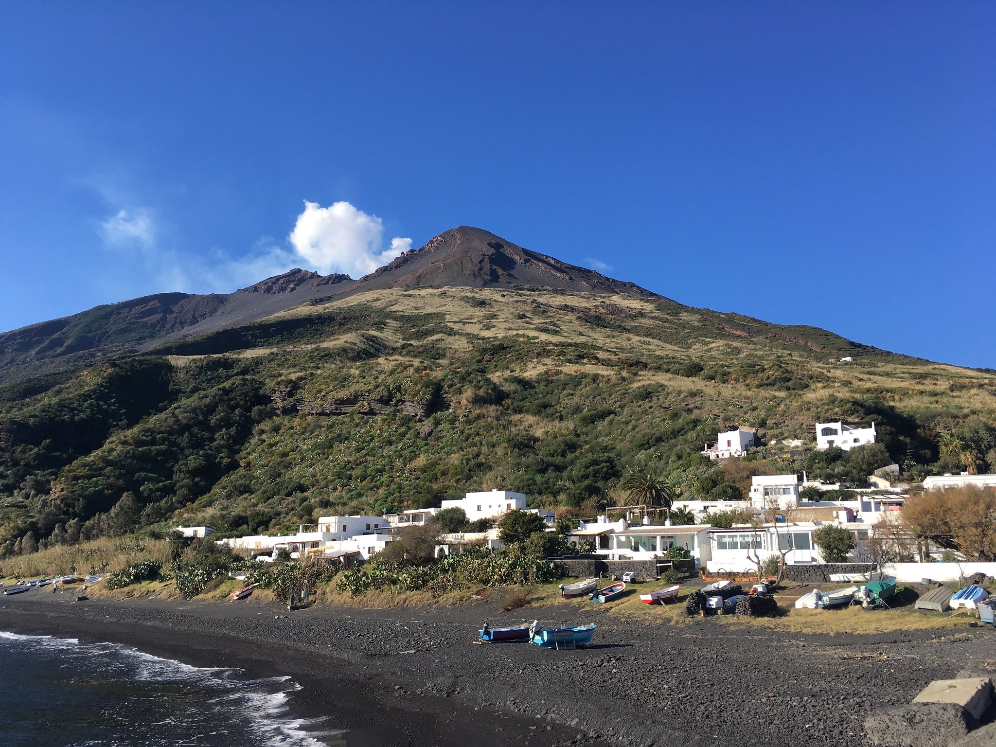 A l'approche de notre terminus, le Stromboli s'affirme. Une petite fumée blanche s'échappe en continue du cratère. L'hydroglisseur fait une première halte au sud-ouest de l'île, dans l'un des deux villages de l'île, Ginostra. Stromboli (qui est aussi le nom du principal village) est situé au nord-est. Aucune route ne relie les deux villages, seulement des sentiers de randonnées, puisque le Stromboli déverse sa lave sur deux flans : le flan nord-ouest et le flan sud-est, séparant l'île en deux.