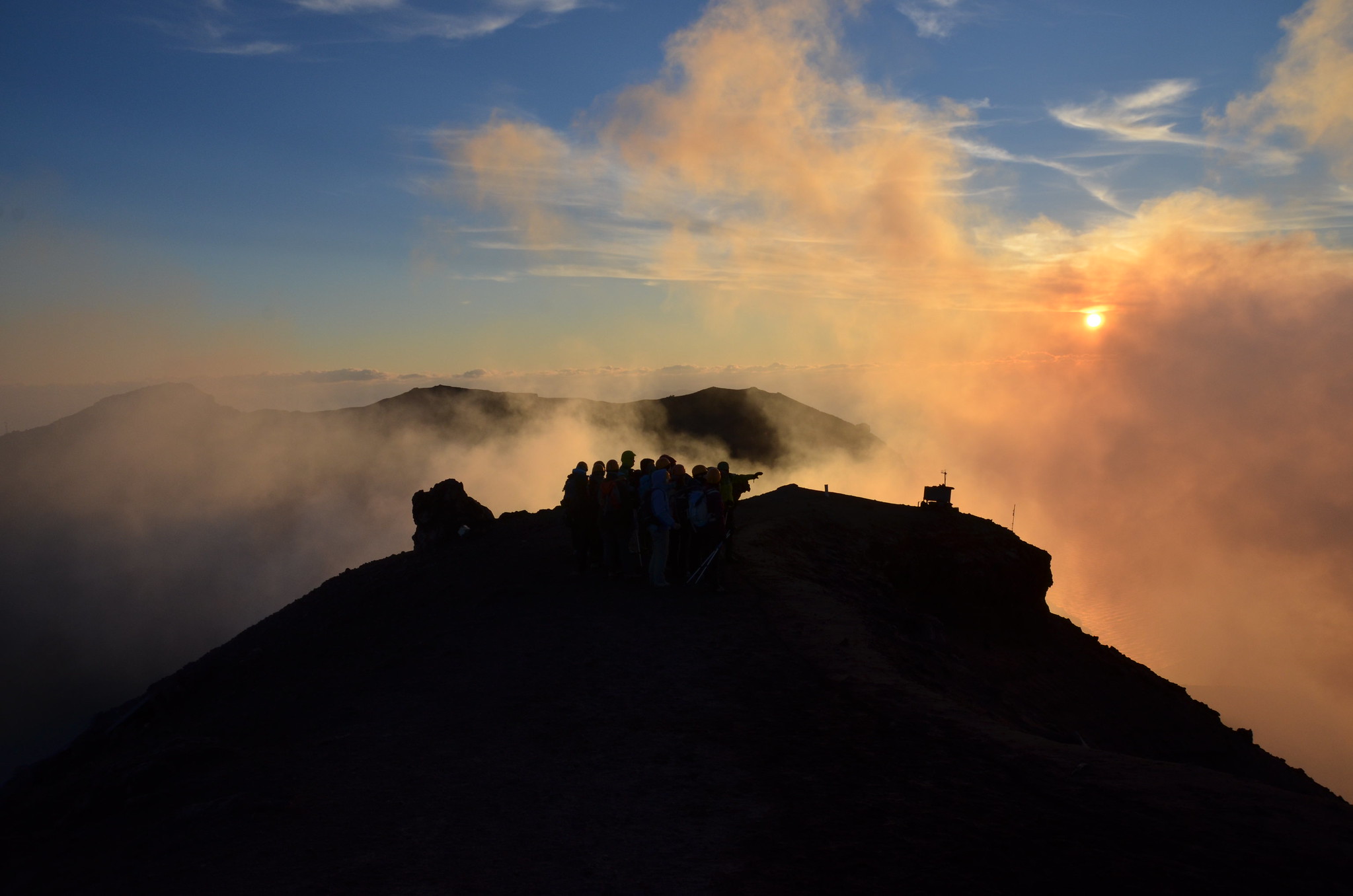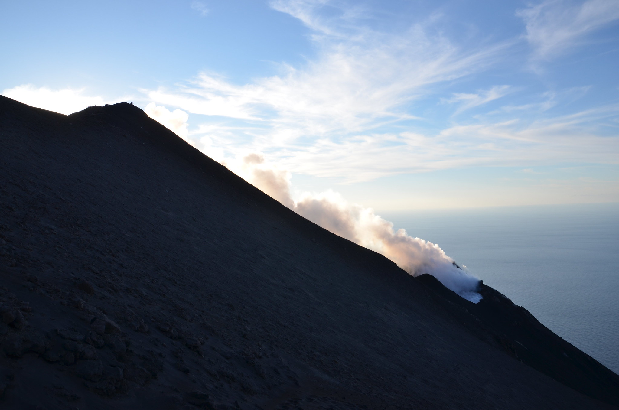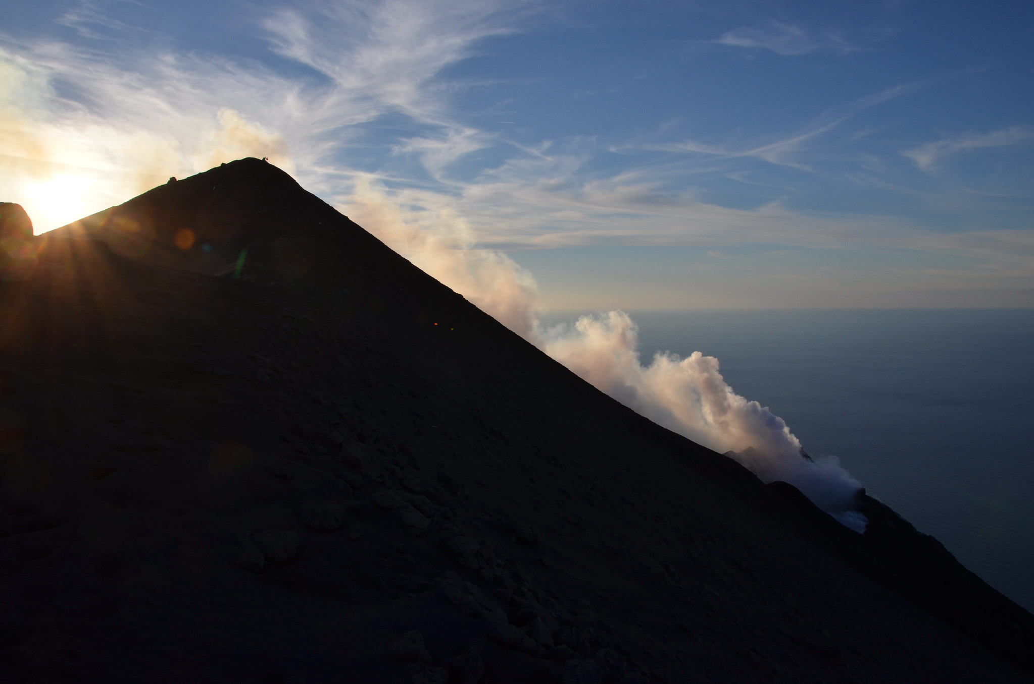 Les derniers mètres se font sur une crête et nous voilà arrivés sur un petit plateau dominant toute l'île. En contre bas, le cratère actuel crache sa fumée et fait de gros brouhahas toutes les 10 minutes environ. Des fois même, des lueurs rougeâtres font leur apparition. Malheureusement pour nous, le vent n'est pas dans le bon sens aujourd'hui. Les fumées viennent vers nous, il sera difficile d'avoir une belle visibilité sur le cratère et les jets de lave. La vue au sommet est magnifique, le coucher de soleil avec quelques nuages d'un côté, les bourrasques de fumée de l'autre et l'ombre géante du volcan dans la mer.