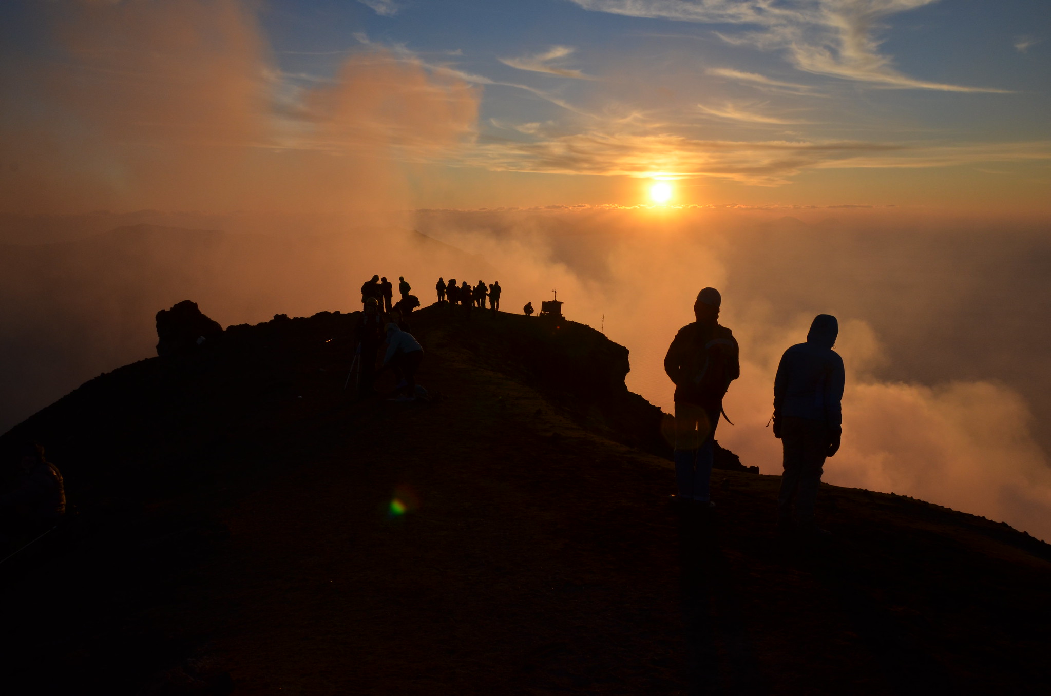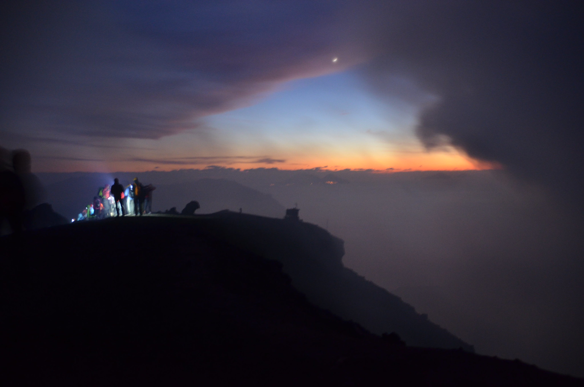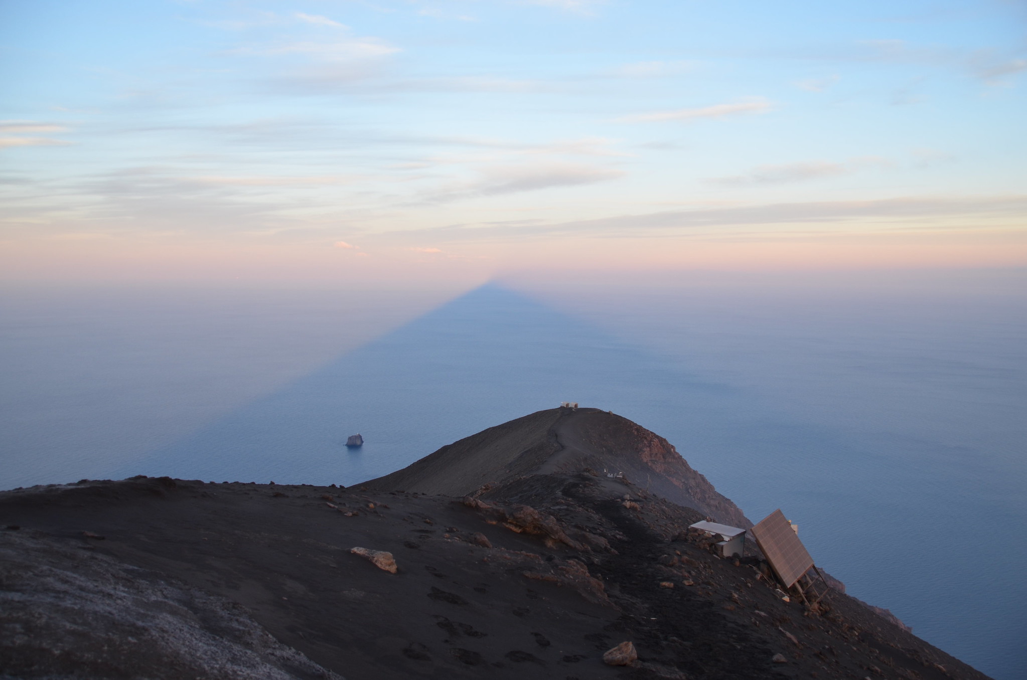 Les derniers mètres se font sur une crête et nous voilà arrivés sur un petit plateau dominant toute l'île. En contre bas, le cratère actuel crache sa fumée et fait de gros brouhahas toutes les 10 minutes environ. Des fois même, des lueurs rougeâtres font leur apparition. Malheureusement pour nous, le vent n'est pas dans le bon sens aujourd'hui. Les fumées viennent vers nous, il sera difficile d'avoir une belle visibilité sur le cratère et les jets de lave. La vue au sommet est magnifique, le coucher de soleil avec quelques nuages d'un côté, les bourrasques de fumée de l'autre et l'ombre géante du volcan dans la mer.
