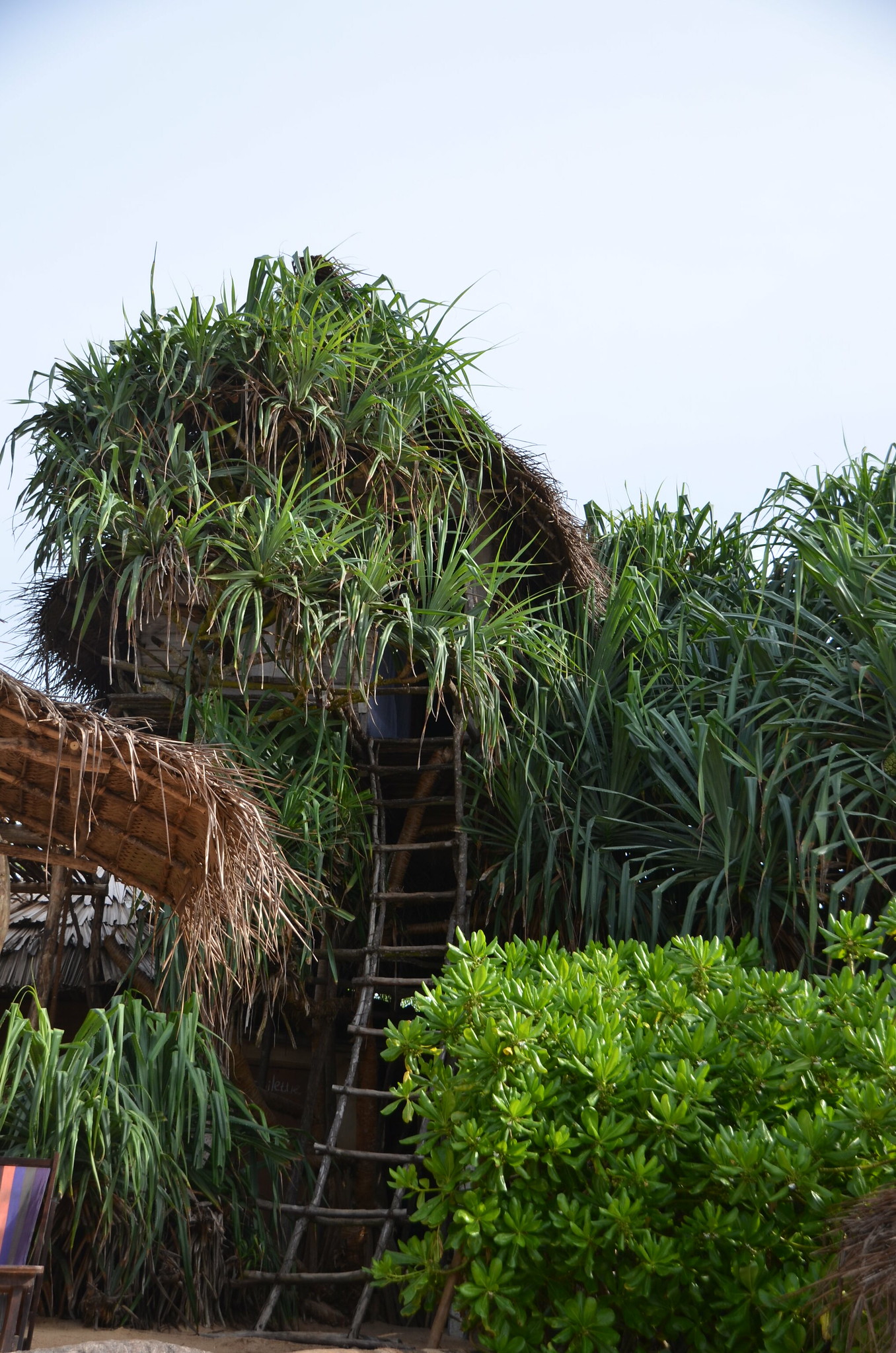 Le côté top de ce passage à Tangalle, c'était notre hôtel et surtout notre "chambre". Elsa a dégoté une cabane en haut d'un arbre en face de la plage. On y accède par une échelle bancale, une première petite pièce avec le lit et au fond, un peu en contre bas, la douche et les toilettes en (presque) dur. Le lieu est top. Par contre, avec la mer déchaînée jour et nuit, c'est pas simple de dormir la nuit (surtout quand Elsa pense qu'un tsunami peut arriver pendant la nuit, mais c'est peut-être une idée que je lui ai mise dans la tête :)).