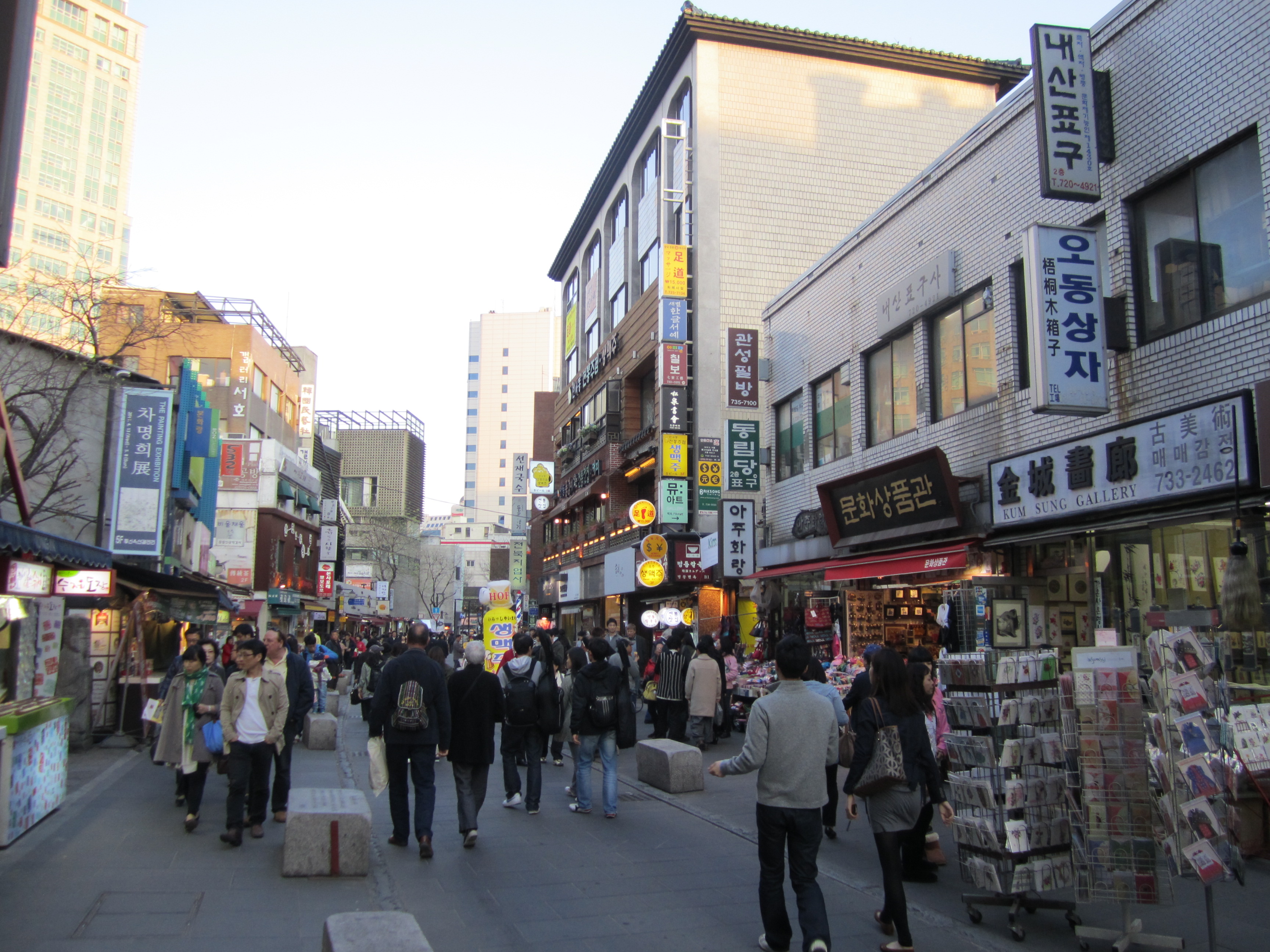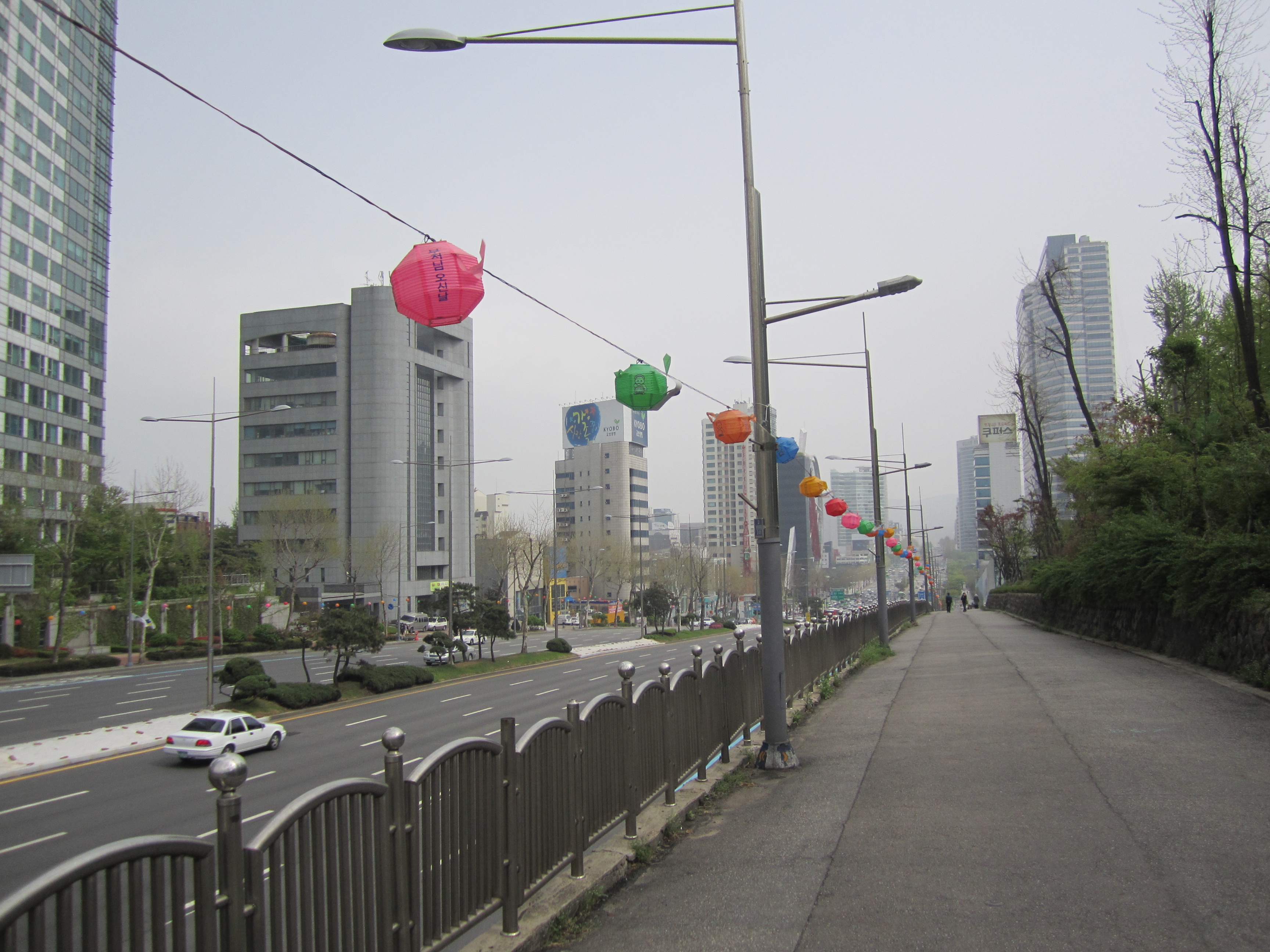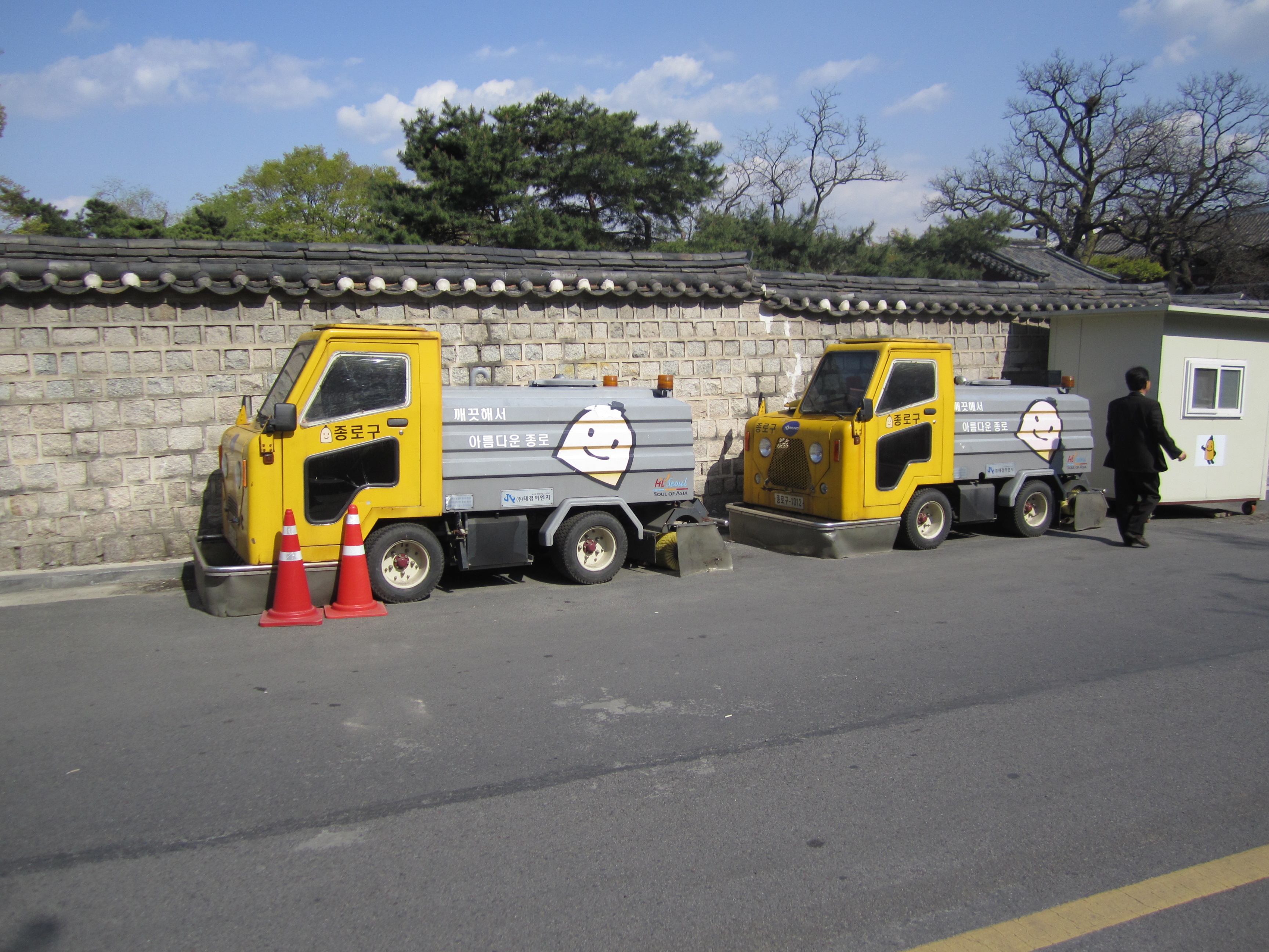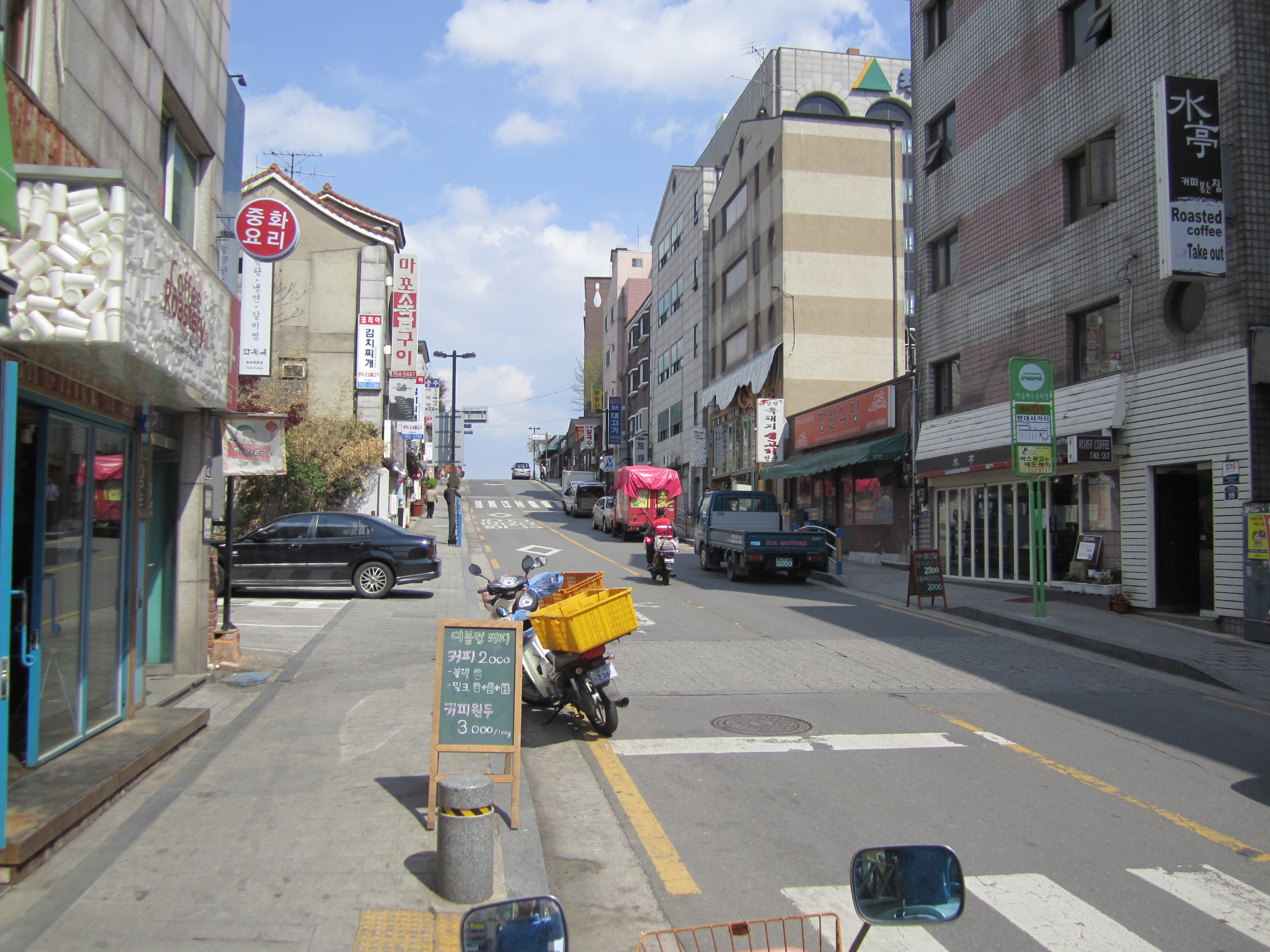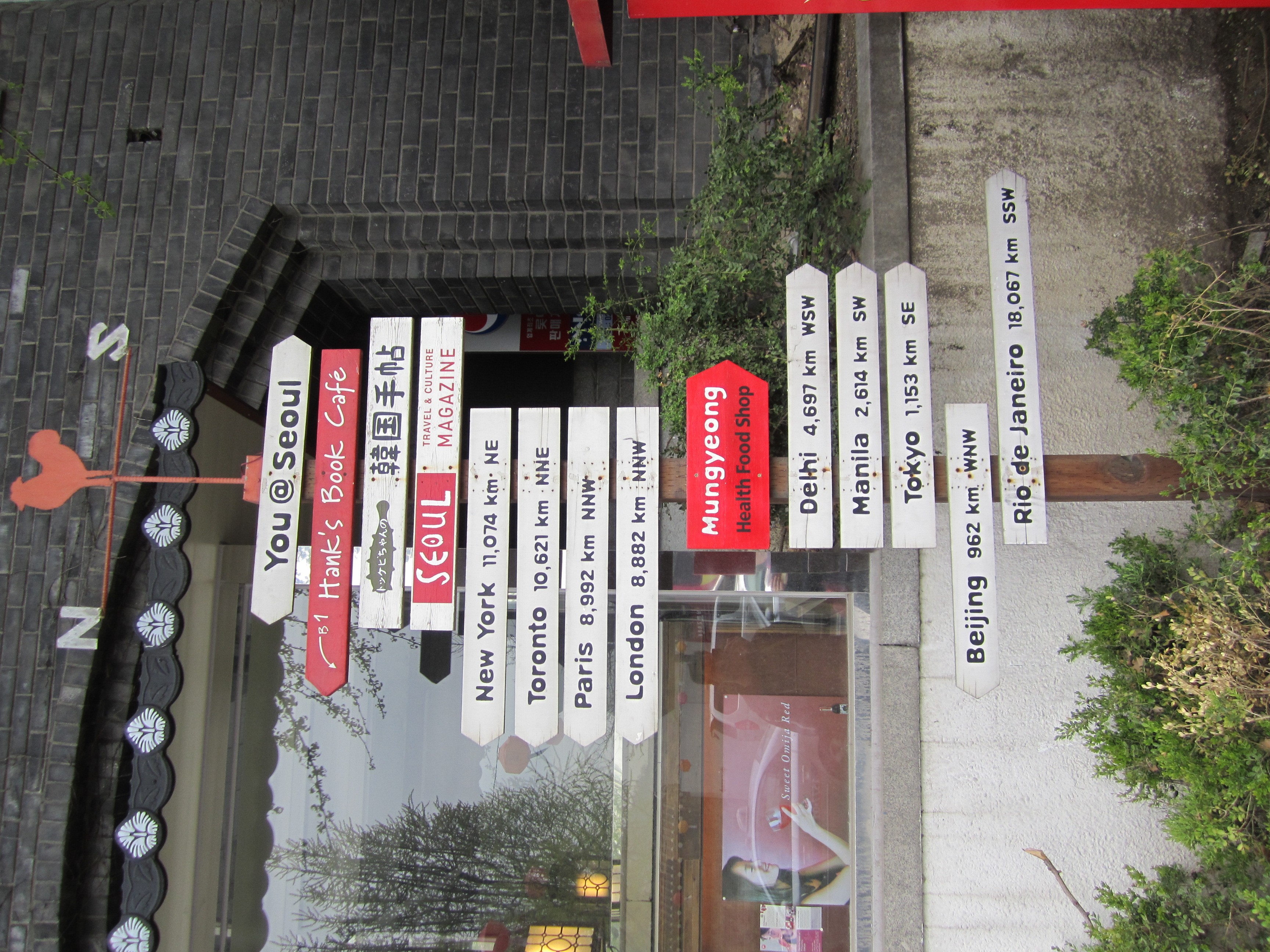 Notre guesthouse se trouve au Nord de Séoul. Les petites ruelles, les rues vallonnées et les montagnes toutes proches nous font oublier que nous sommes dans une capitale. On est bien loin des énormes avenues quadrillées de Pékin ! Dans le centre, il y a un peu plus de grands boulevards. La circulation et la conduite sont beaucoup plus proches de celles qu'on trouve en Europe. Absence de tous klaxons et personne ne grille le feu pour tourner à droite. Les taxis ressemblent aux taxis parisiens: gris, blanc ou noir. Loin des couleurs unis des différentes villes de Chine ou des multicolores de Bangkok.