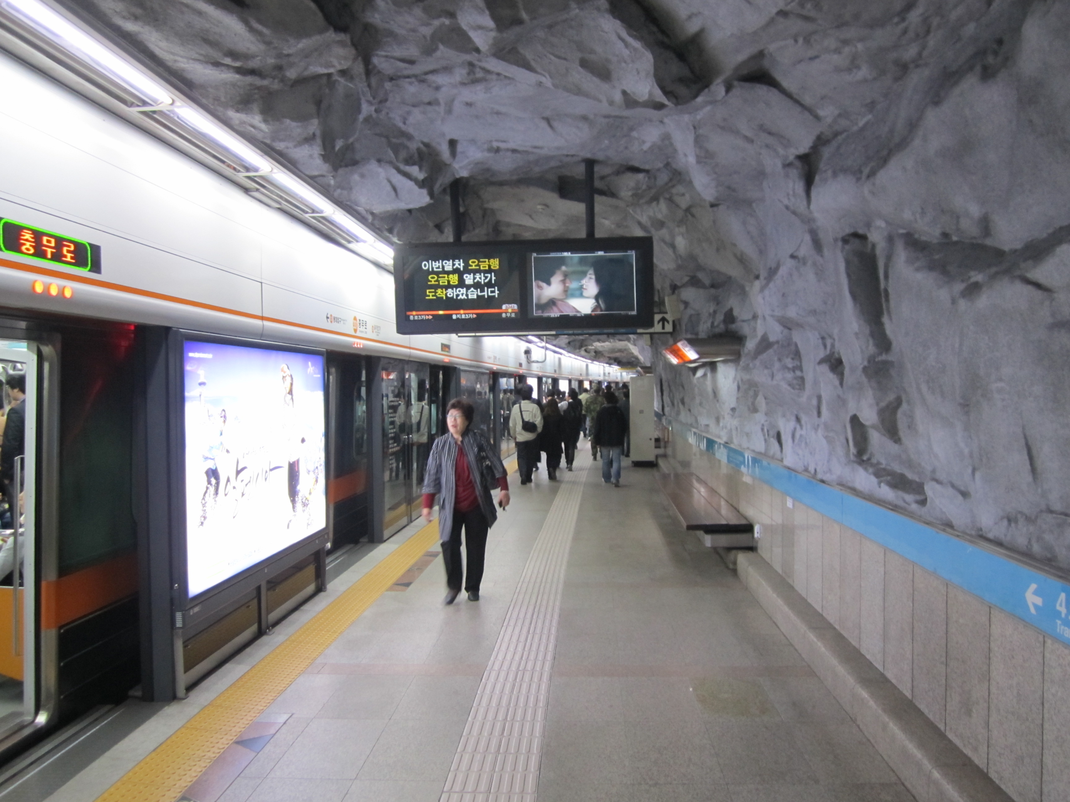 Le métro, quant à lui, à tout d'un métro asiatique: large, entièrement climatisé et bourré de pubs. La civilité des coréens est exemplaire. En file indienne, il n'y a pas de bousculades! Dingue .. mais tellement plus agréable (j'ai vu la même chose à Bangkok).